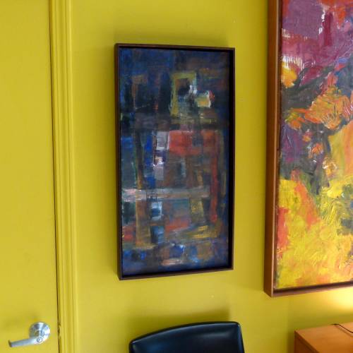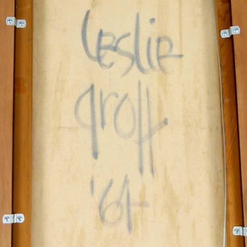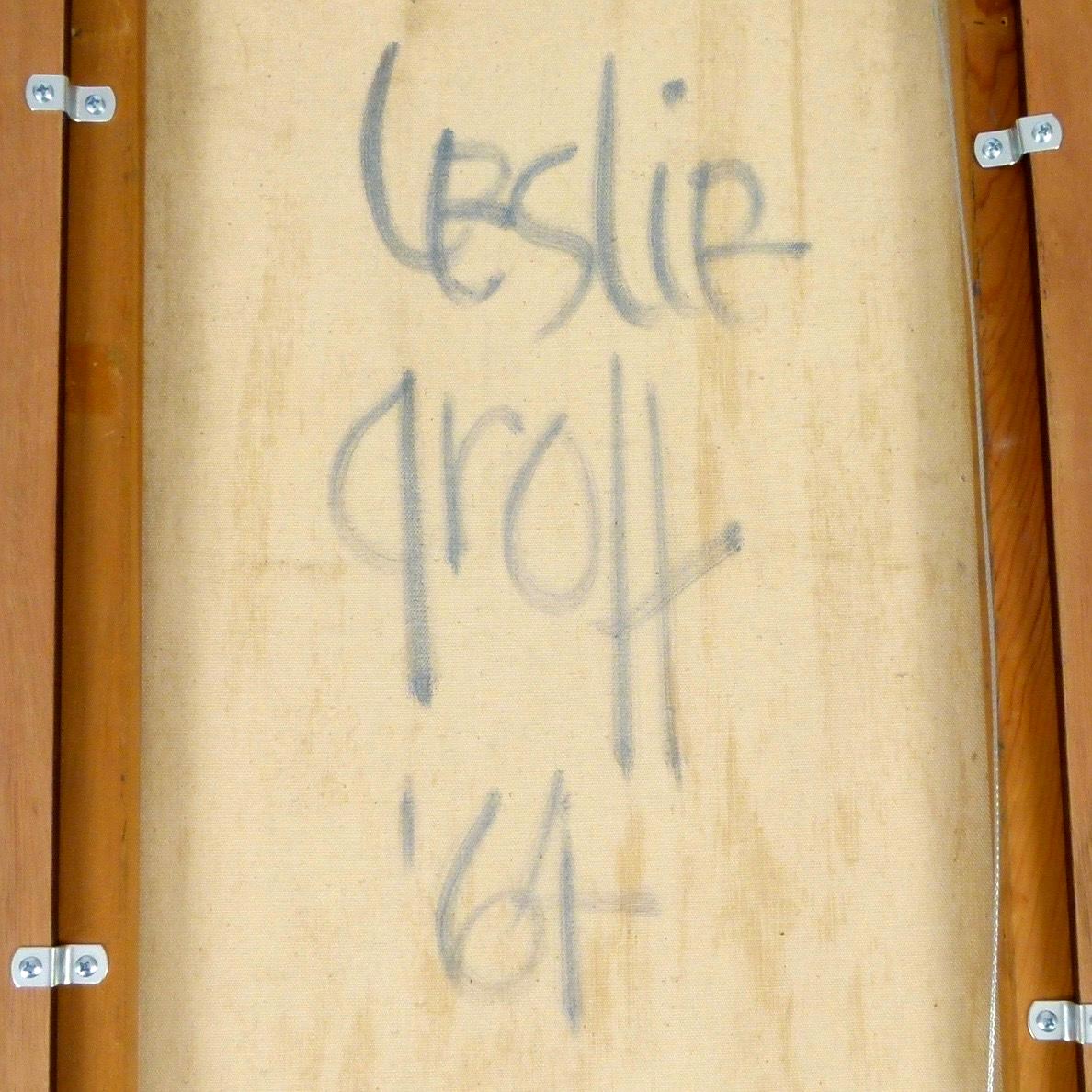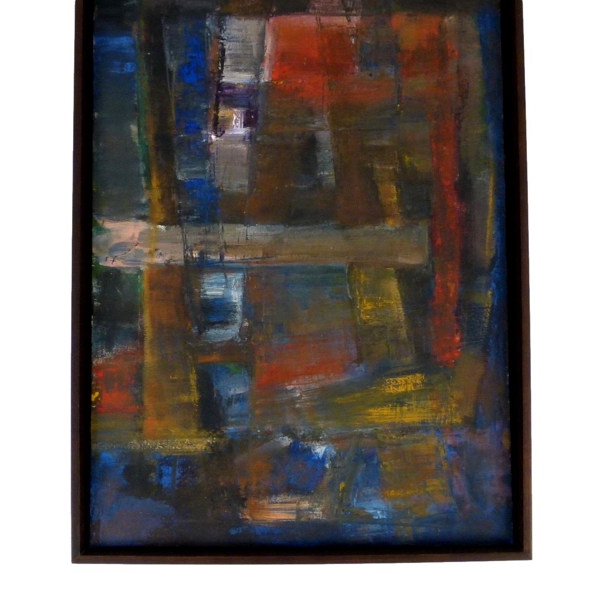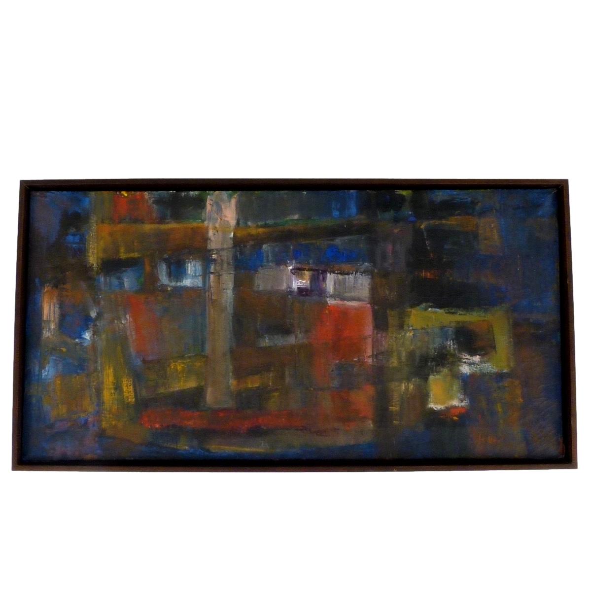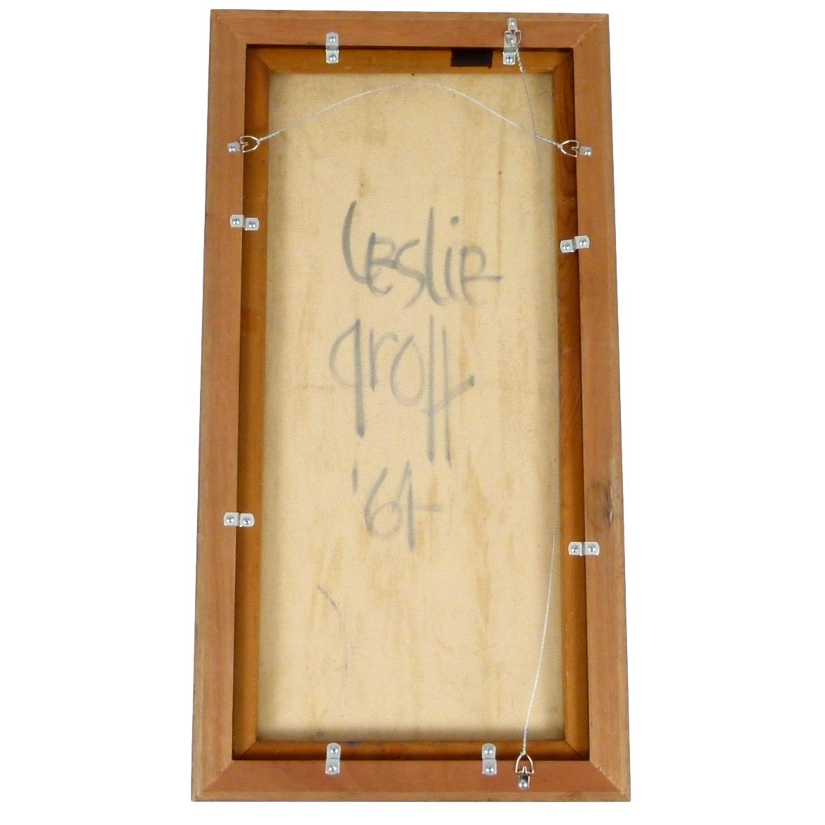 1964 abstract oil on canvas by Leslie Grolt. New framing. Wired to hang vertically or horizontally.