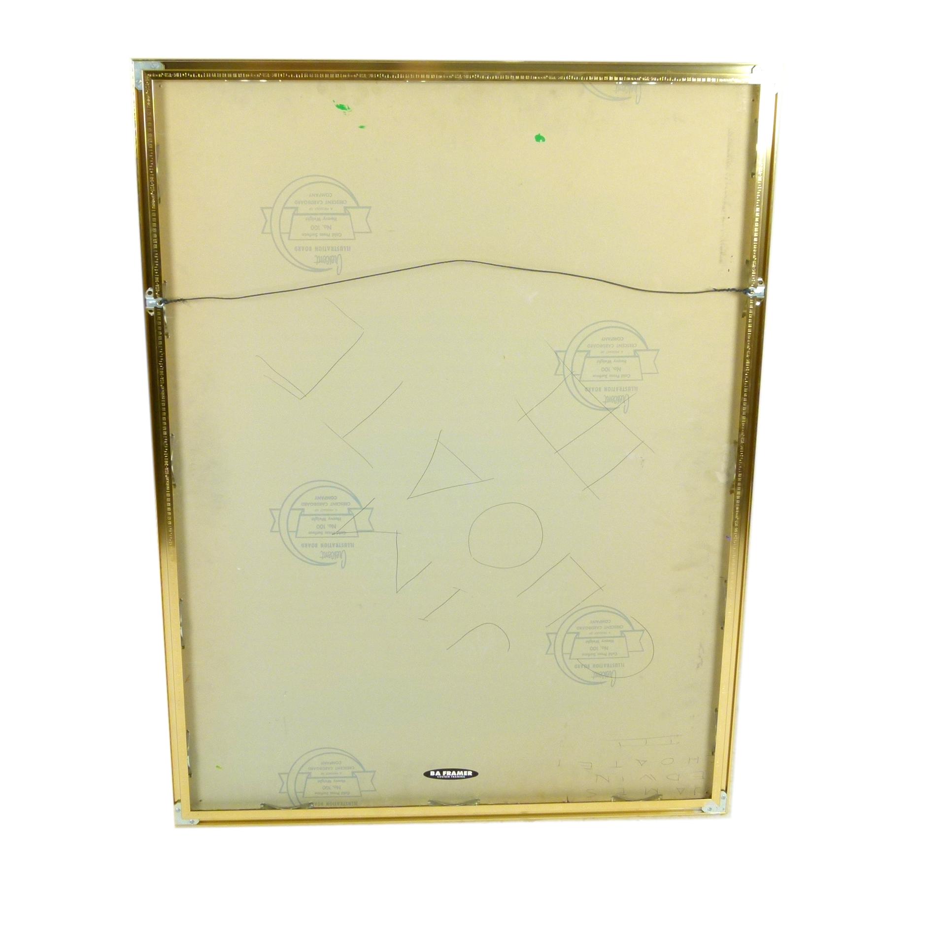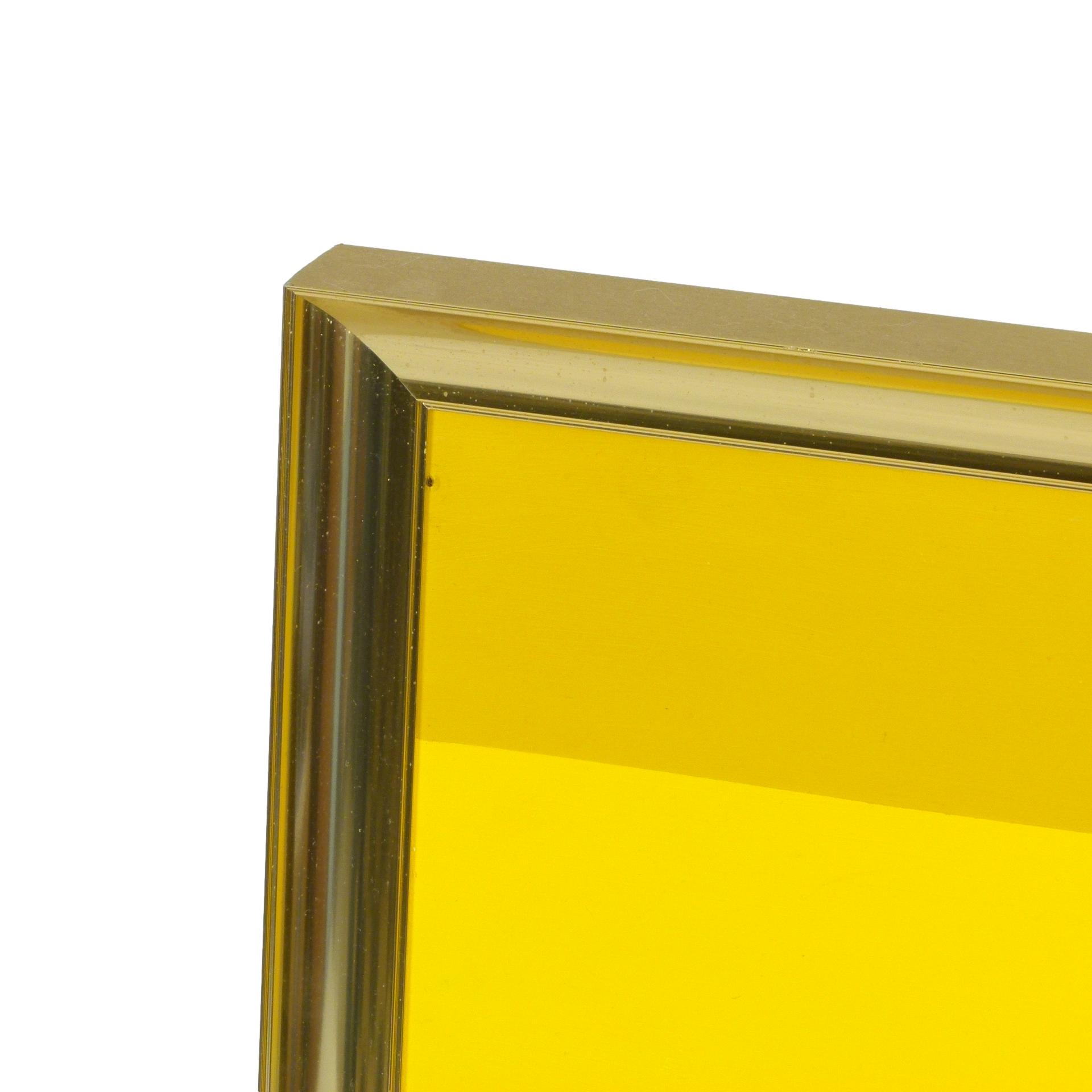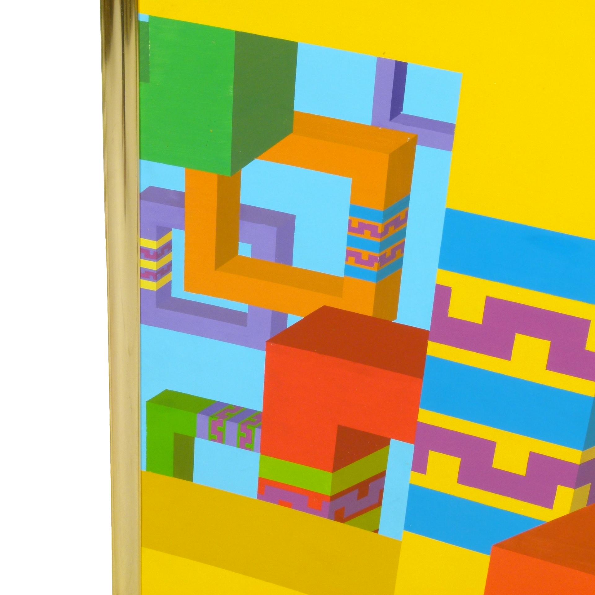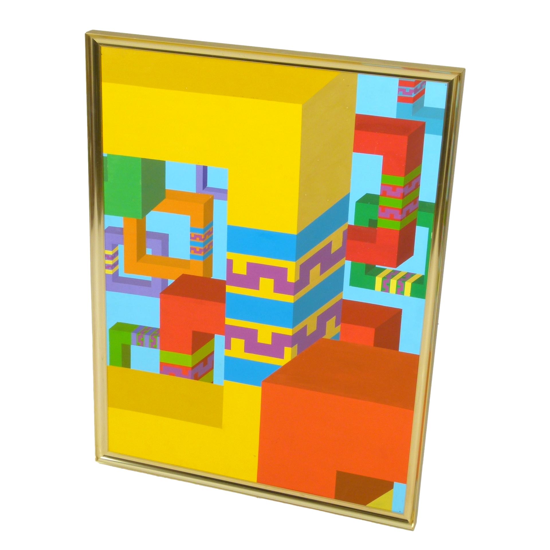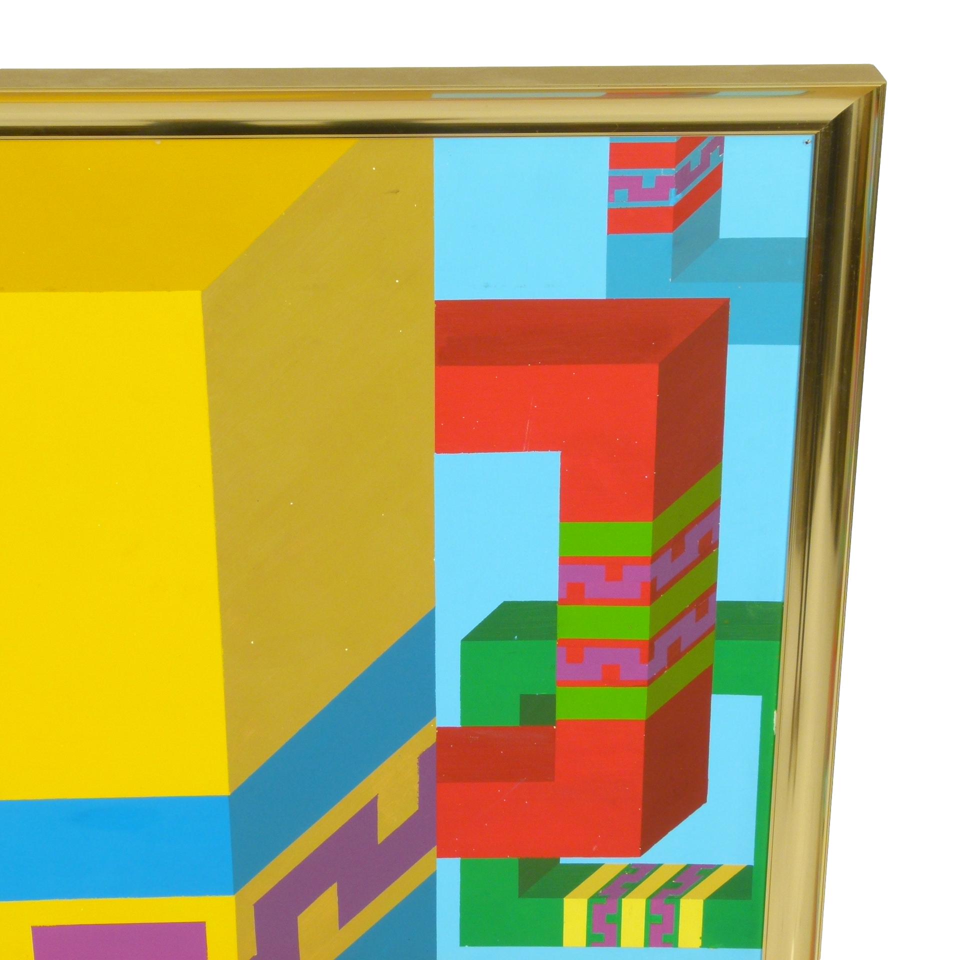 1970s geometric hard edge painting in brass frame signed Jim Choate III on reverse.