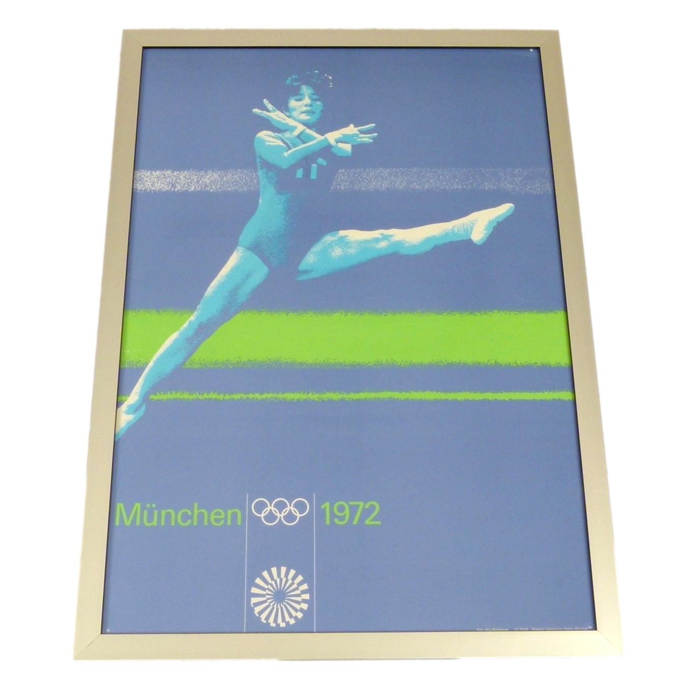 Original 1972 Gymnastics poster from the Summer Olympic Games in Munich, Germany by Max Muhlberger for Gerber- Munchen. New frame is black wood with a brushed metal front.