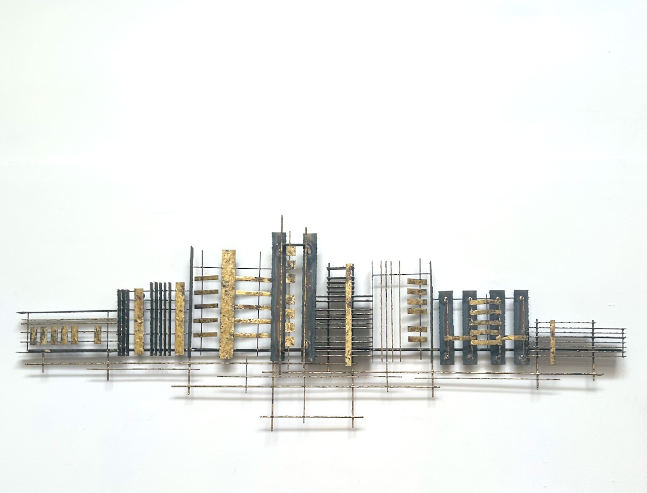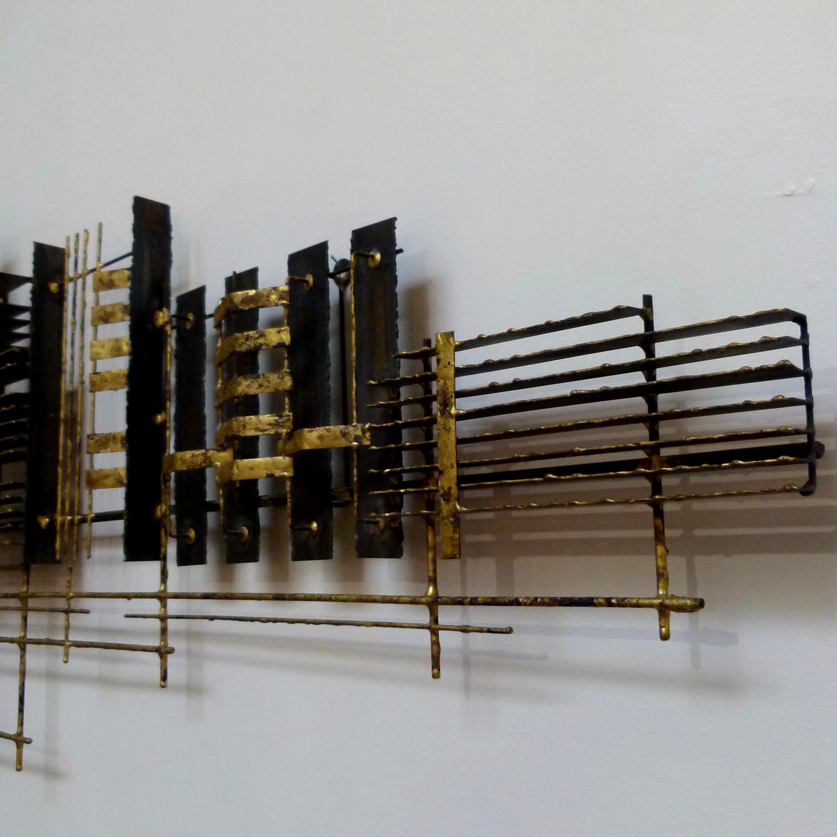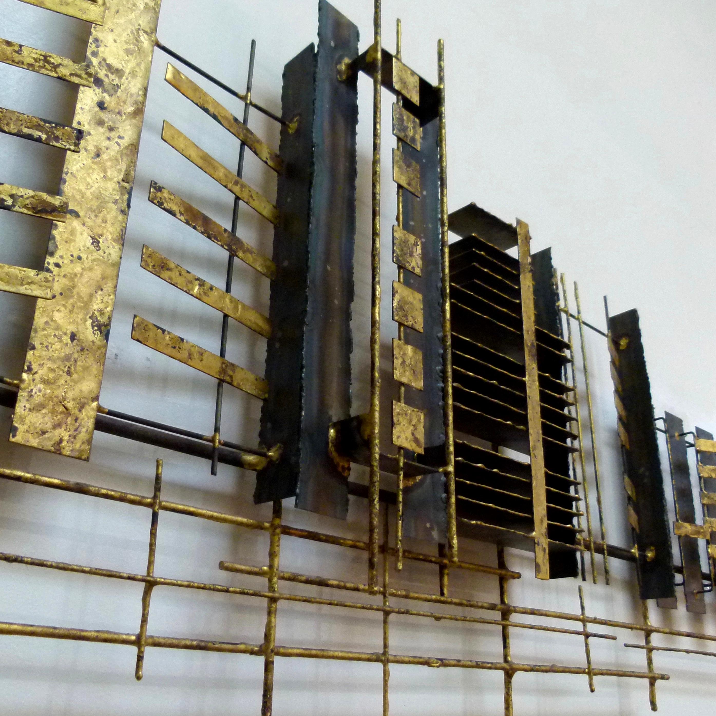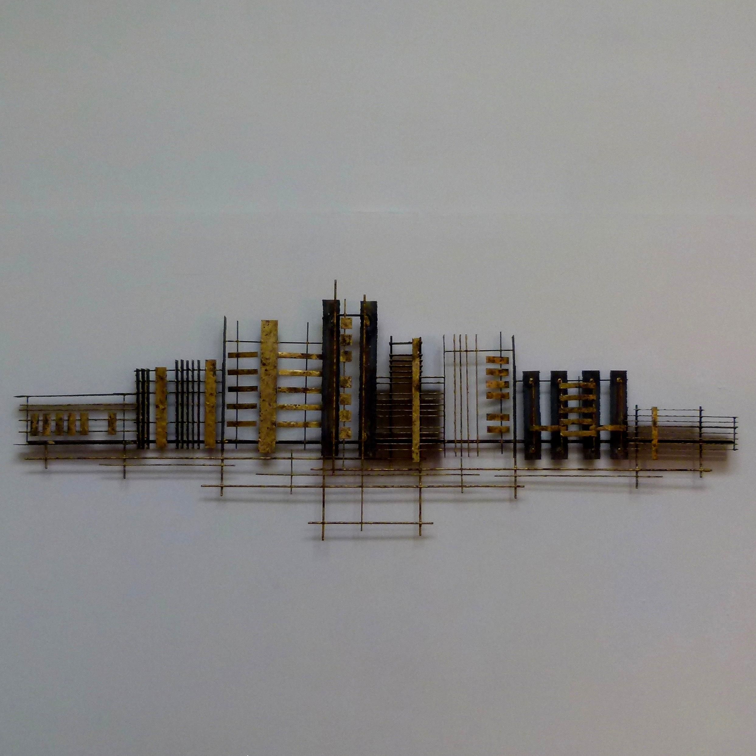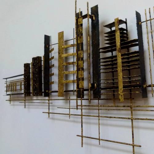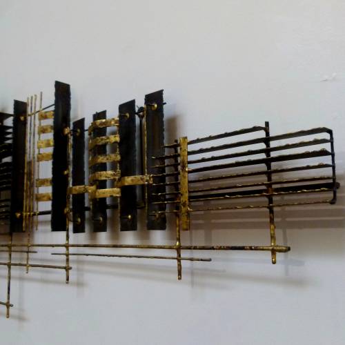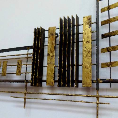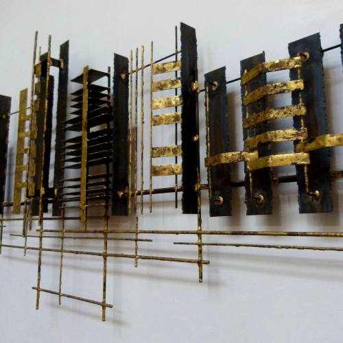 C.1970 abstract wall sculpture in steel and brass by Peter Pepper.