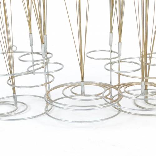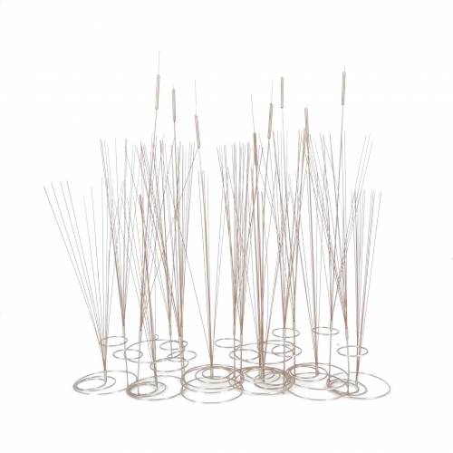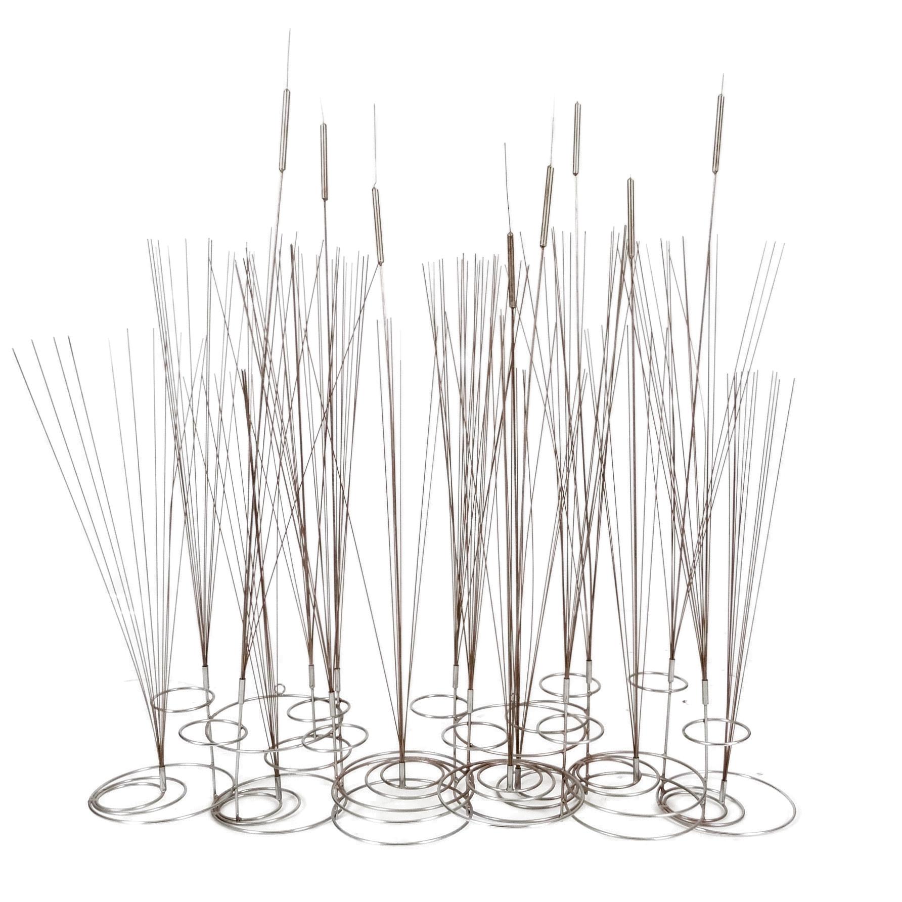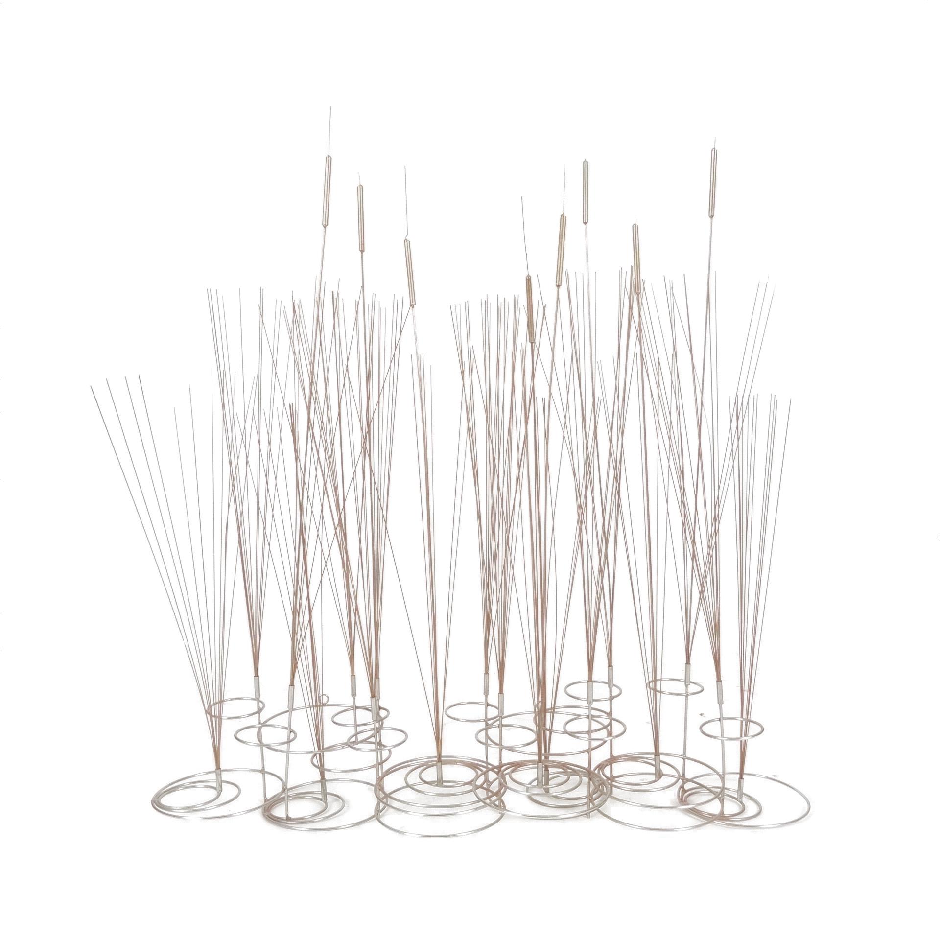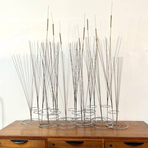 Striking mixed metal wall or freestanding Cattails sculpture by Curtis Jere', signed. Has 2 integrated rings on the back for hanging.
