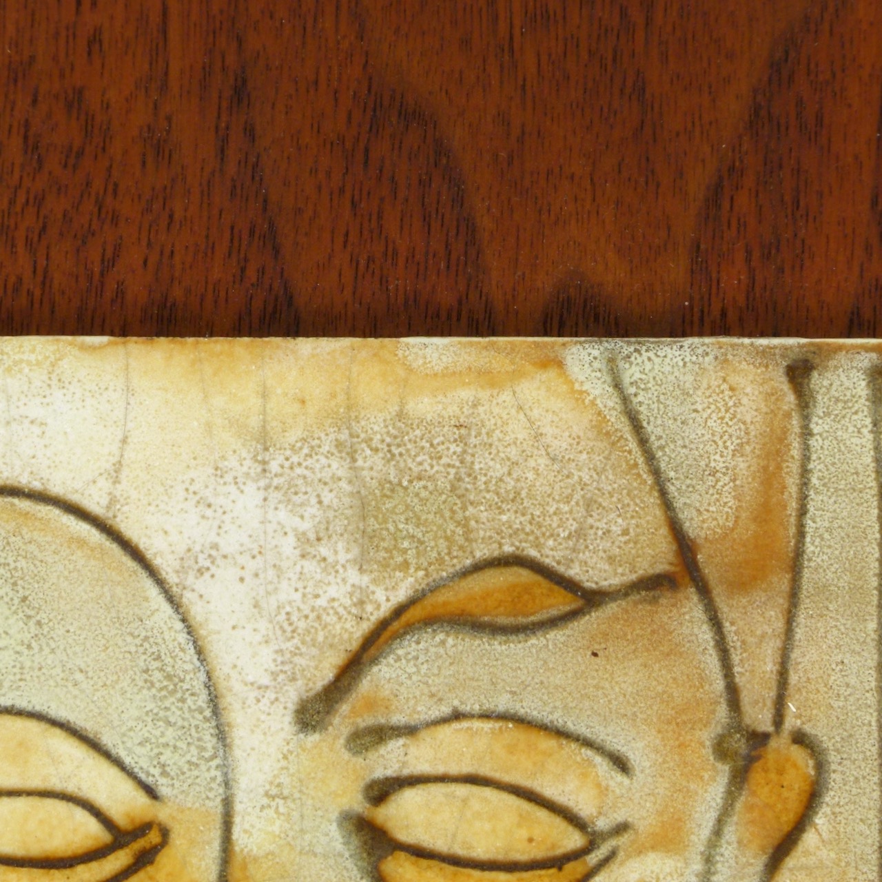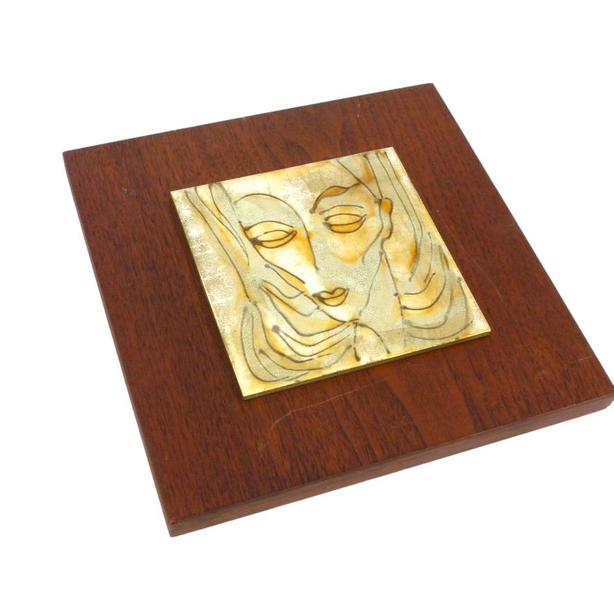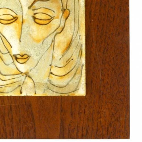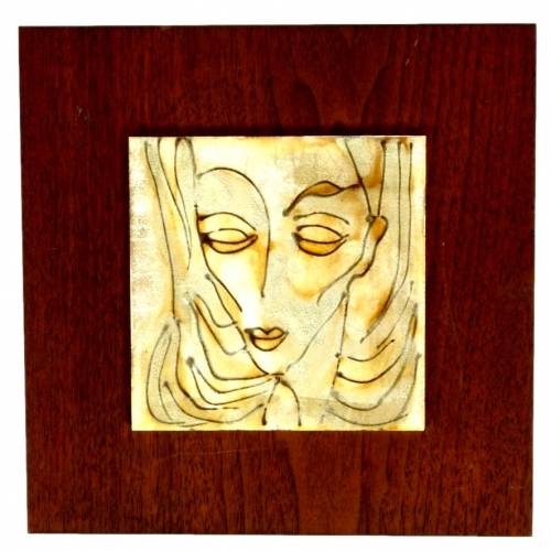 1960s Harris Strong hand glazed porcelain wall plaque portrait of a woman, mounted on walnut frame, 1960s.