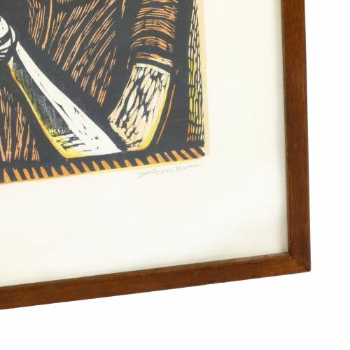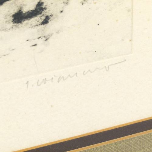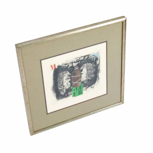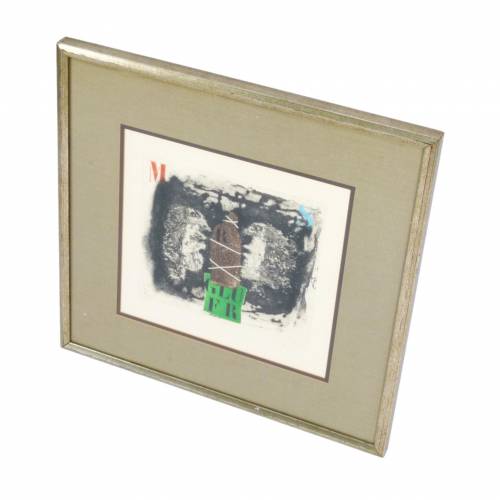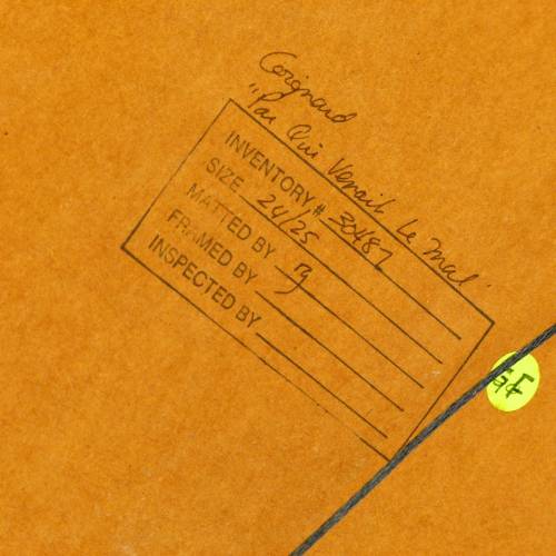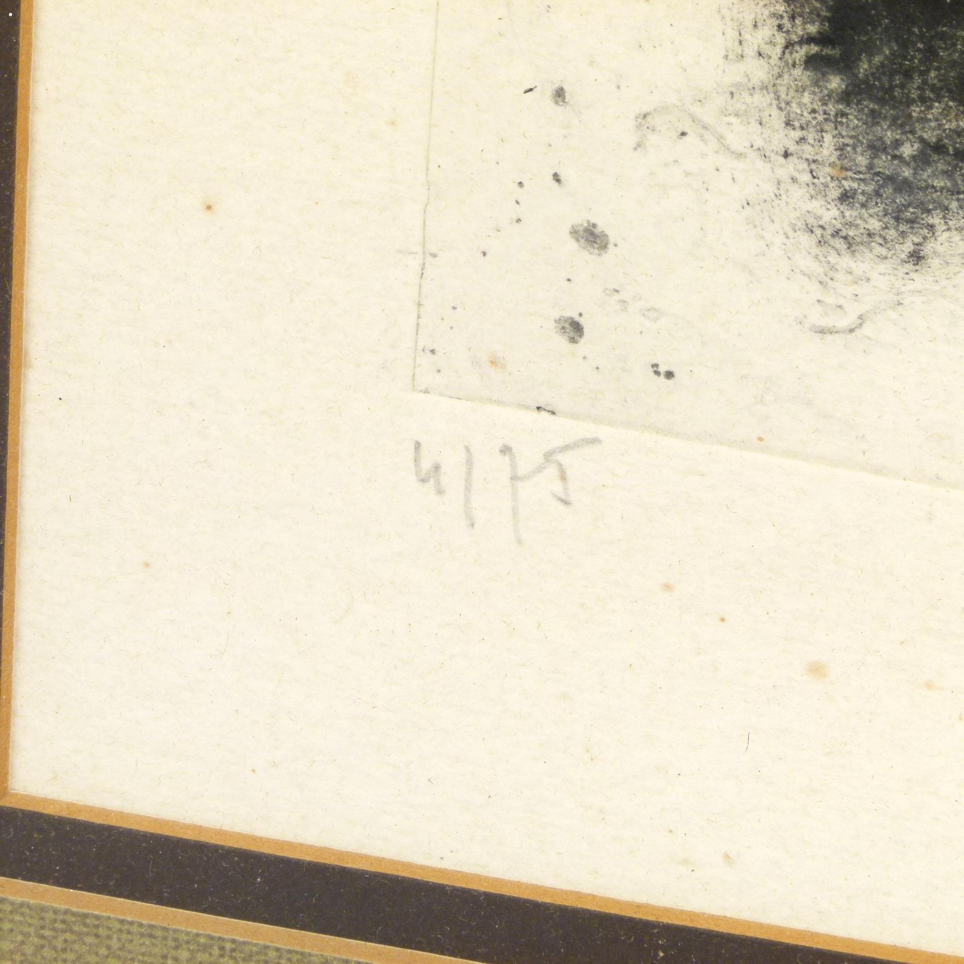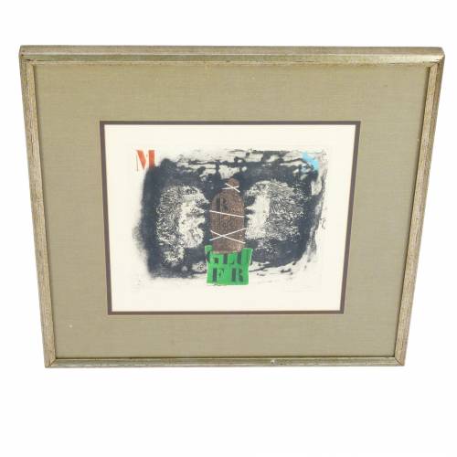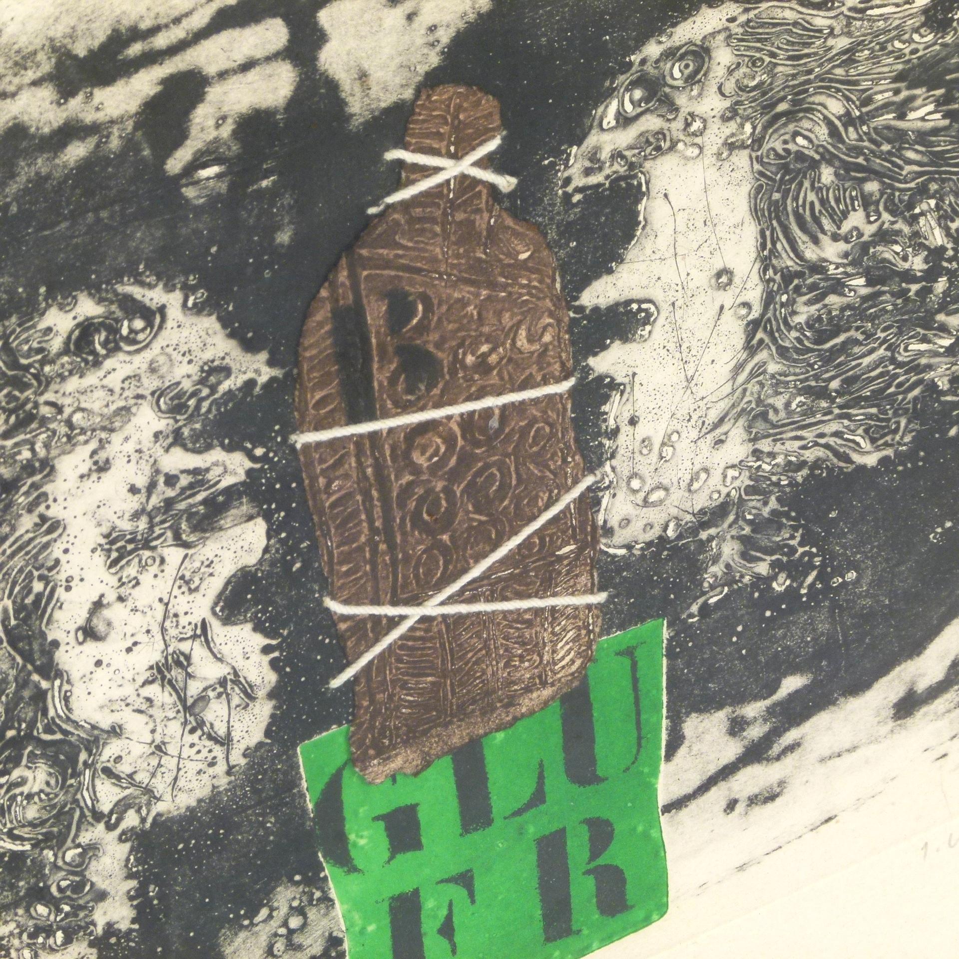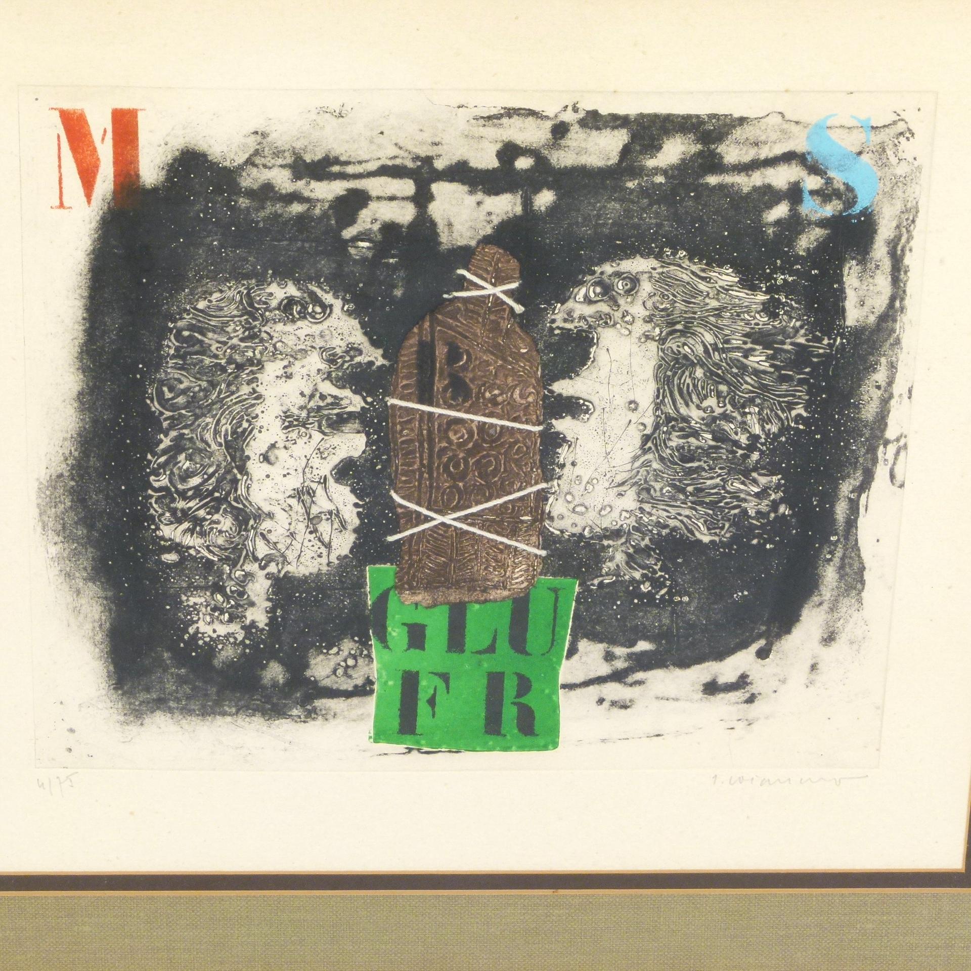 James Coignard, (French, 1925-2008) mixed media etching titled "Par Qui Venait Le Mal". Features two figures on either side of a stitched bottle. Signed and numbered from an edition of 75.