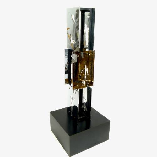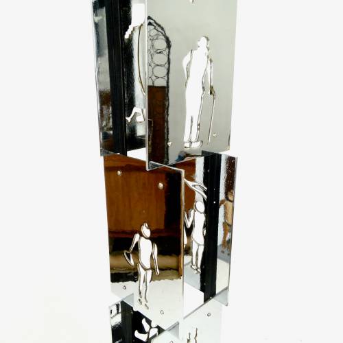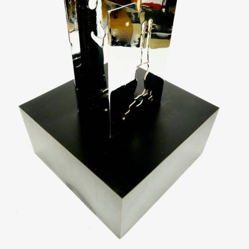 1973 "Circle of Life" sculpture in chromed steel panels on black steel frame attached to a black laminate pedestal base by Jim Mandle.