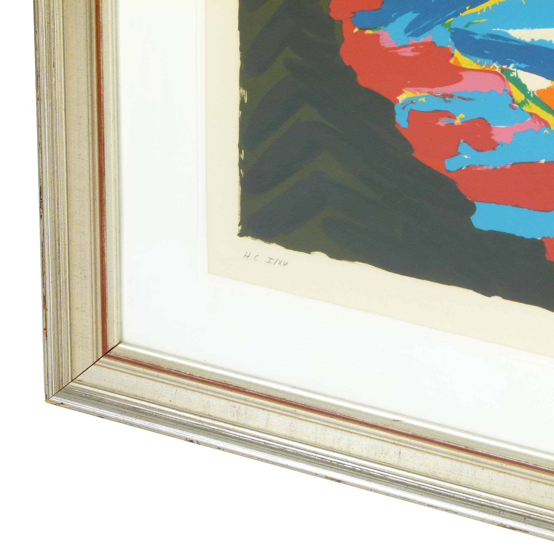 Abstract cat figure serigraph by Dutch artist Karel Appel (1921-2006). Hand signed artist proof numbered I/XV (#1 of 15). Beautifully framed and matted in a substantial silver leafed wood frame.