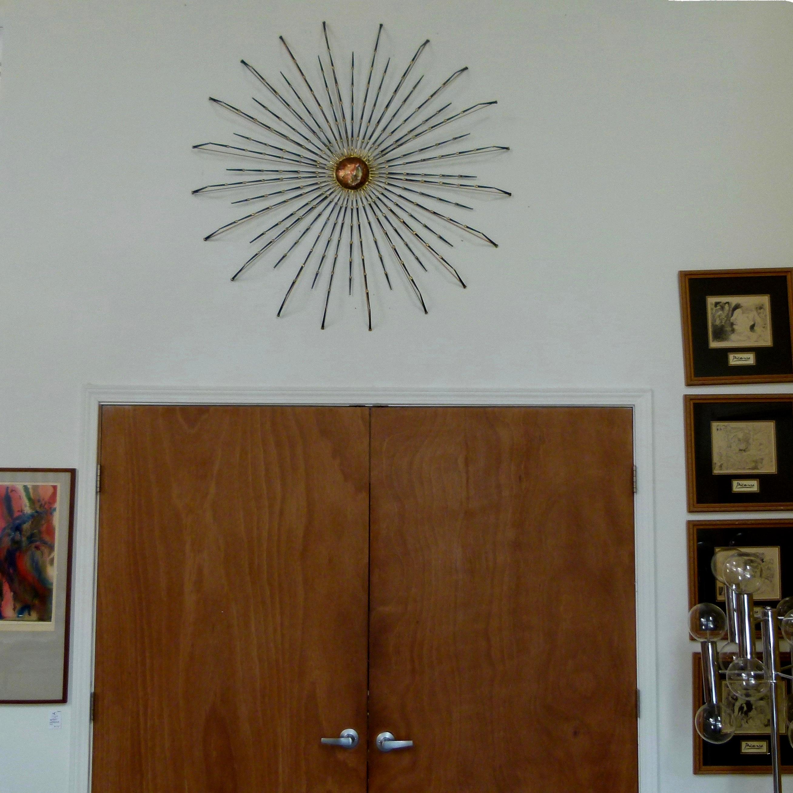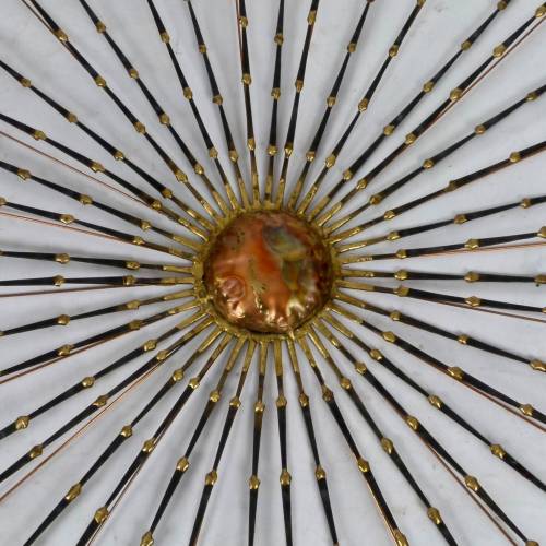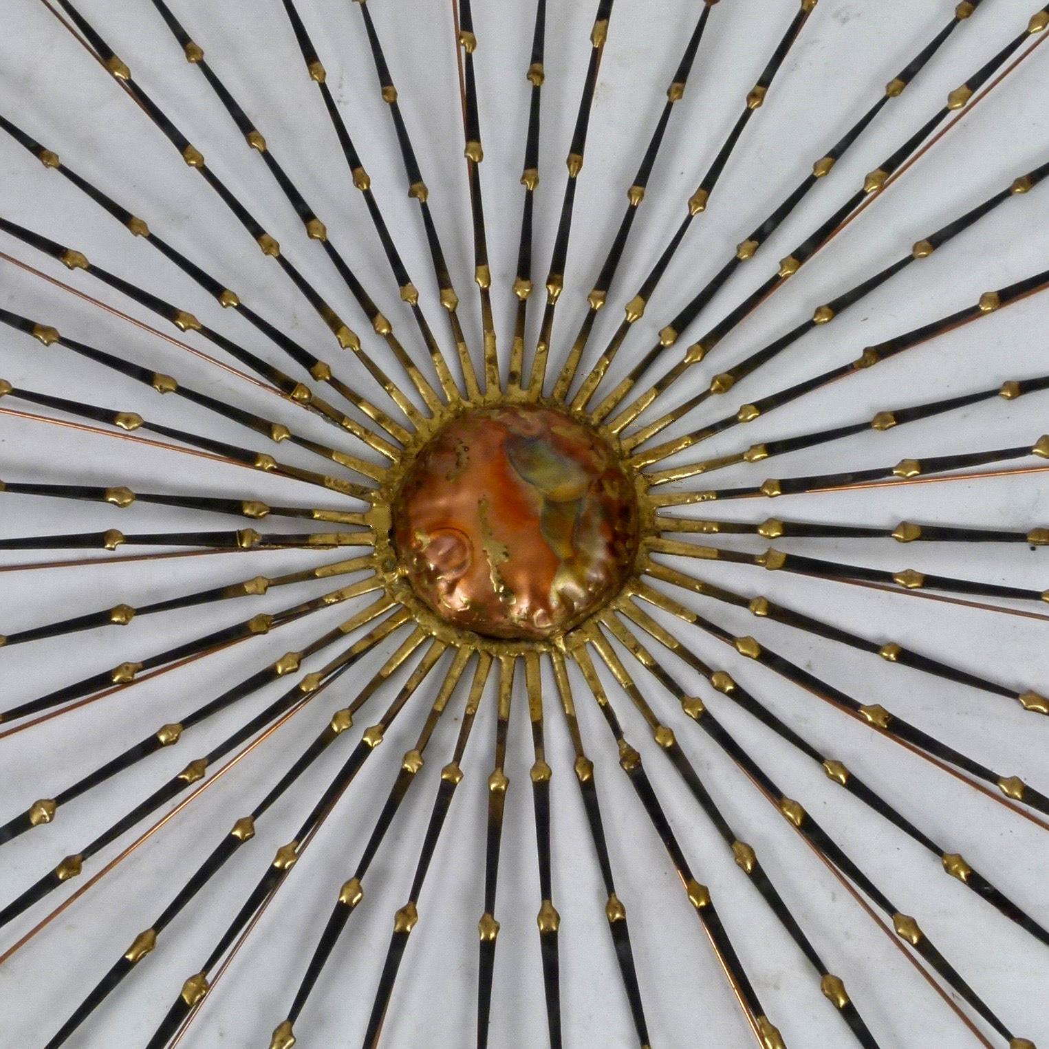 1970s mixed metals sunburst wall sculpture in steel, bronze and copper.