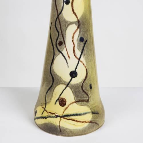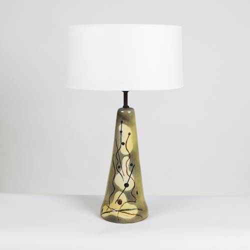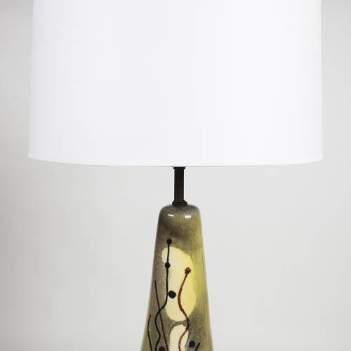 Early 1940s, amorphic form ceramic lamp with abstract design over chartreuse glaze, brass detail and finial. New shade.