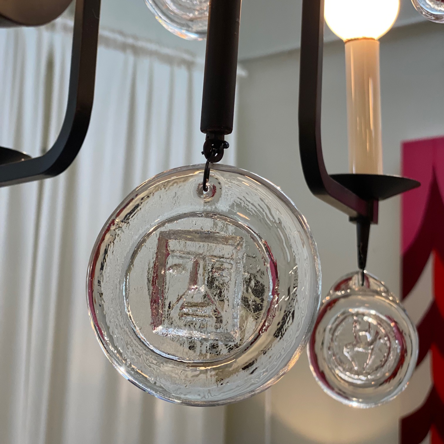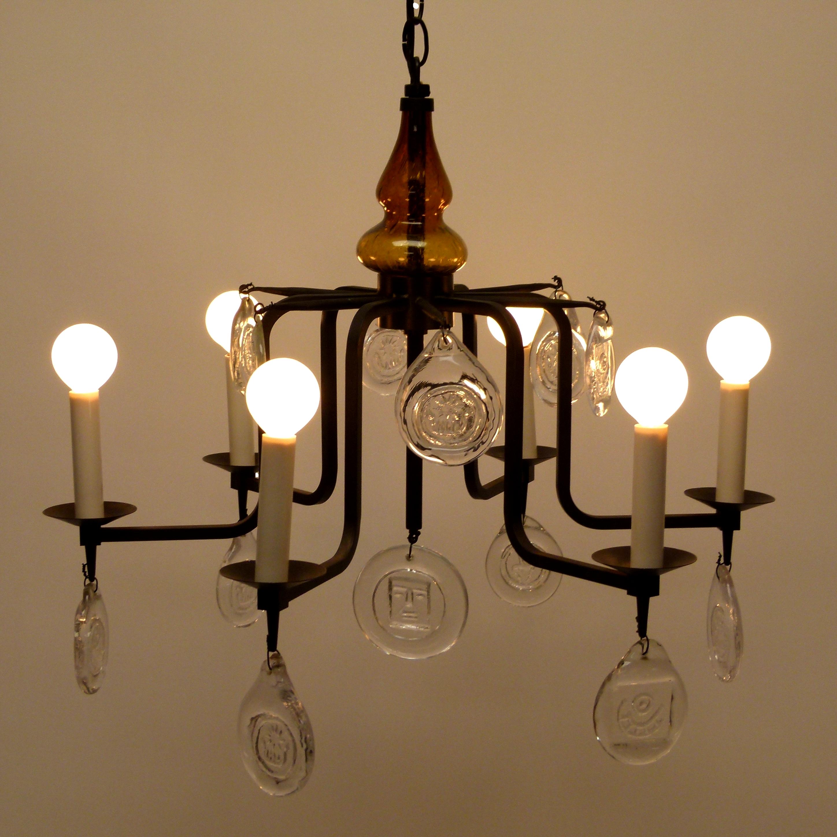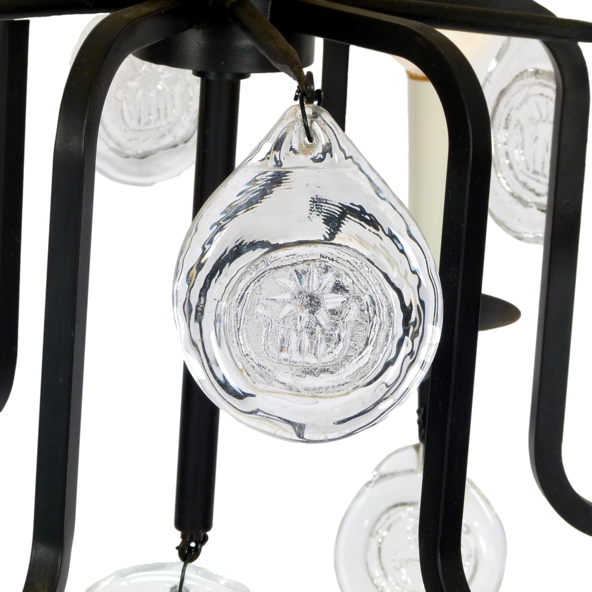 1960s Erik Hoglund iron frame chandelier with impressed glass medallions, Sweden.