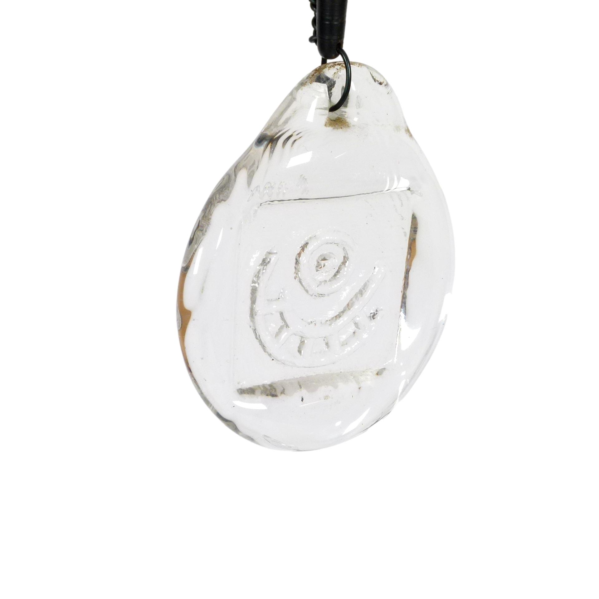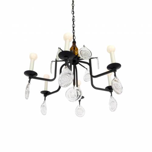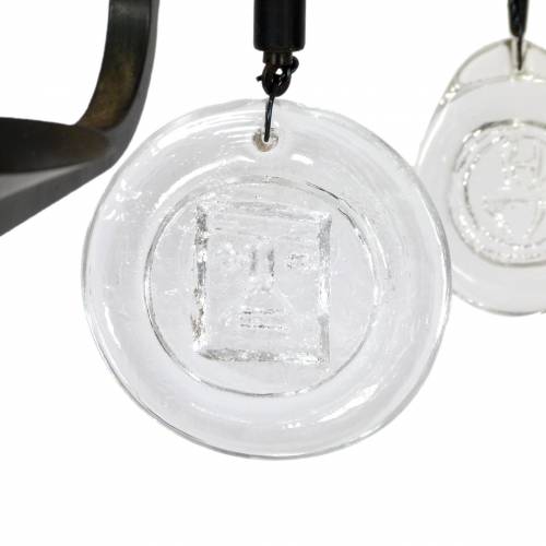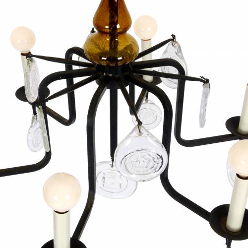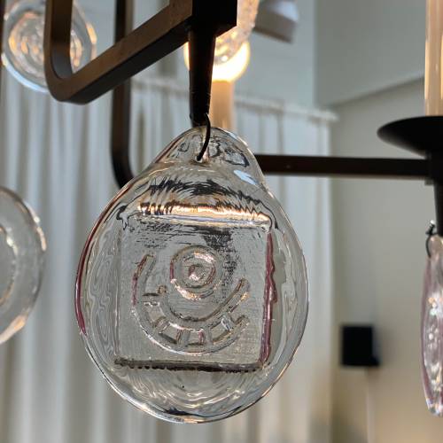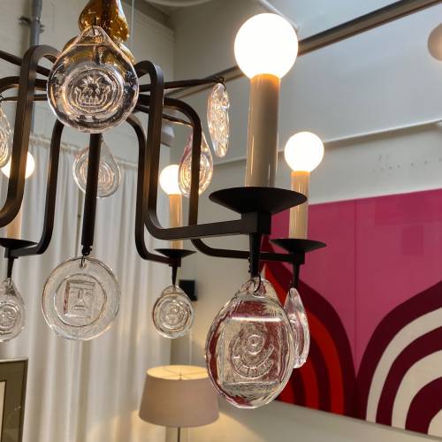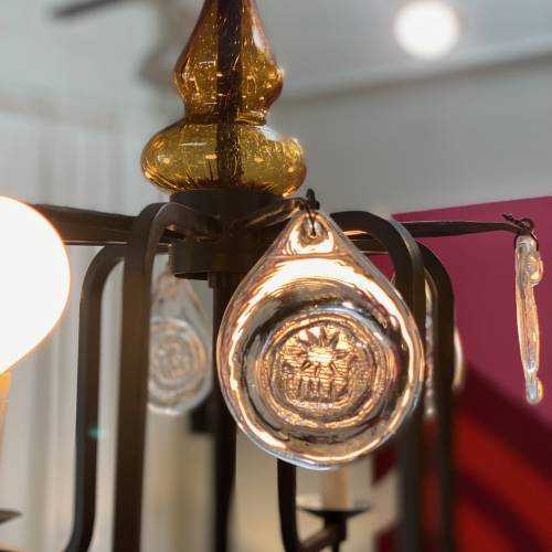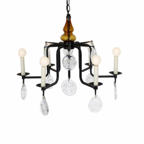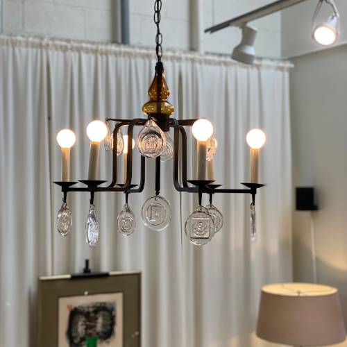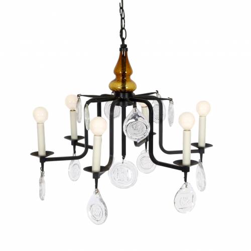 1960s Erik Hoglund iron frame chandelier with impressed glass medallions, Sweden.