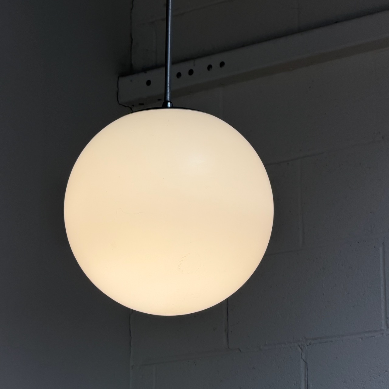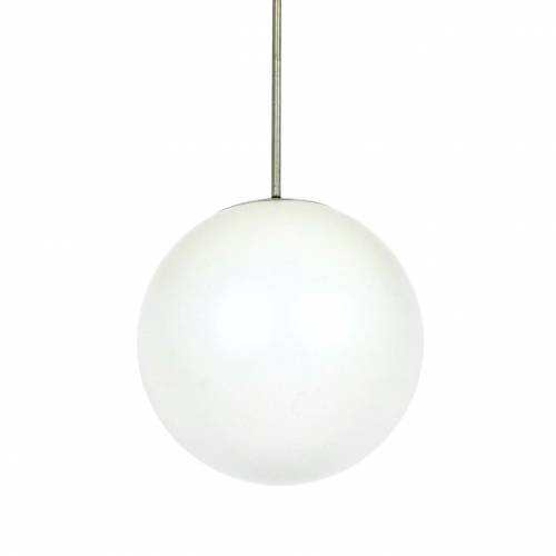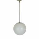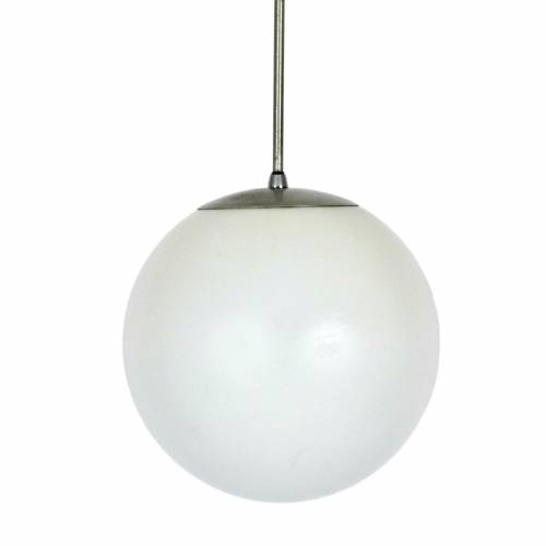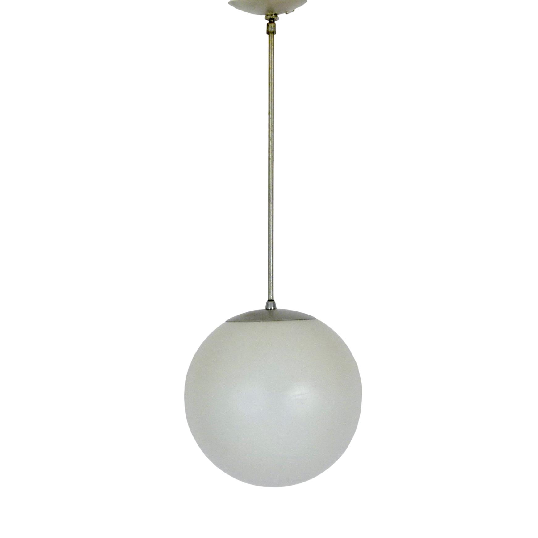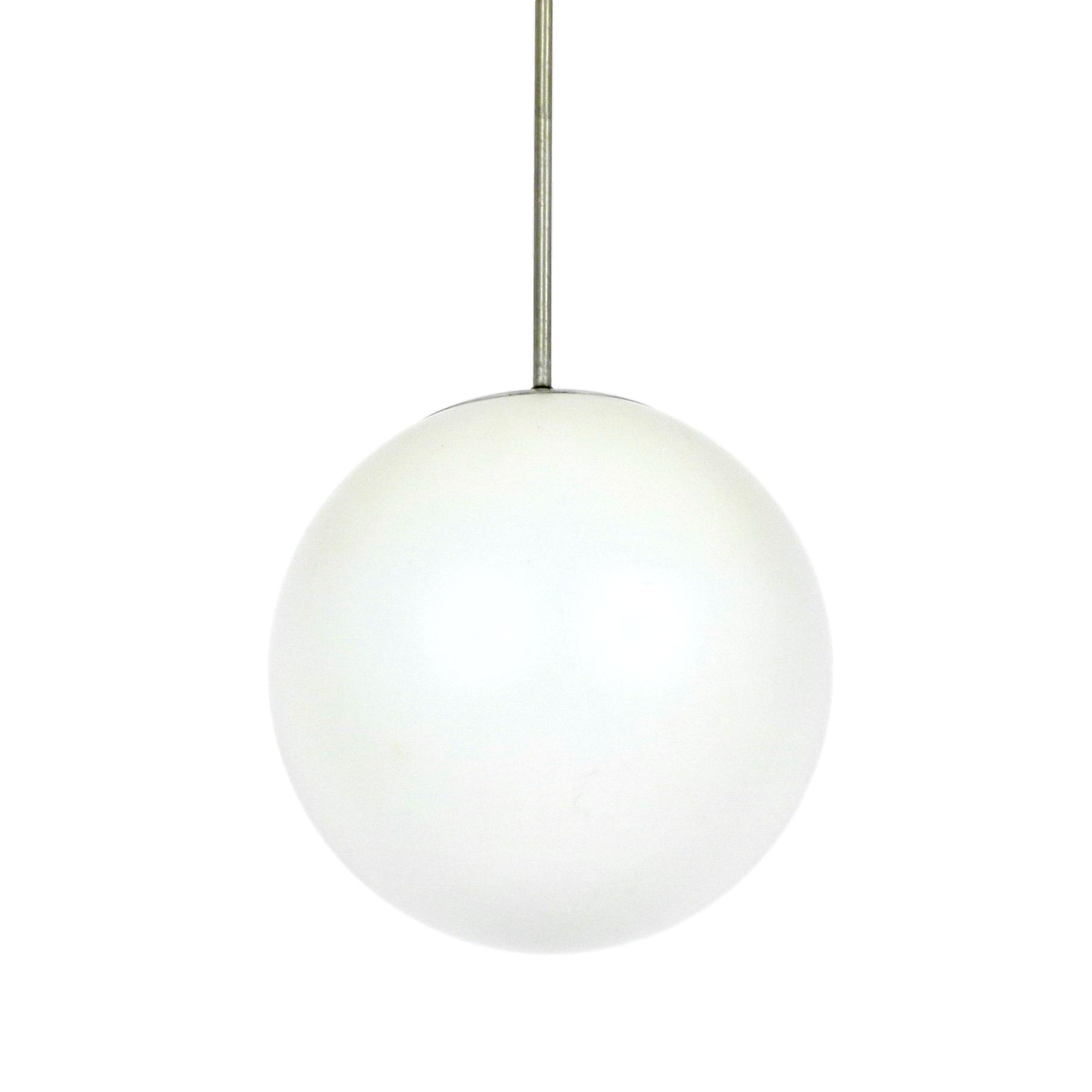 1960s frosted glass globe pendant with original brushed silver metal down rod and ceiling cap.