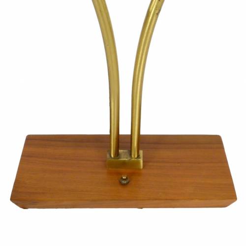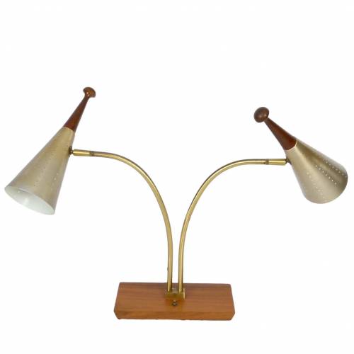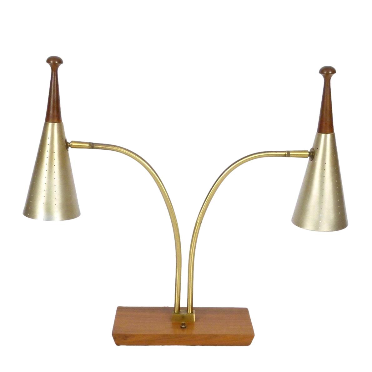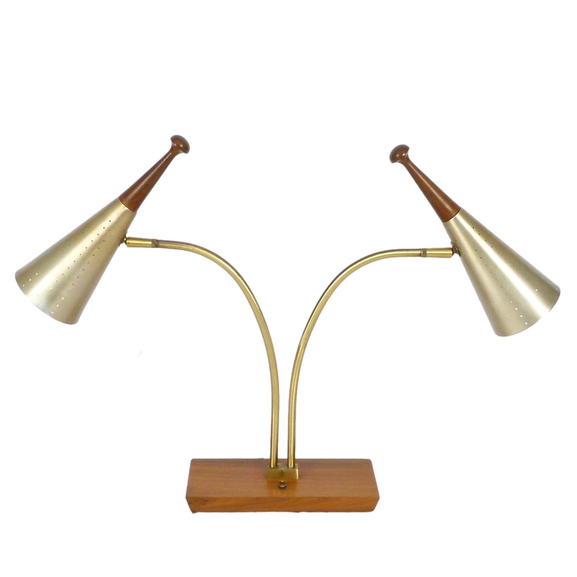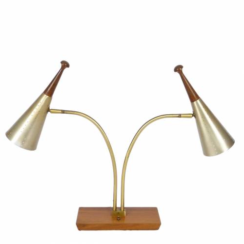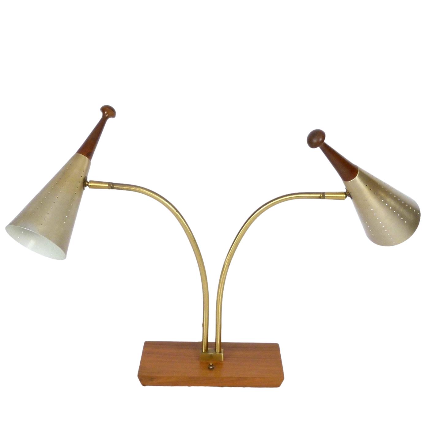 1960s lamp with 2 directional pierced shades, walnut details and 3-way switch.