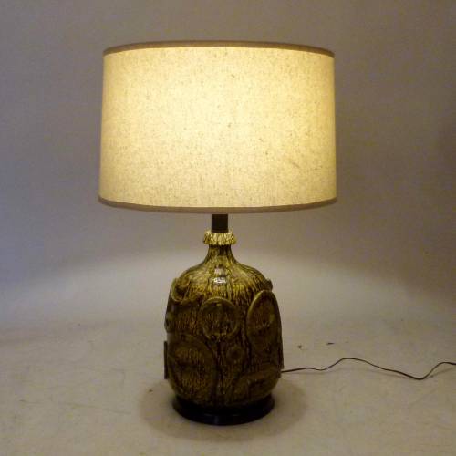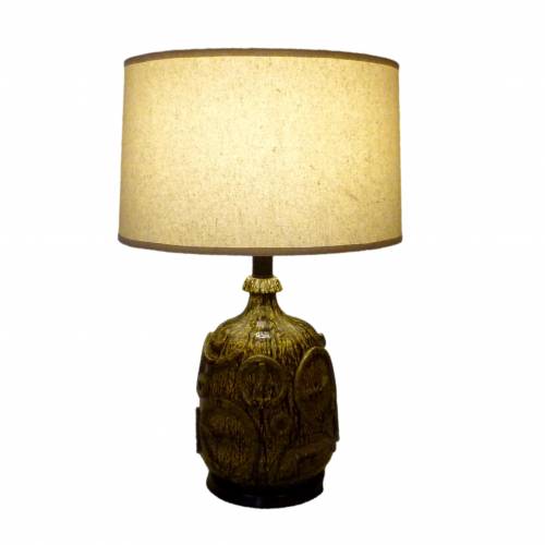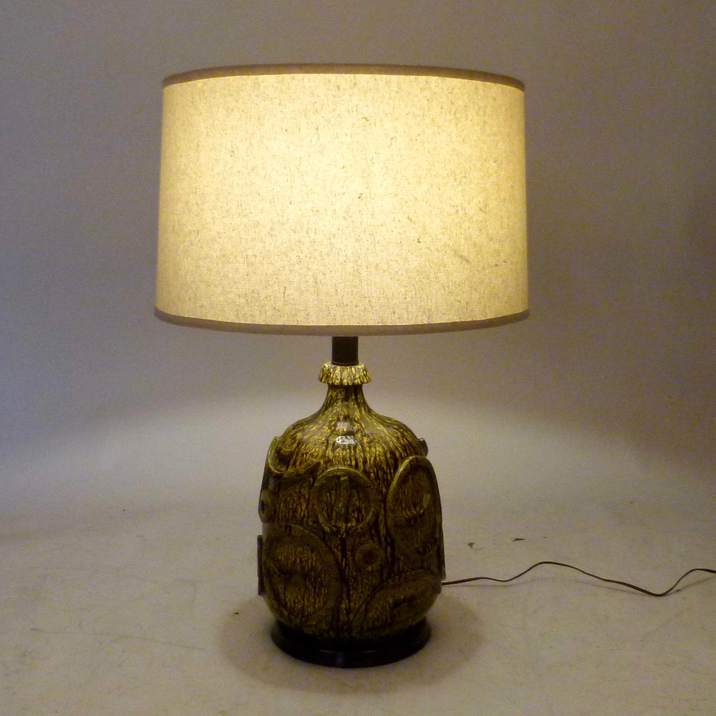 Vintage ceramic lamp with black and yellow mottled finish, raised circles design and linen shade.