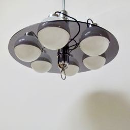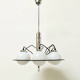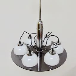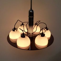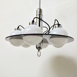 1960s chrome & smoked acrylic chandelier from Italy with 6 white glass globes.