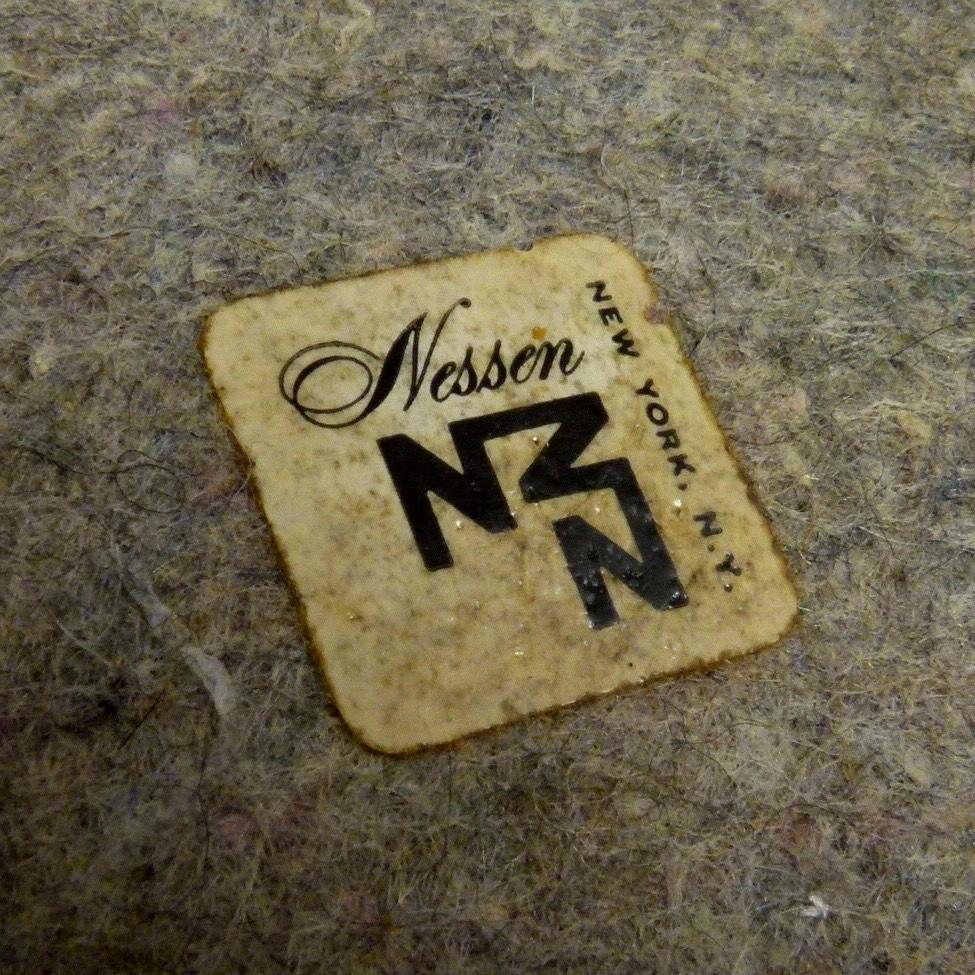 1960s chrome lamp with white glass cone diffuser and linen shade by Walter Von Nessen. Retains Nessen label.