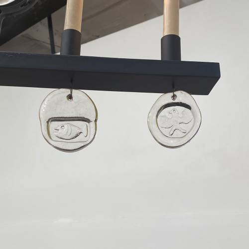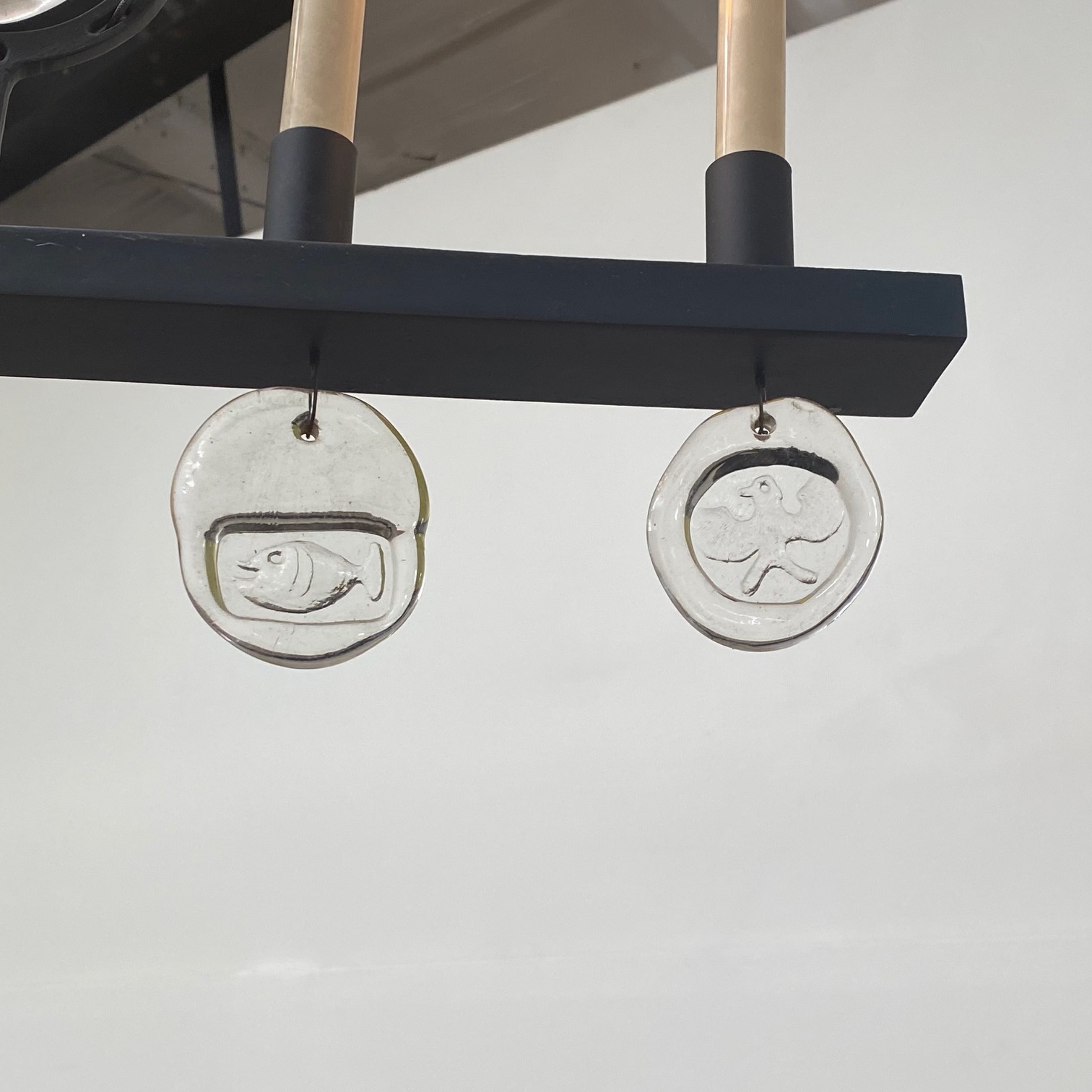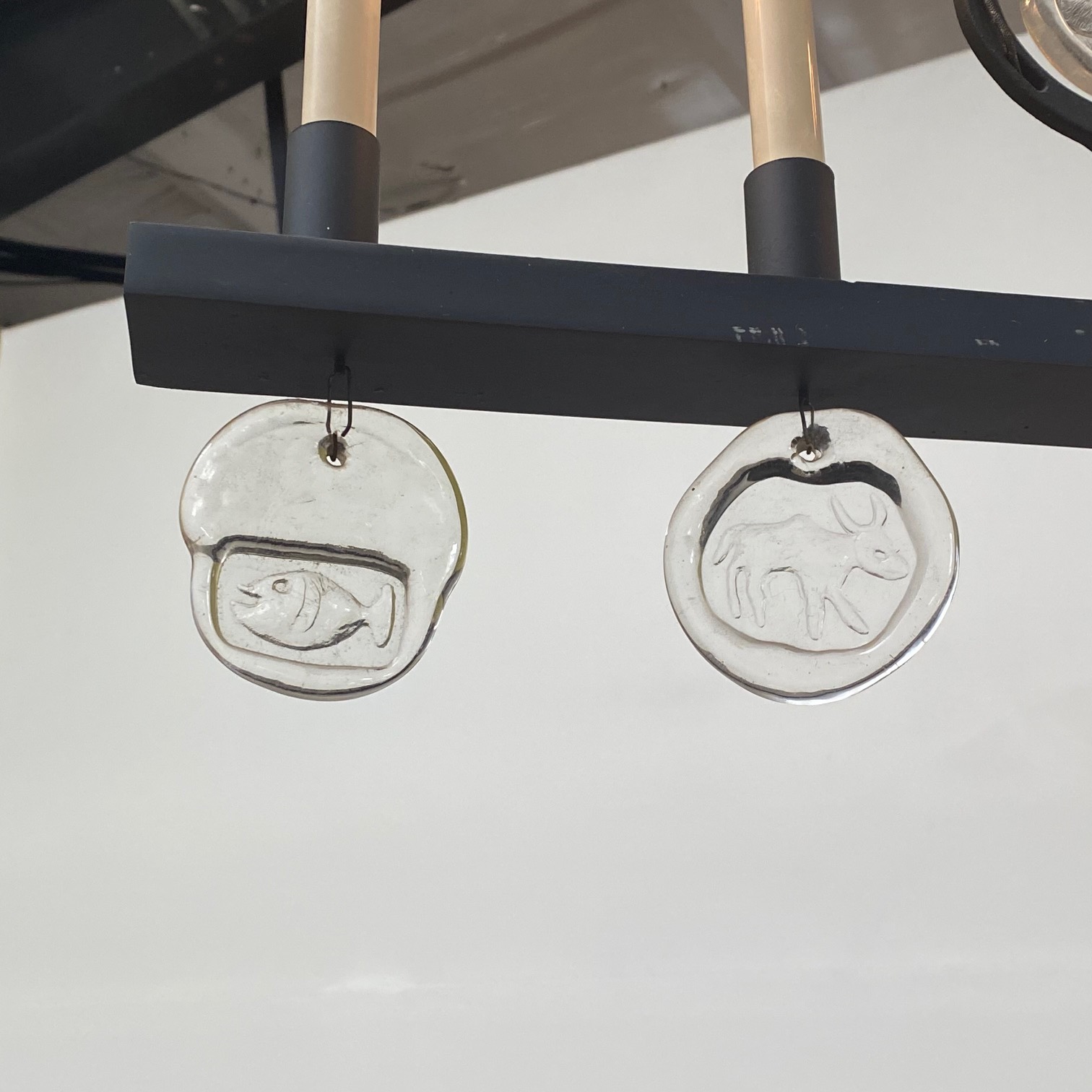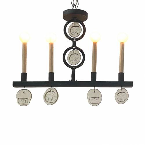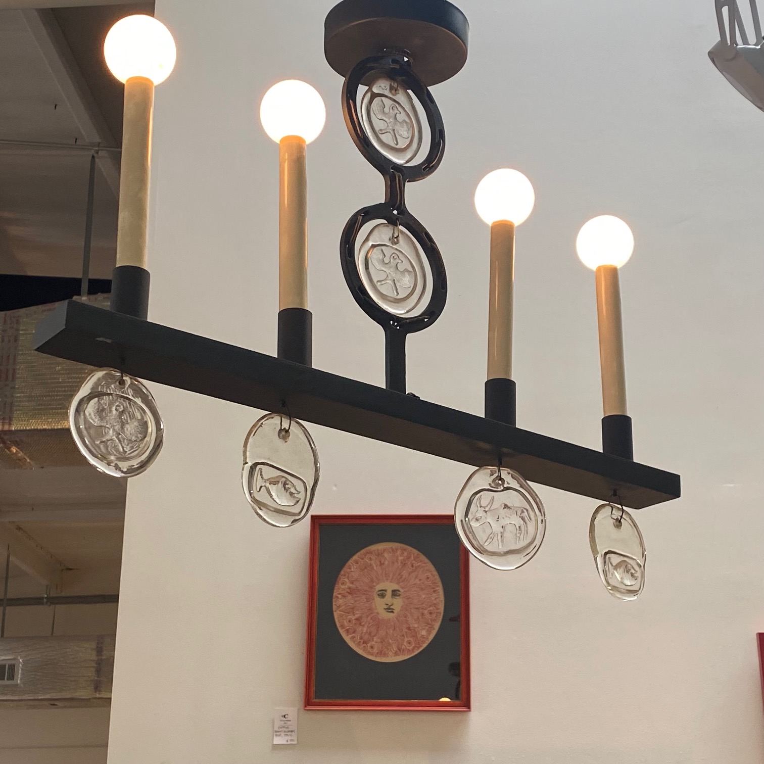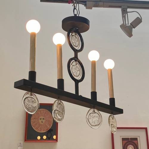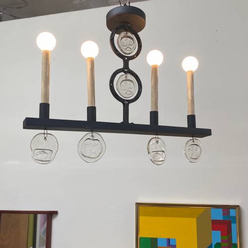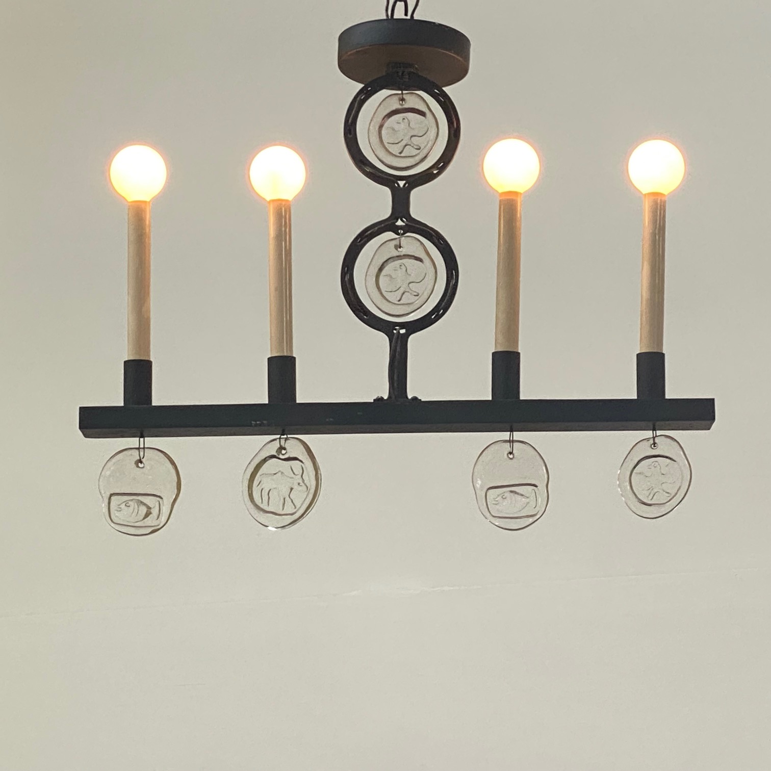 1960s Erik Hoglund iron and glass disc four bulb chandelier, Sweden.