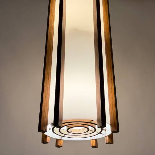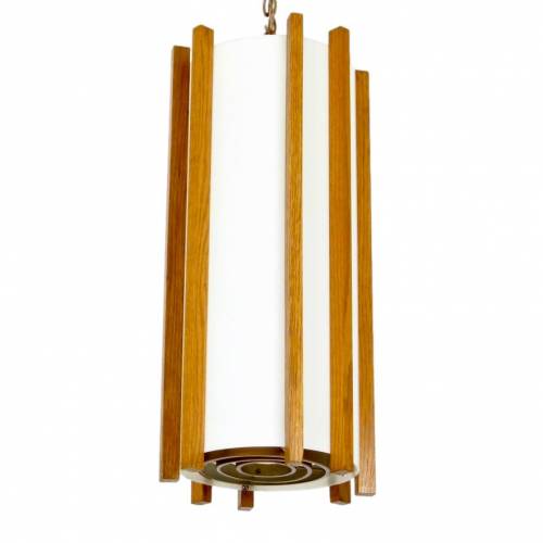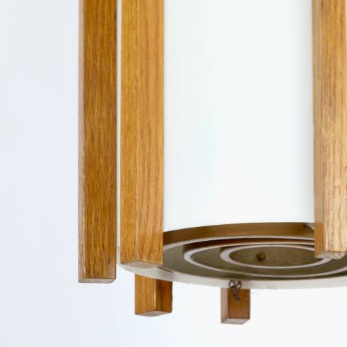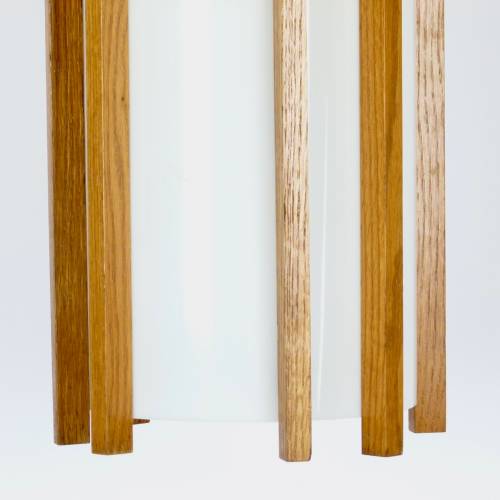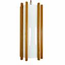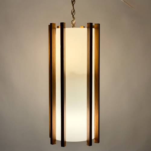 White acrylic cylinder with teak finished oak slat design, c. 1970. Each holds (up to) eight 60 watt bulbs with standard base. Two available, sold separately $345 each