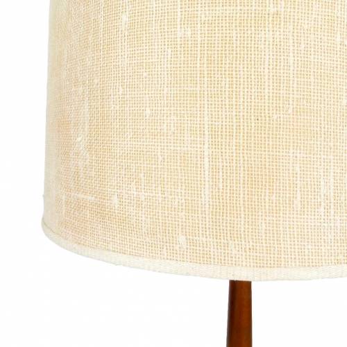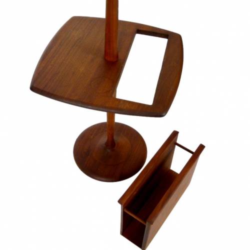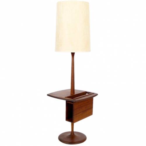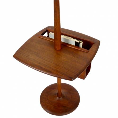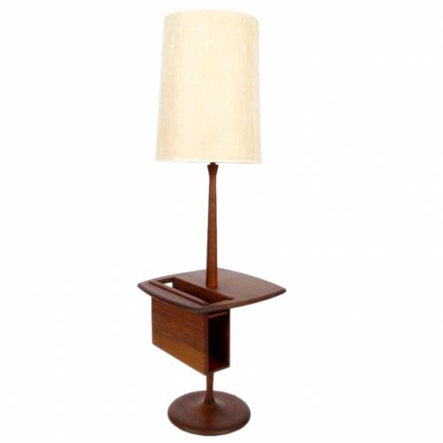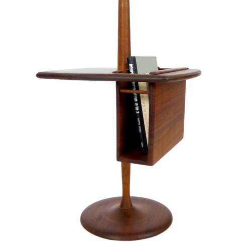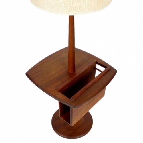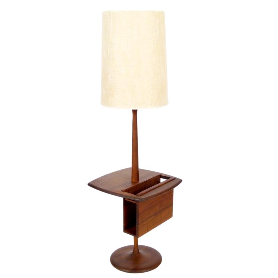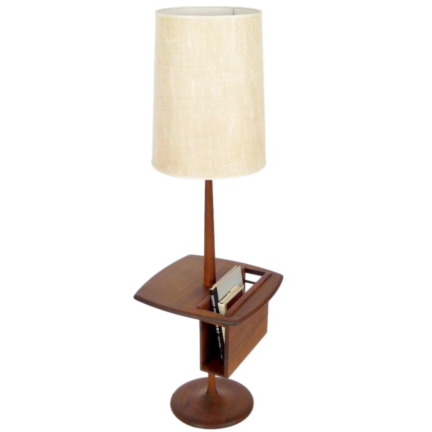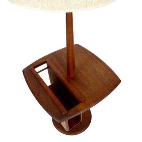 1960s oiled walnut base floor lamp with magazine/book insert on table top and original ivory linen shade by The Laurel Lamp Company.