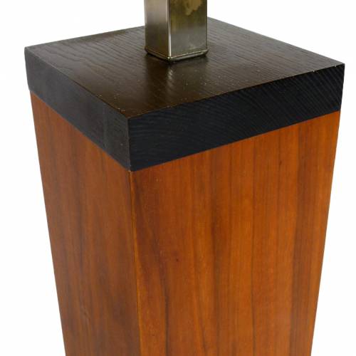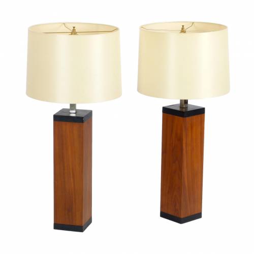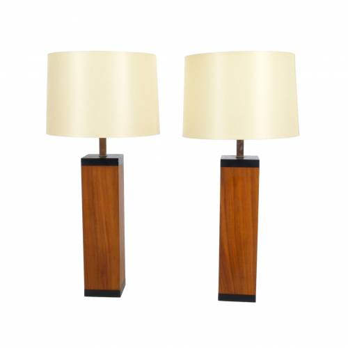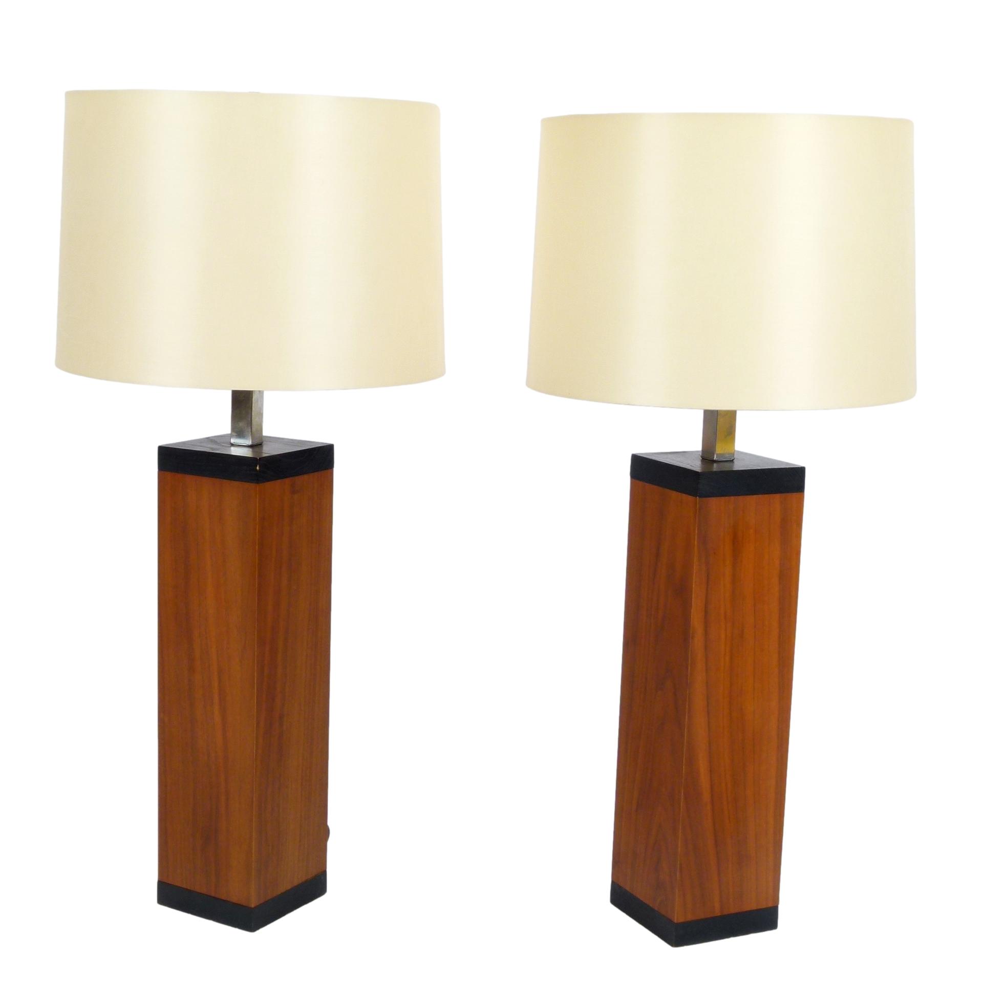 Pair of large scale walnut column lamps, 1960s. Shades included.