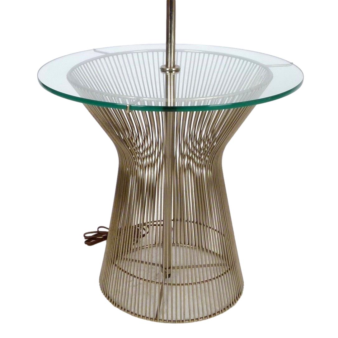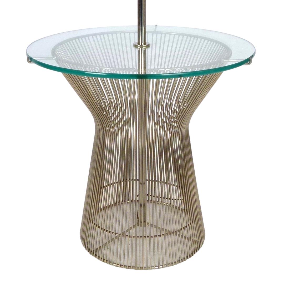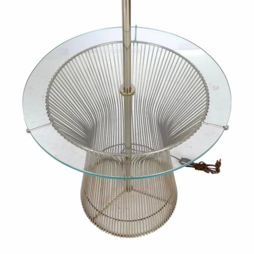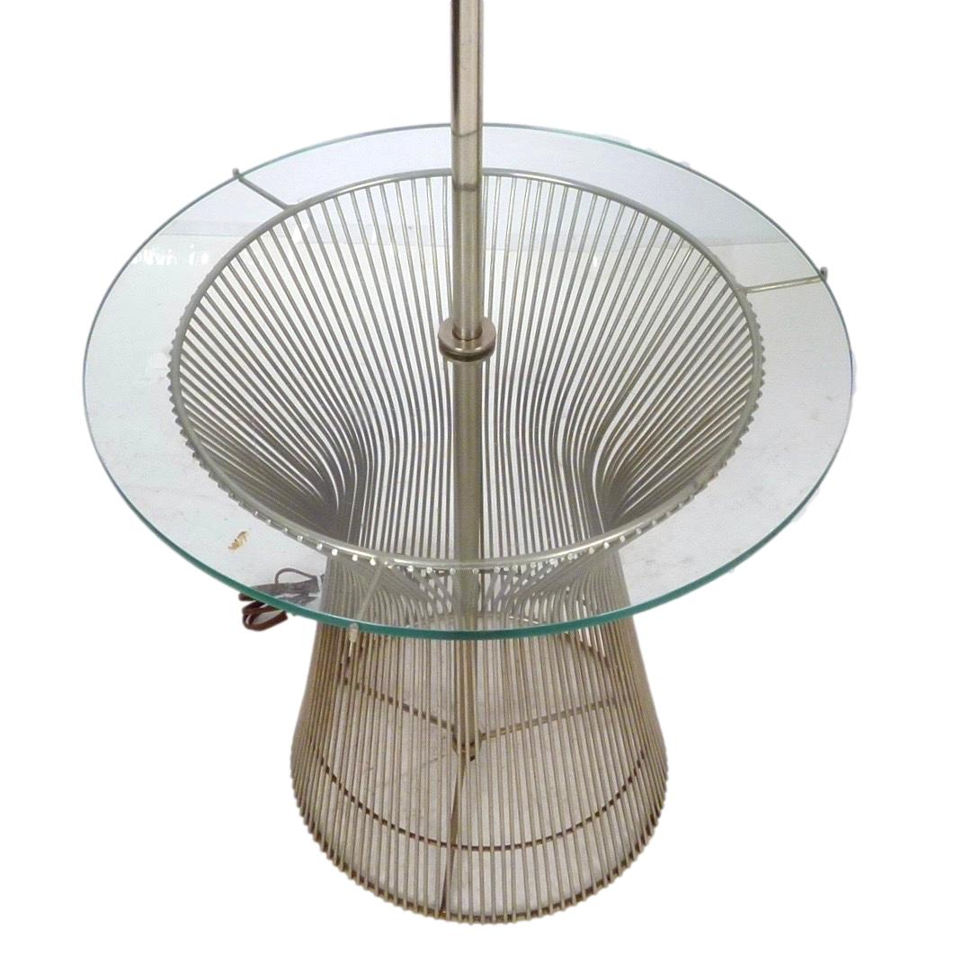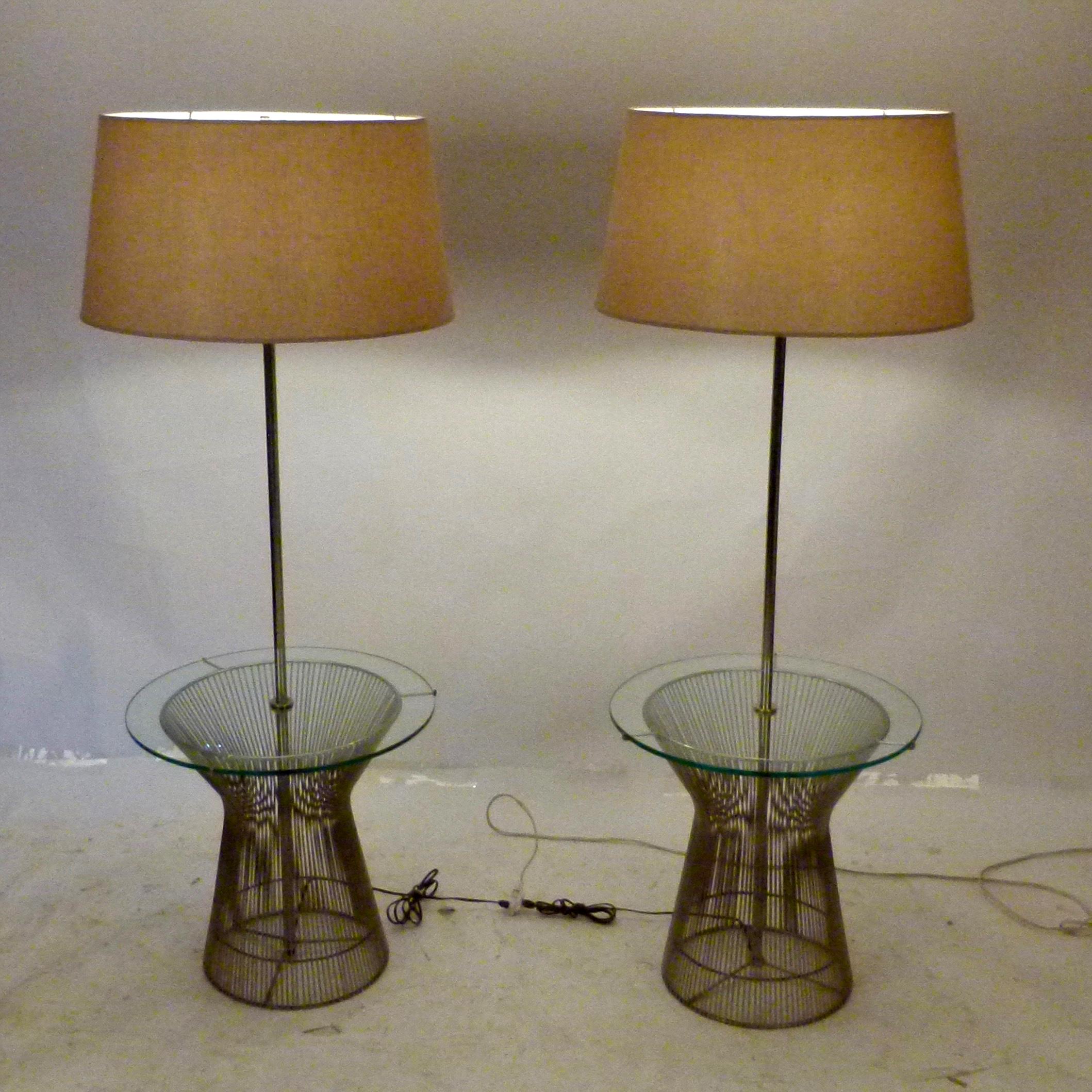 Pair of 1960s chrome Warren Platner style floor lamps with glass tables by Laurel Lamp Co. with new linen shades.
