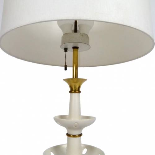 Rare 1950s 3 bulb, 3 tiered ceramic lamp with brass details, 3-way switch and linen shade by Gerald Thurston for Lightolier.
