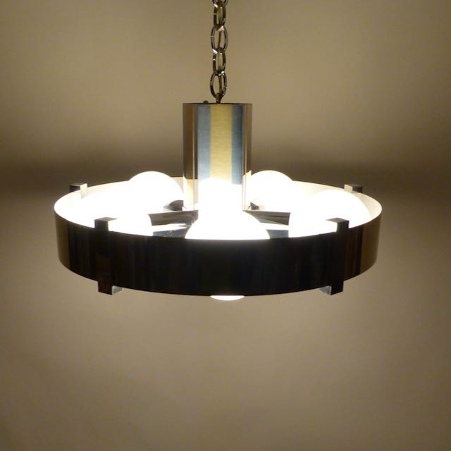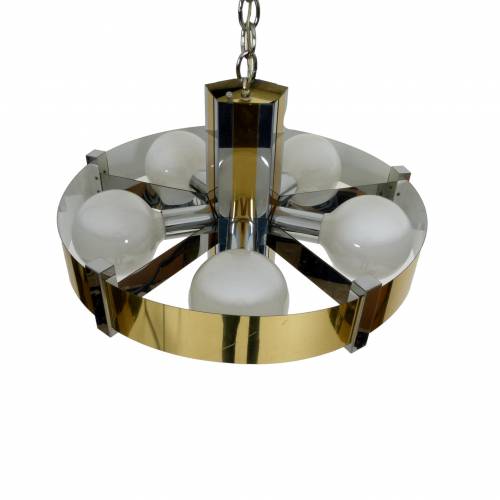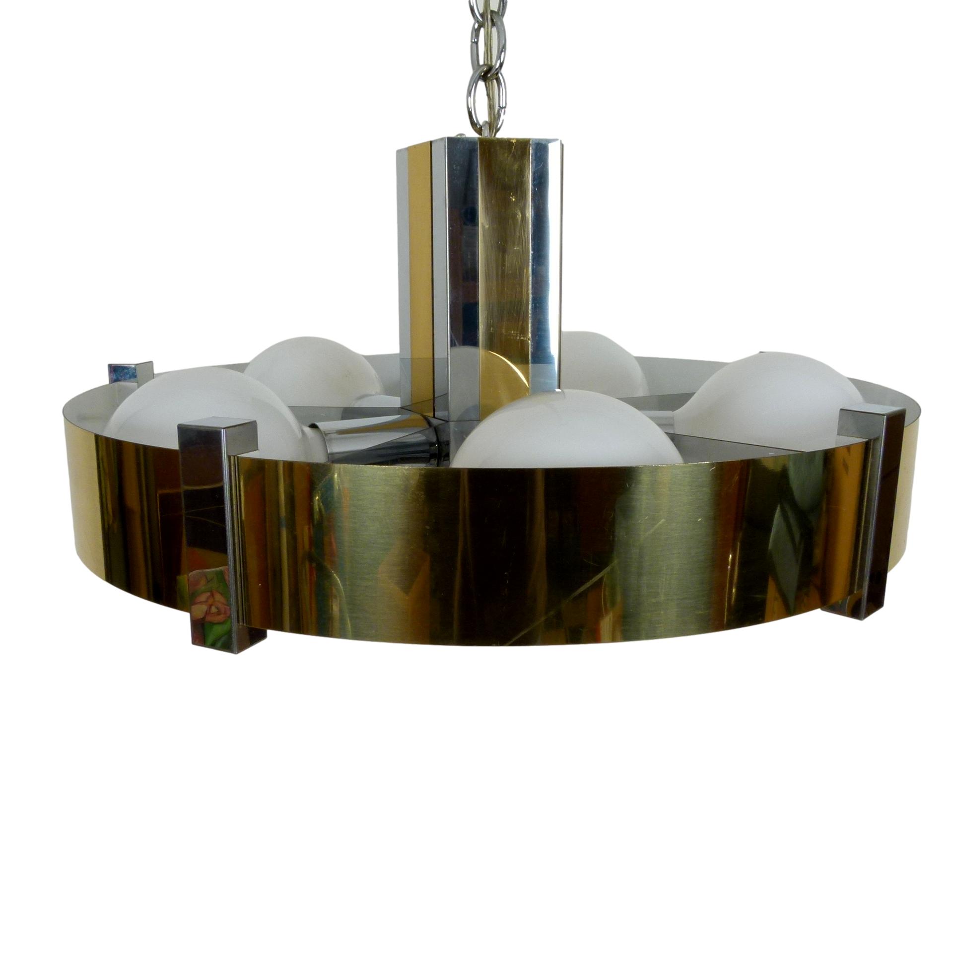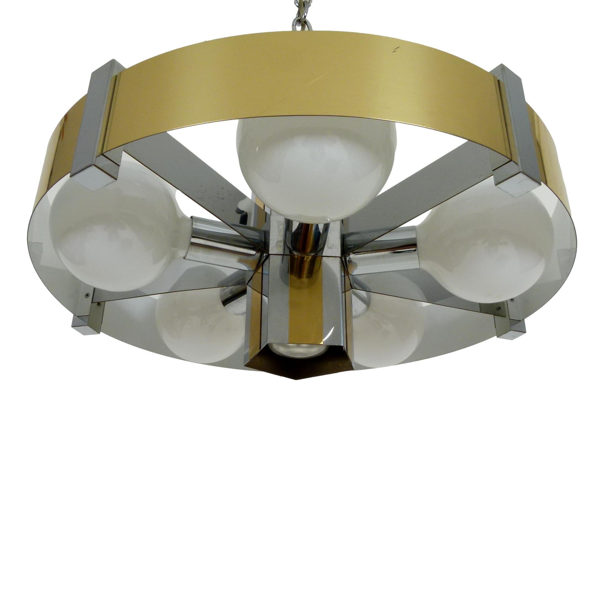 1970s chrome and brass 6 bulb chandelier with 3-way switch on top by Robert Sonneman. Shown with 5" bulbs and center spot bulb.