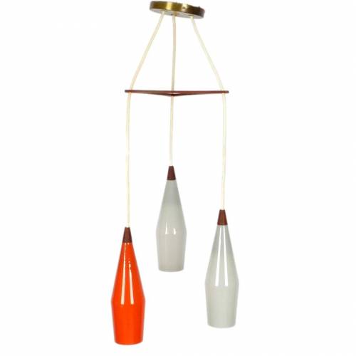 1960s blown glass with teak details Scandinavian triple pendant light fixture.