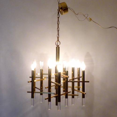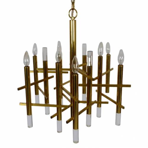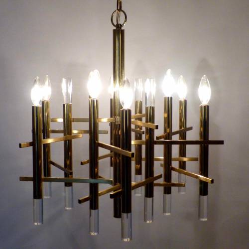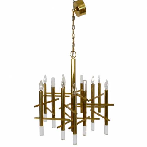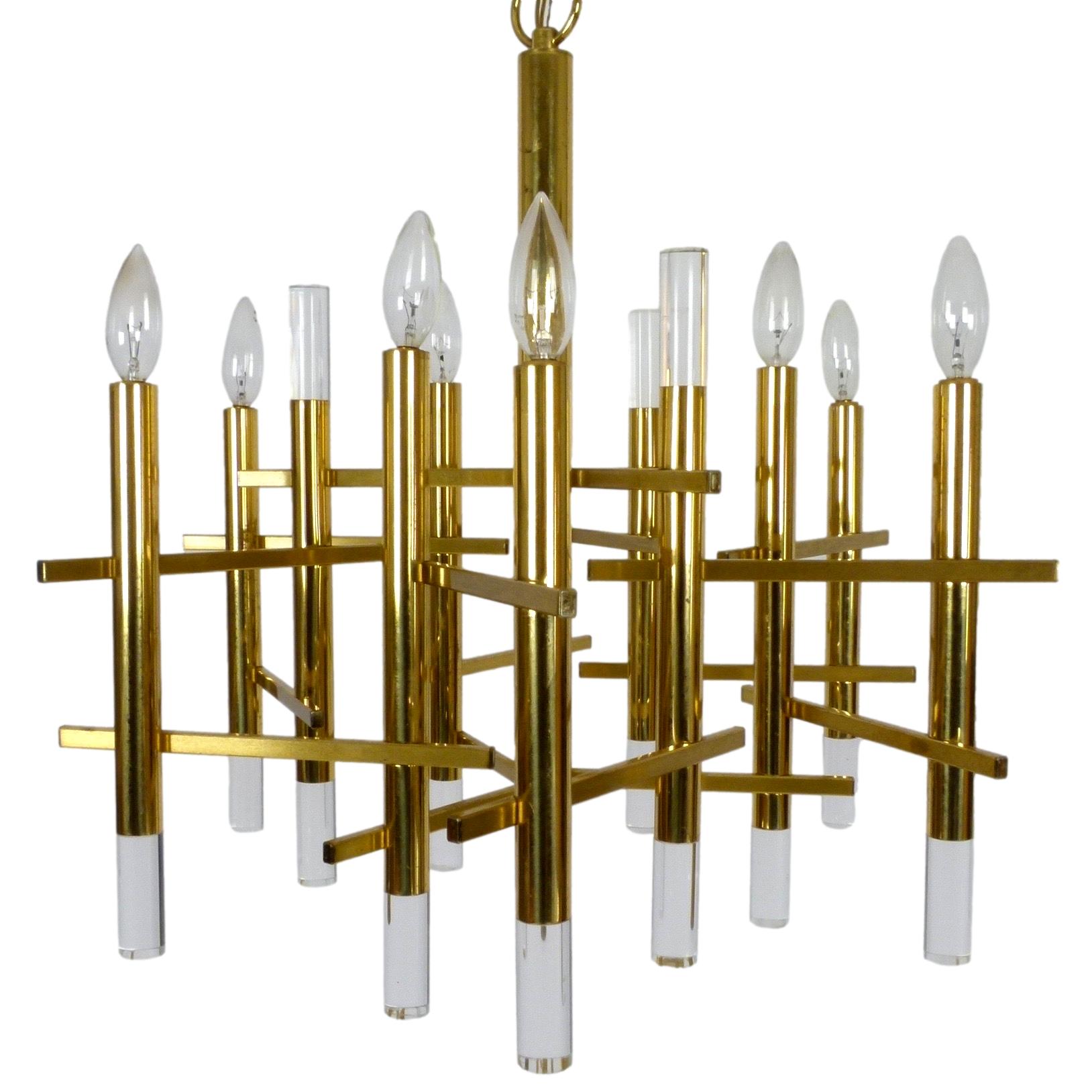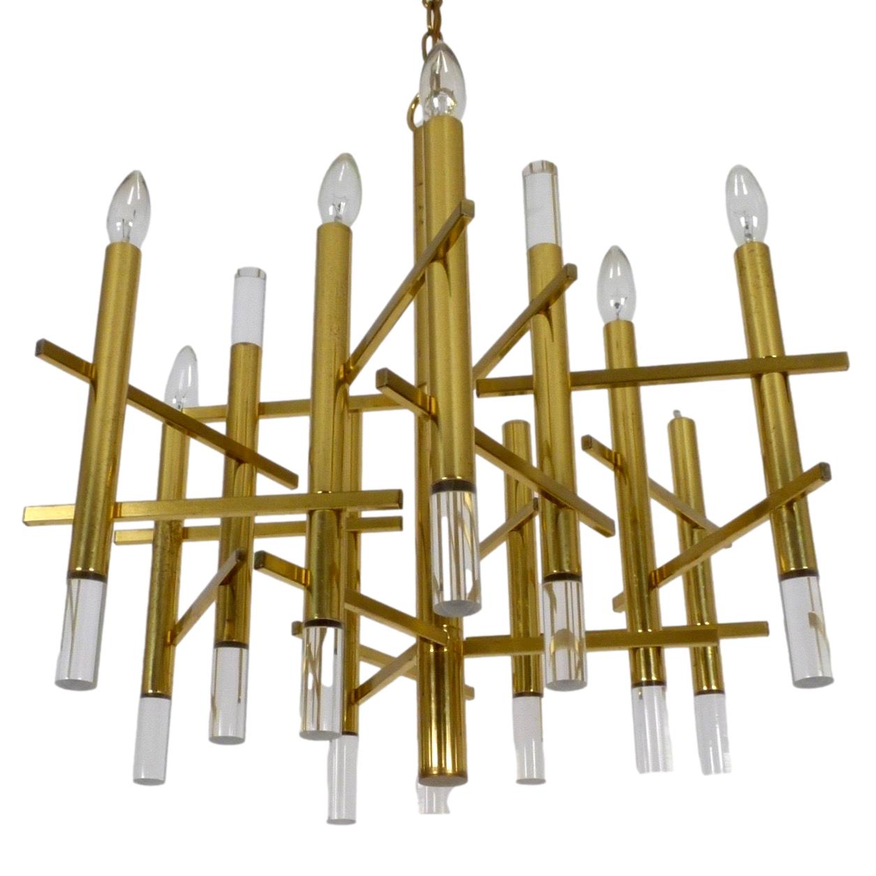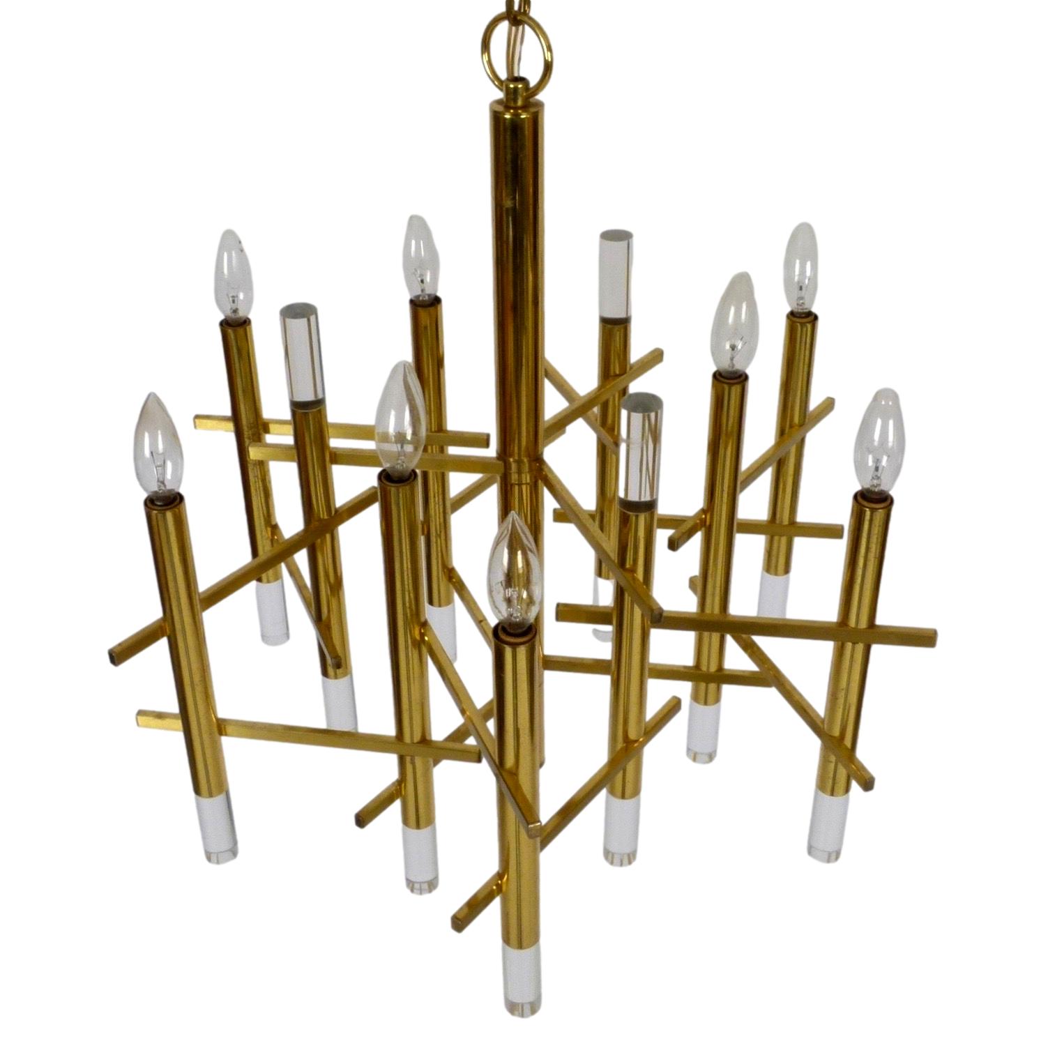 C.1970, nine bulb brass and Lucite chandelier from Italy by Gaetano Sciolari.