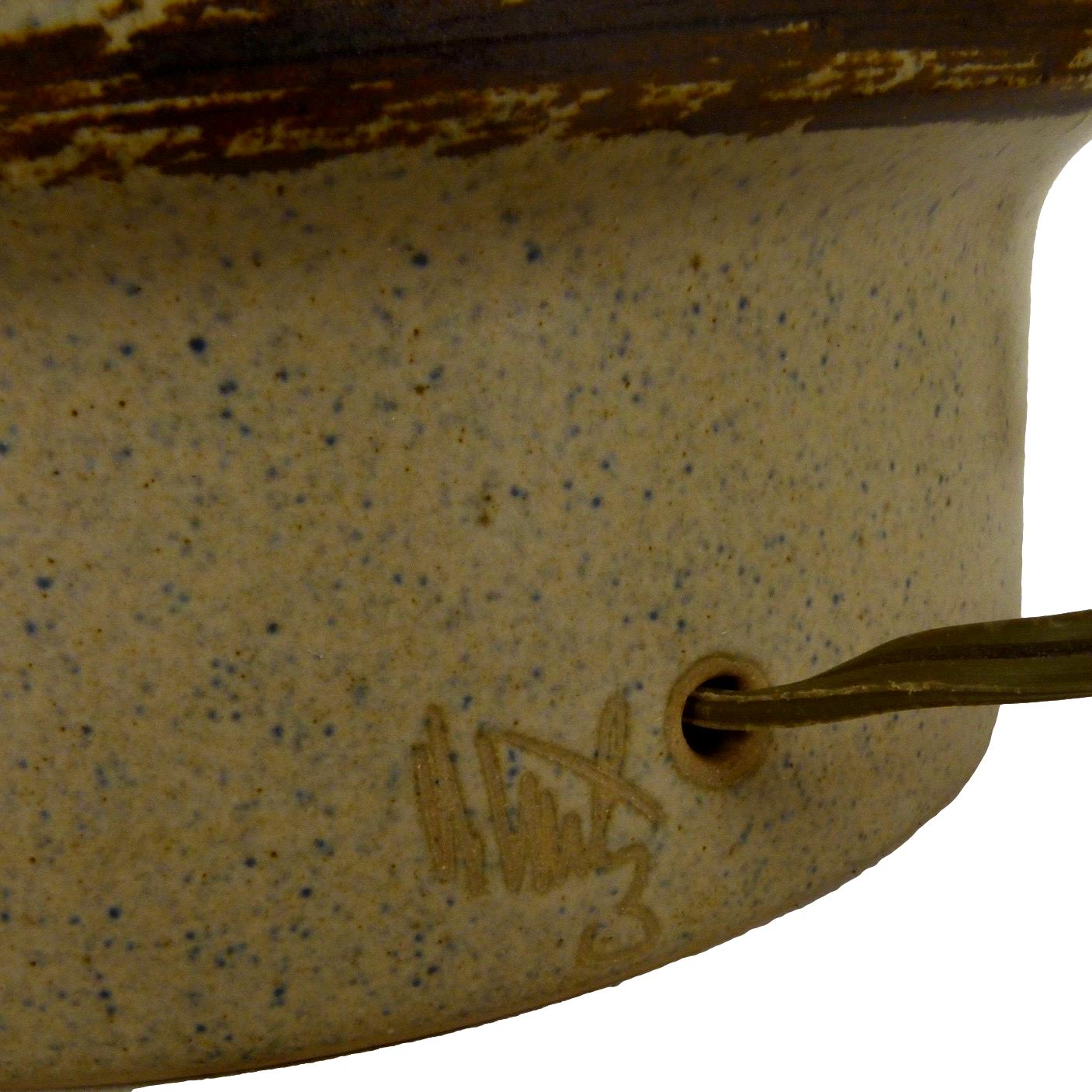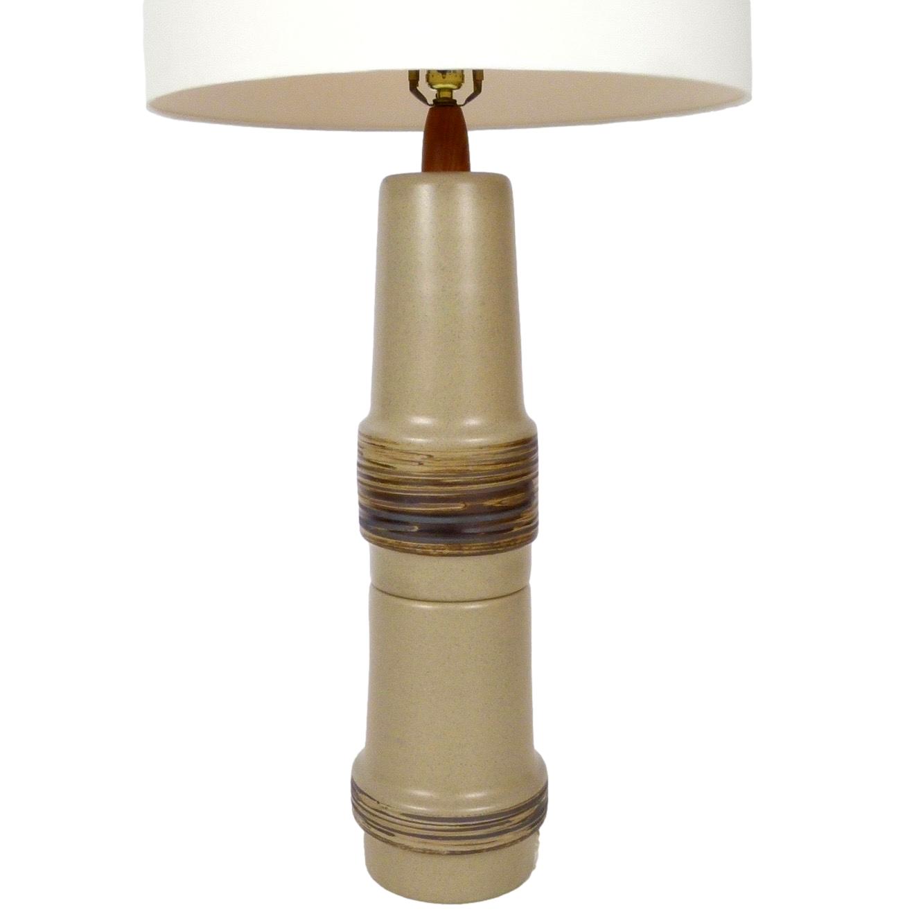 Monumental c.1960 ceramic lamp with walnut detail and finial by Gordon and Jane Martz for Marshall Studios. Signed. Includes fabric shade.