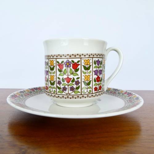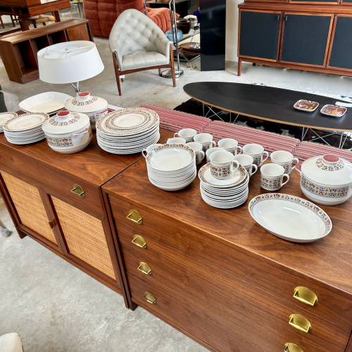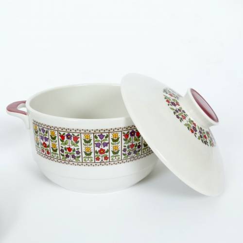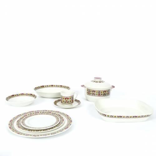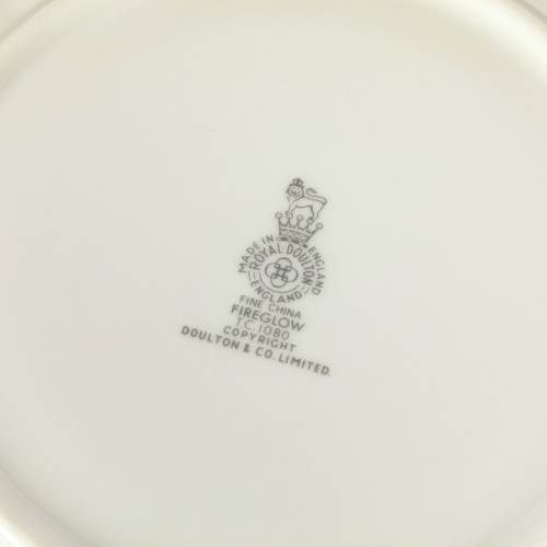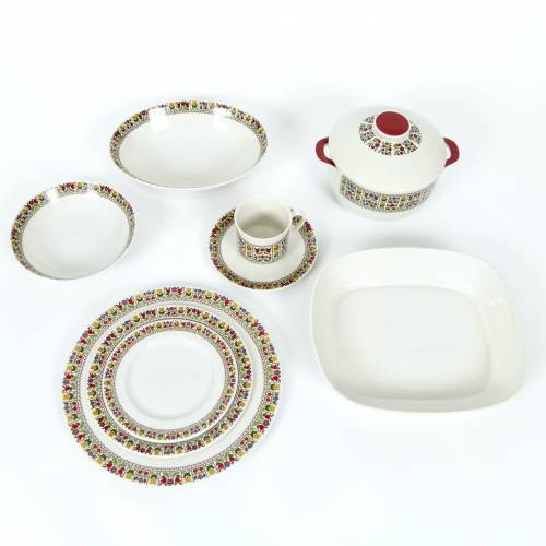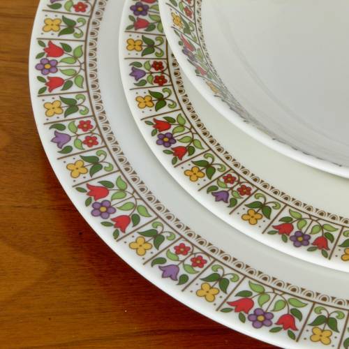78 pieces including dinner, salad, and bread plates, soup bowl, coffee cups with saucers, 3 graduated size covered casseroles, and 3 serving bowls in Fireglow by Royal Doulton, c. 1972. Set is almost 12 complete six-piece place settings, just short a few bread plates. Bold and graphic bright spring flower design on white china.