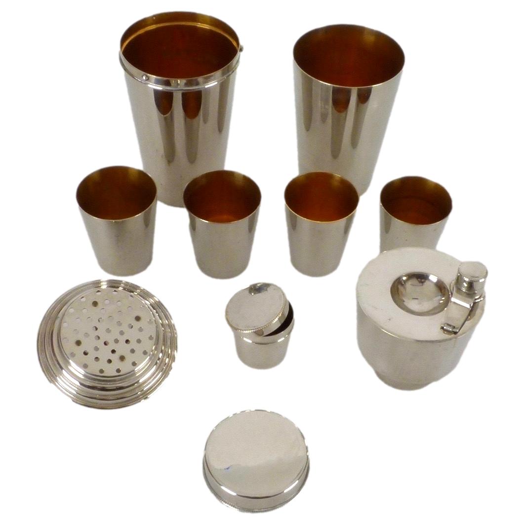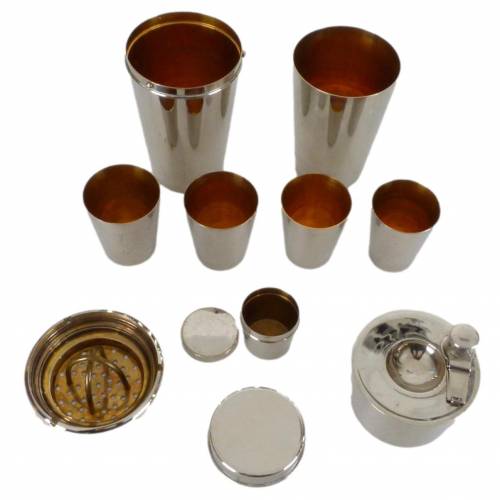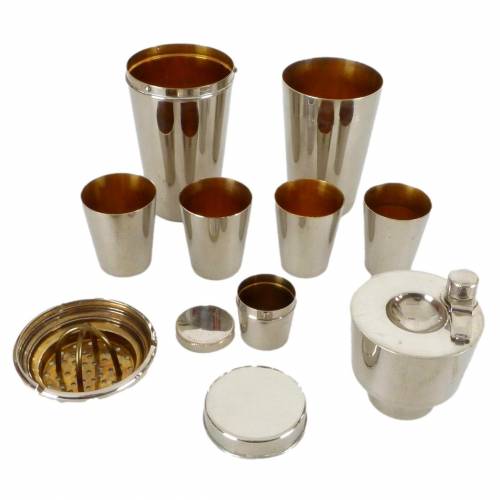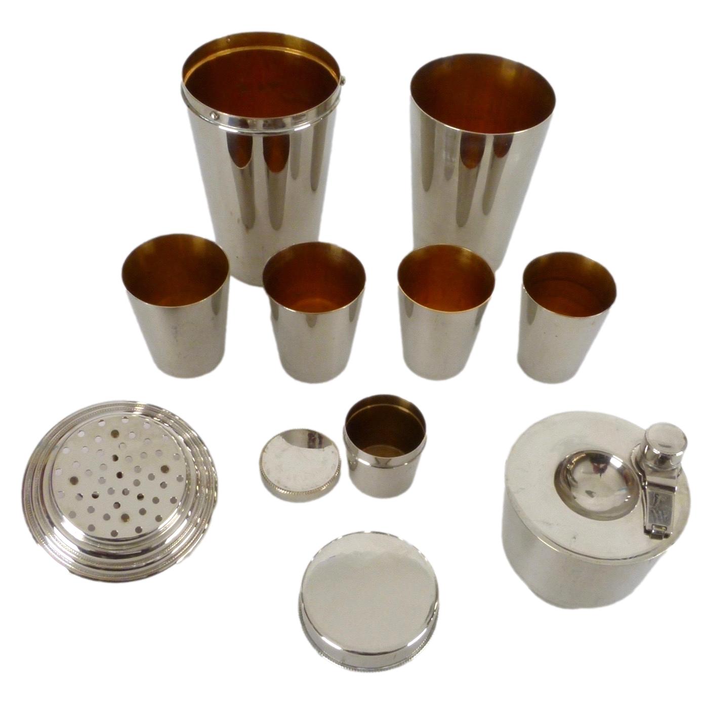 1930s Chromium with gold wash 11 piece travel cocktail shaker set from Germany that all nests inside 1 container. The set includes: 2 Lg cups, 4 Sm cups, Flask, Lidded container (for olives, etc), Juicer, Strainer And Lid.