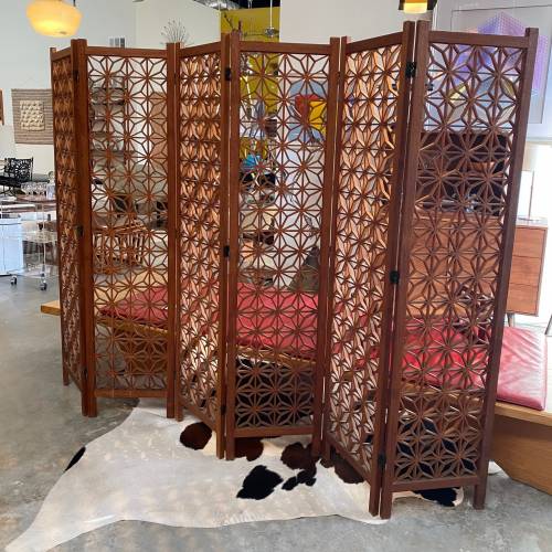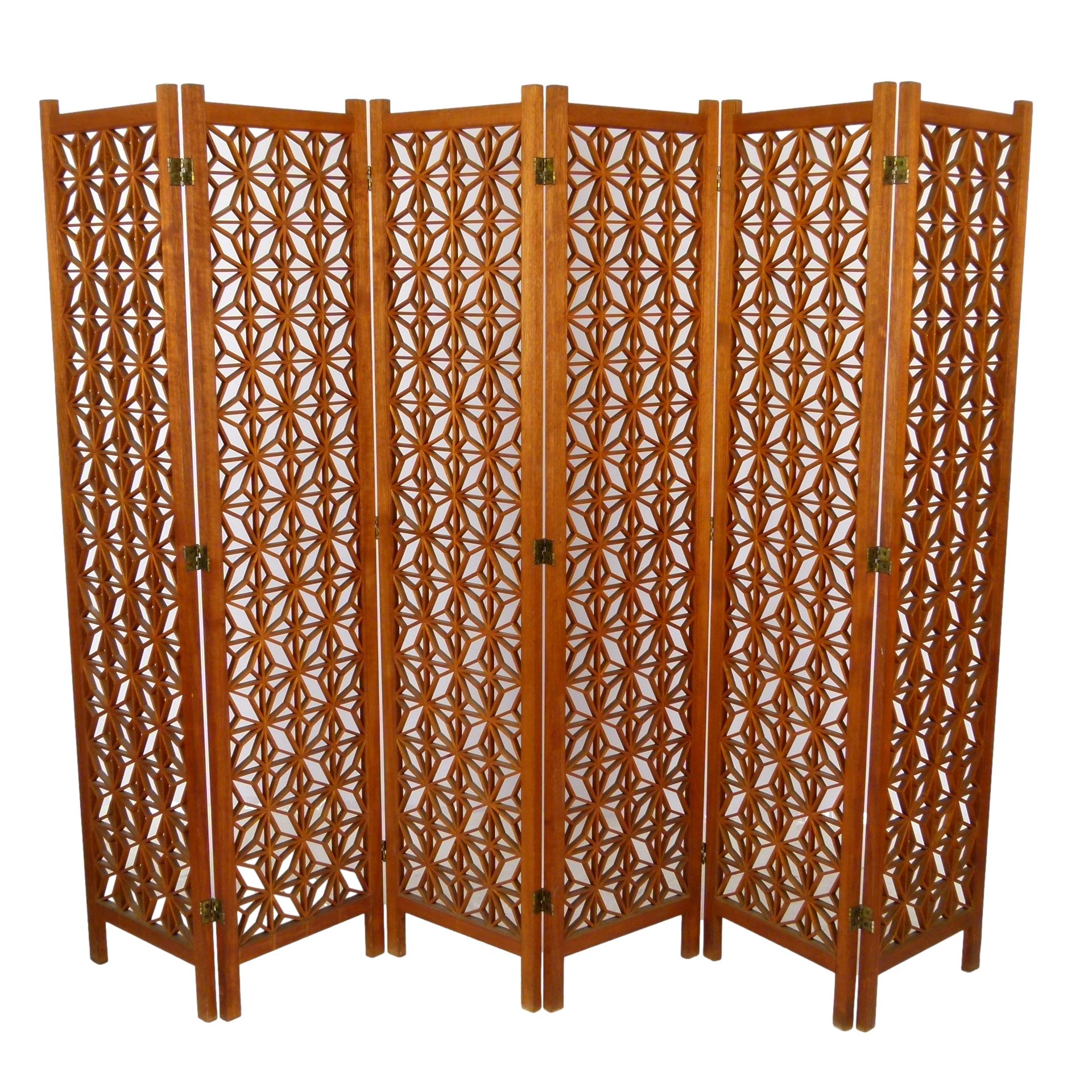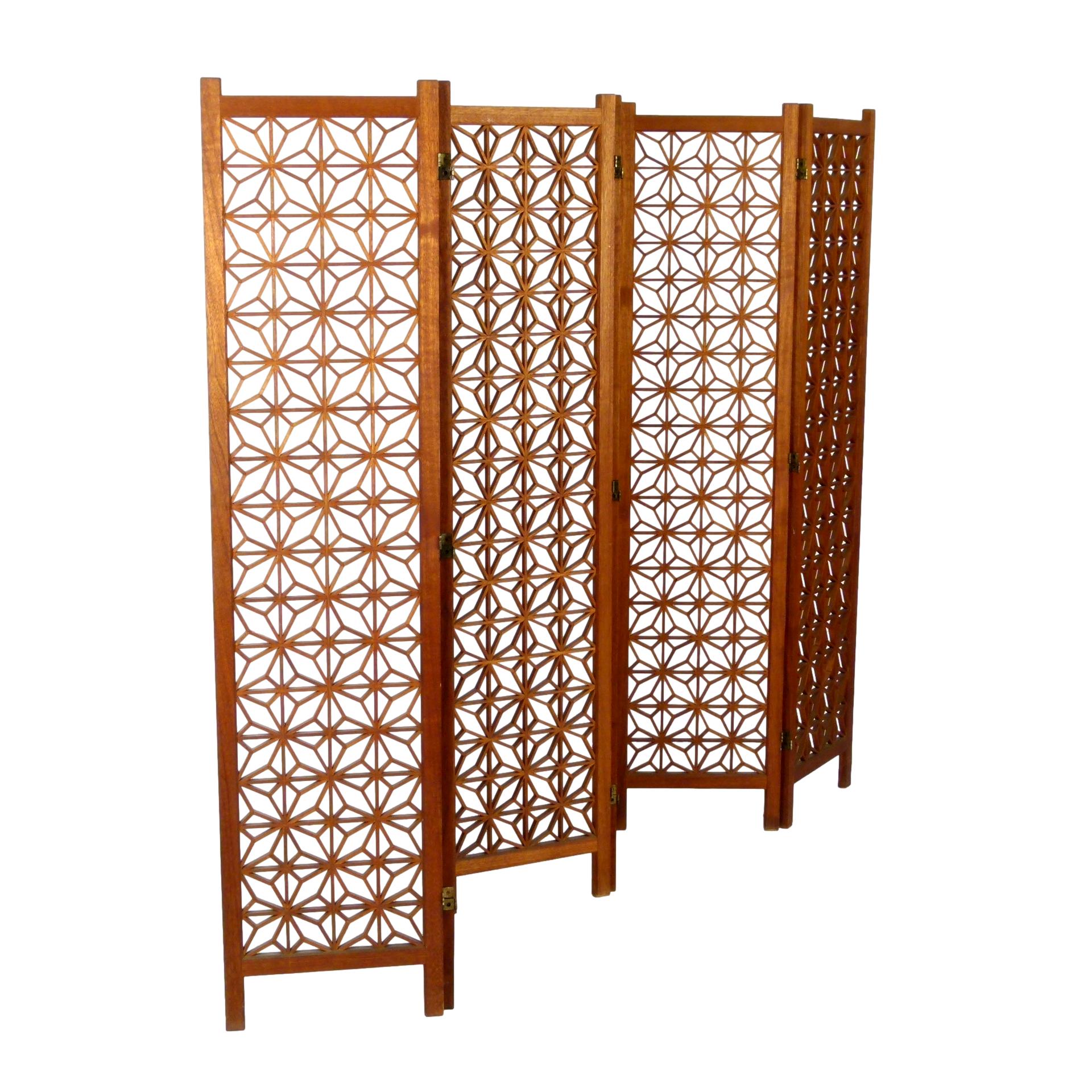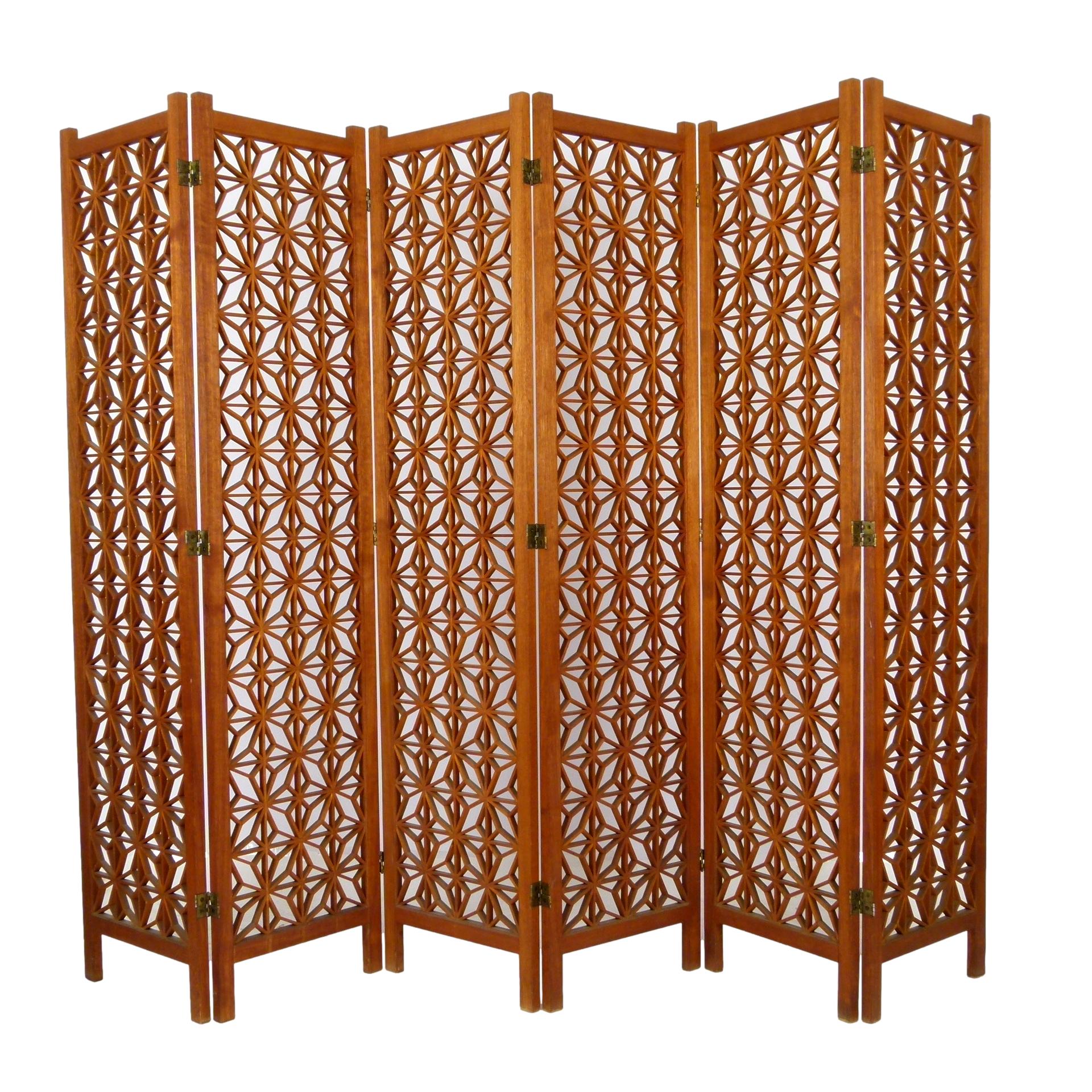 1960s six panel teak folding screen with geometric pattern.