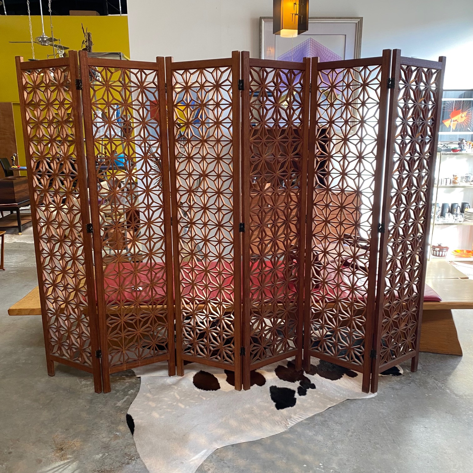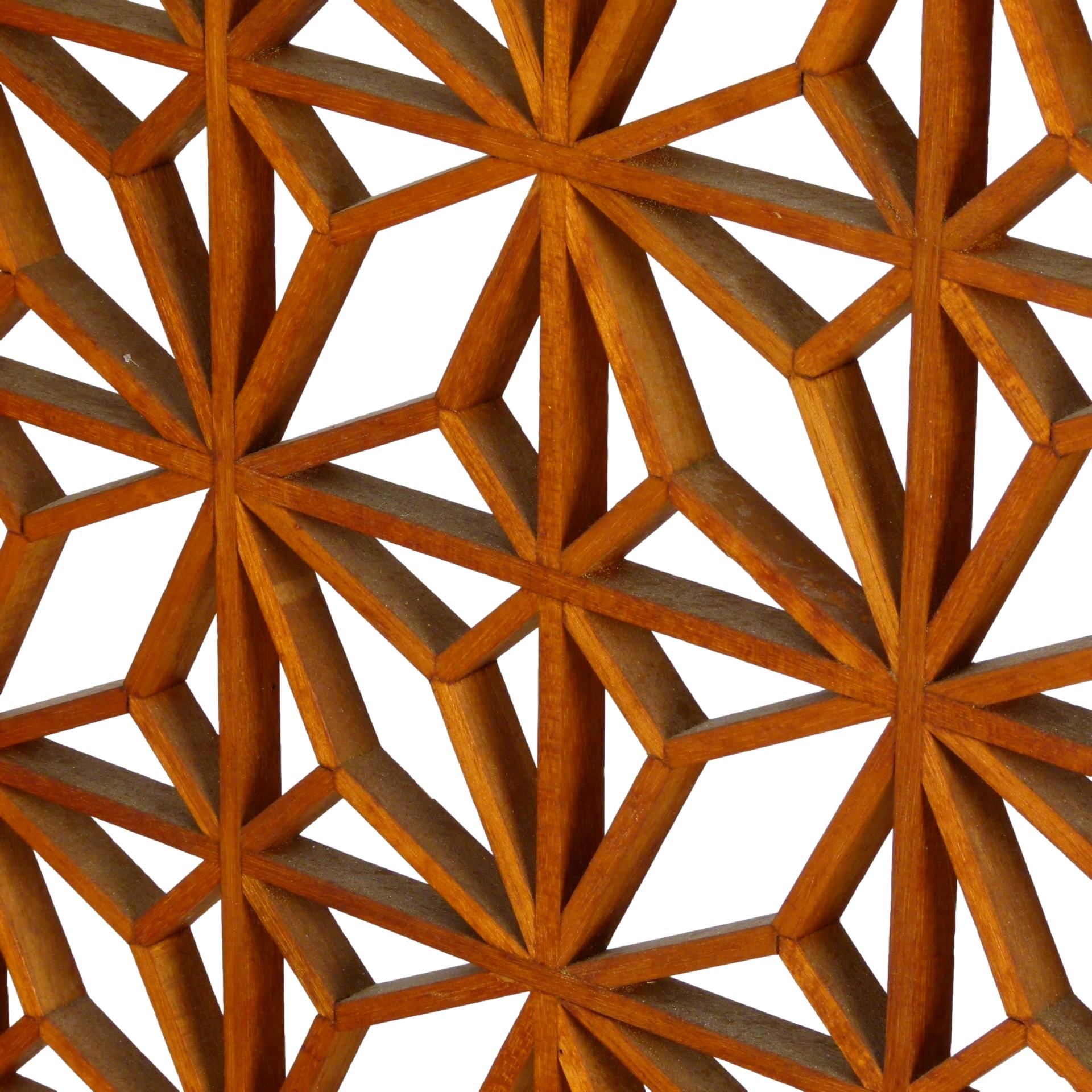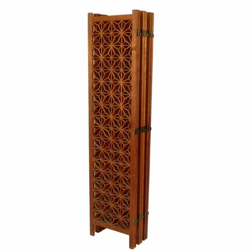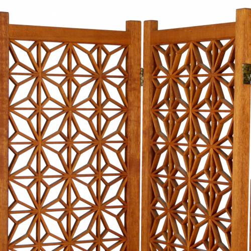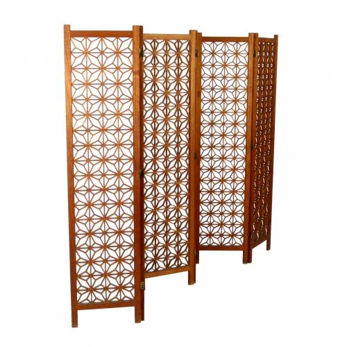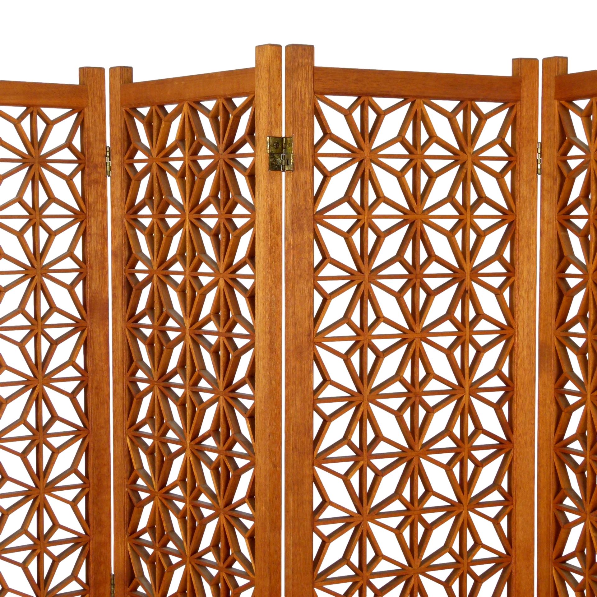 1960s six panel teak folding screen with geometric pattern.
