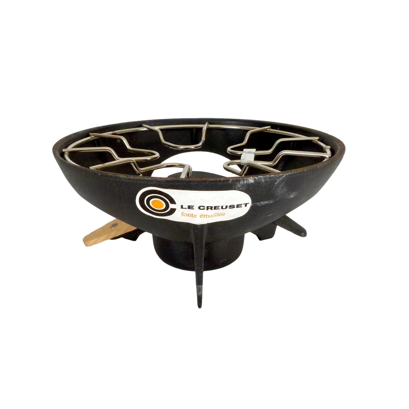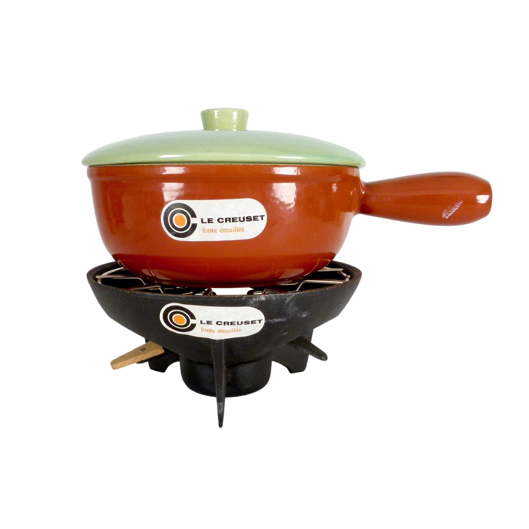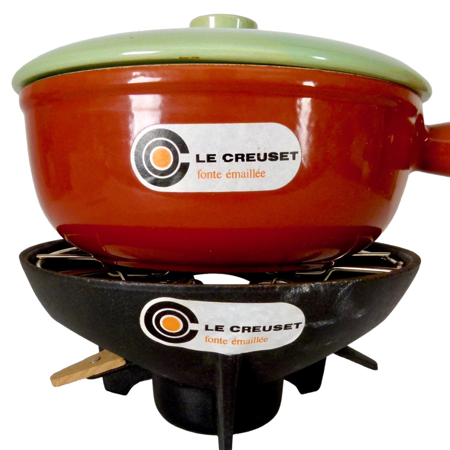 Rare 1970s Fonte Émaillée Le Creuset fondue set, with original brand stickers. Made in France