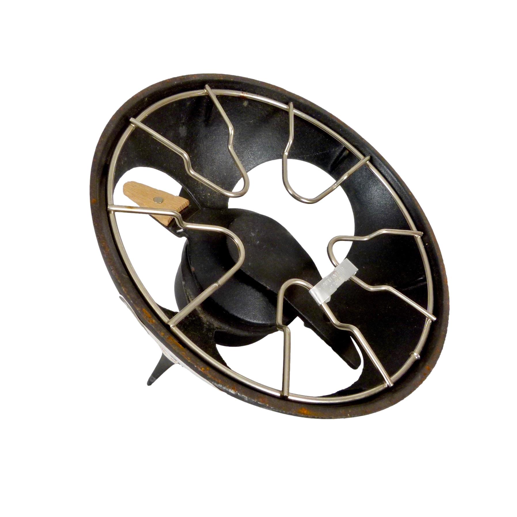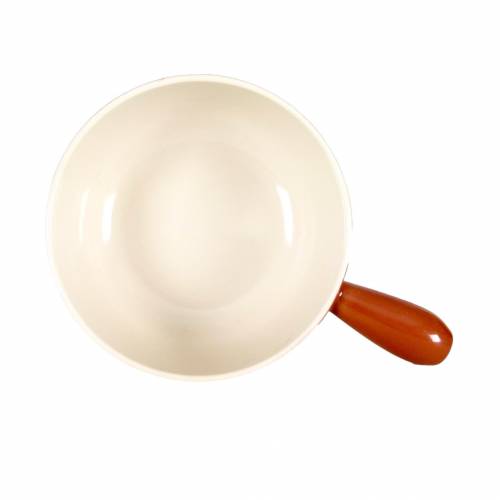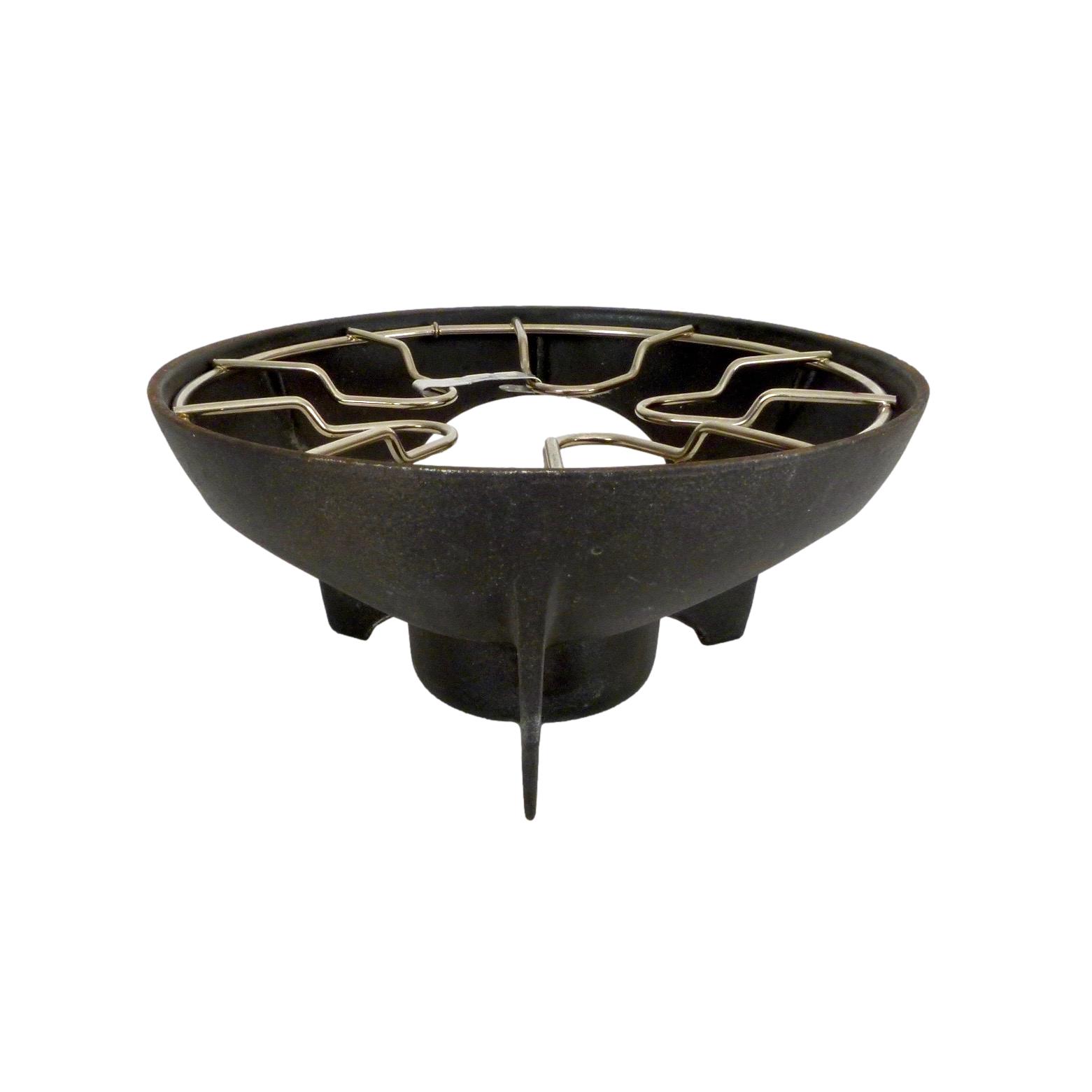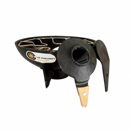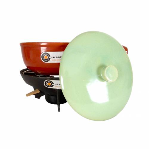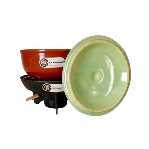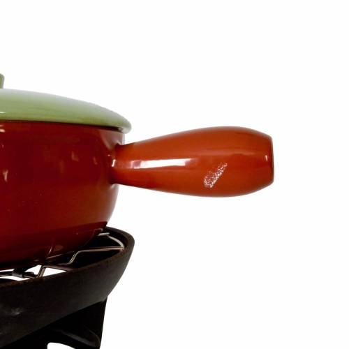 Rare 1970s Fonte Émaillée Le Creuset fondue set, with original brand stickers. Made in France