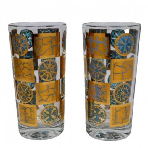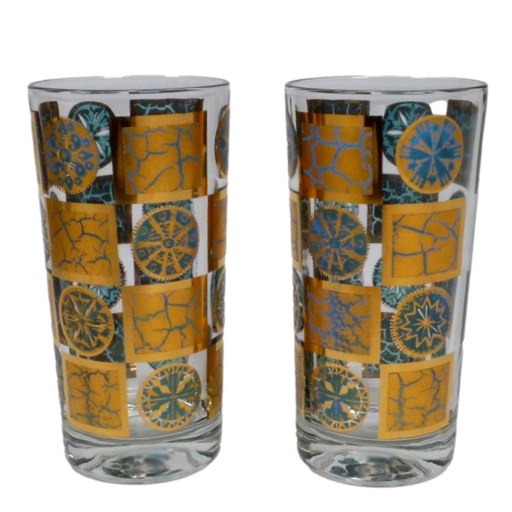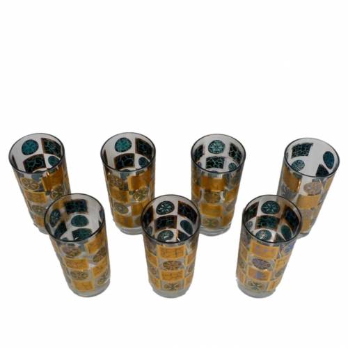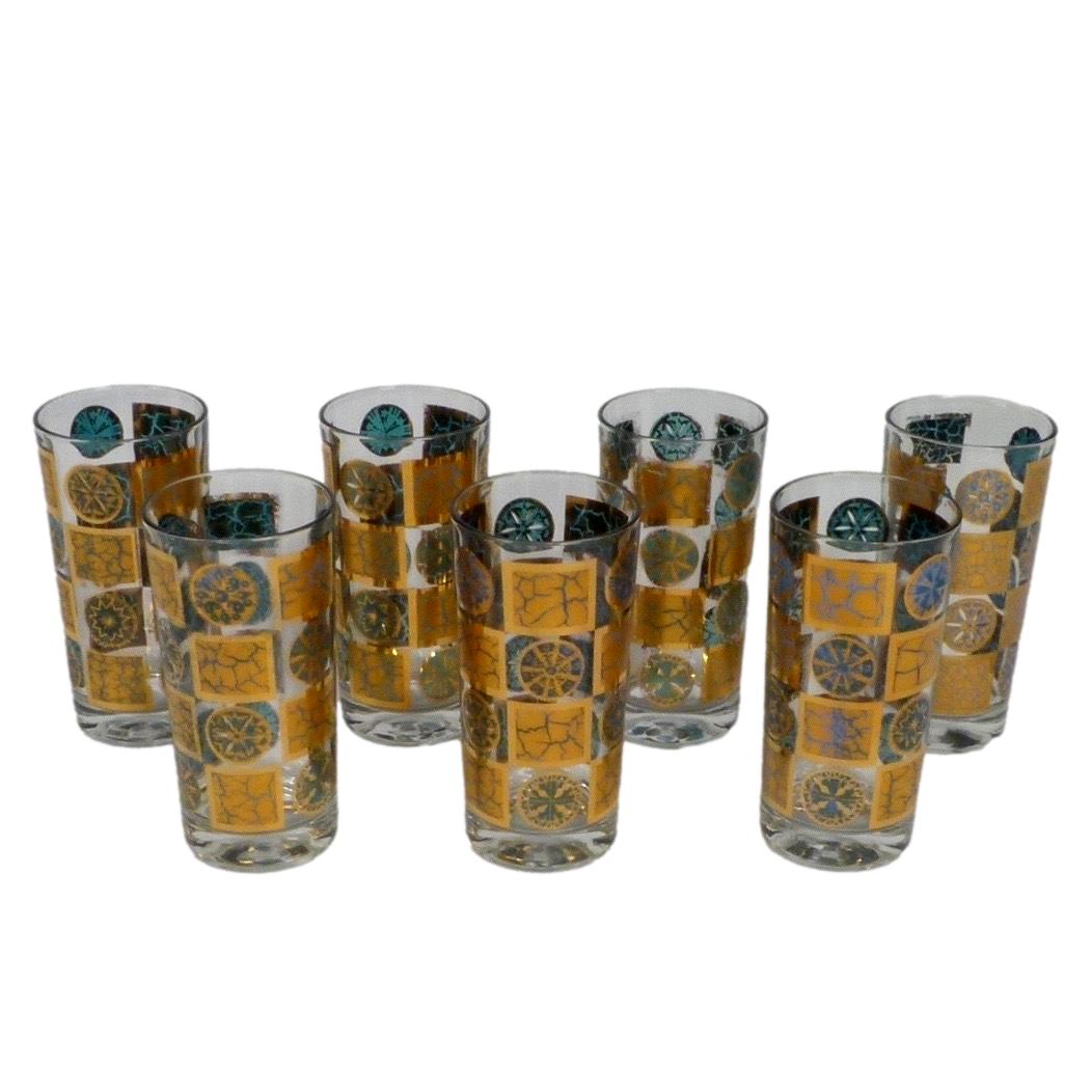 Set of 7 1960s highball glasses in the 22kt gold and blue "Carnival" pattern by Culver.