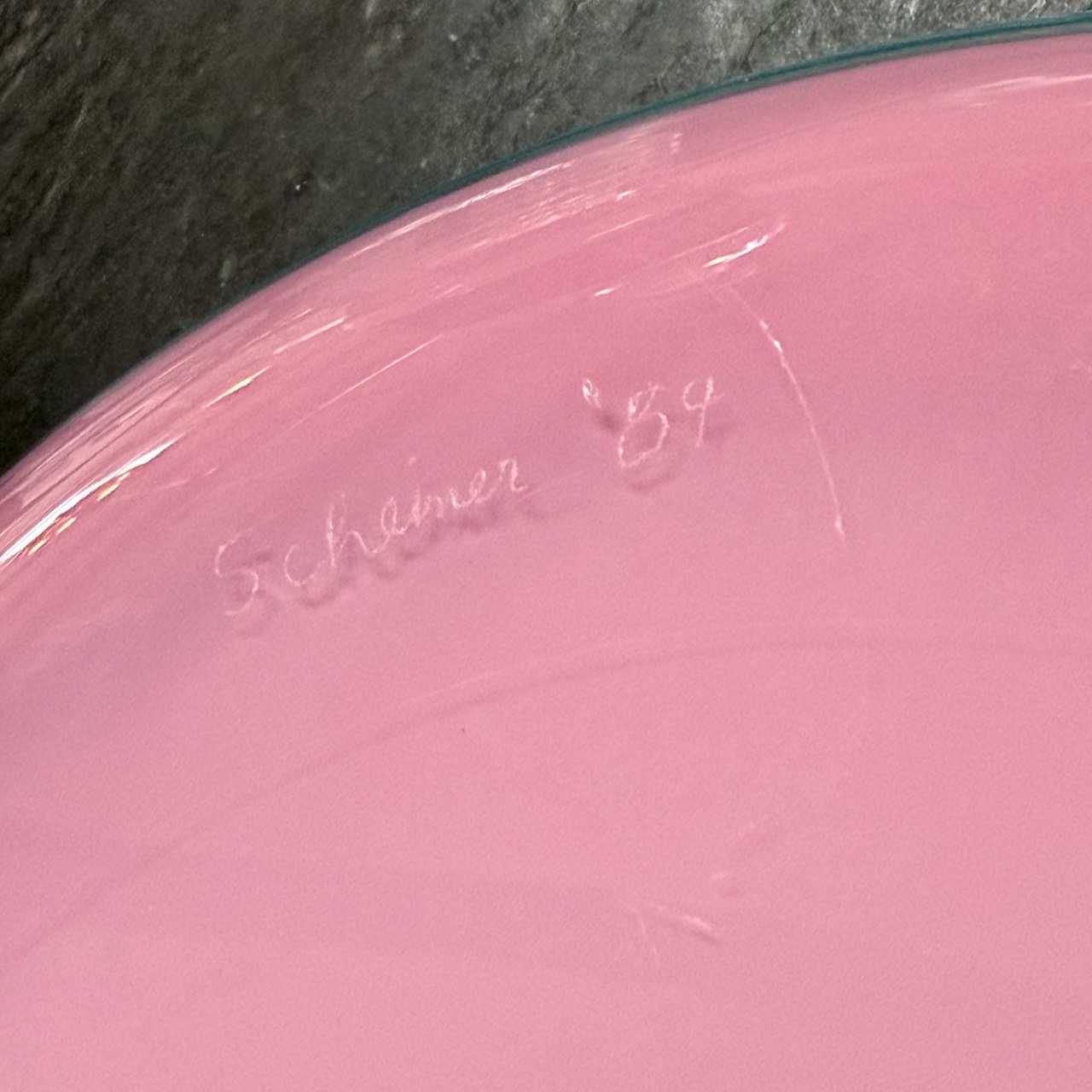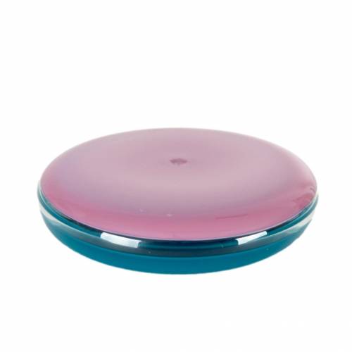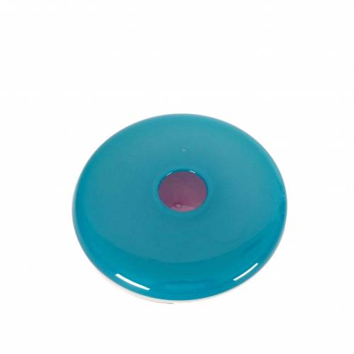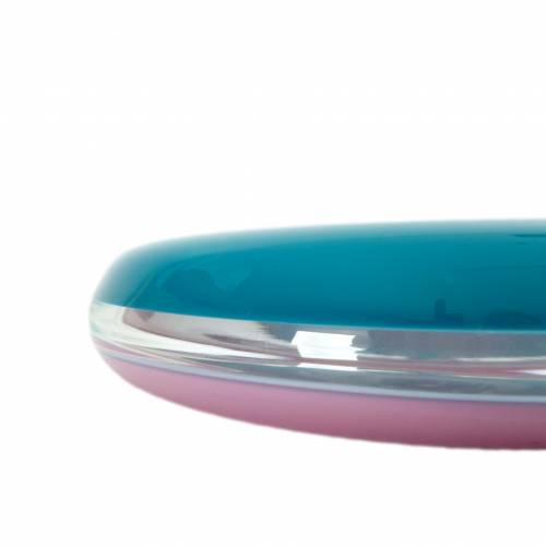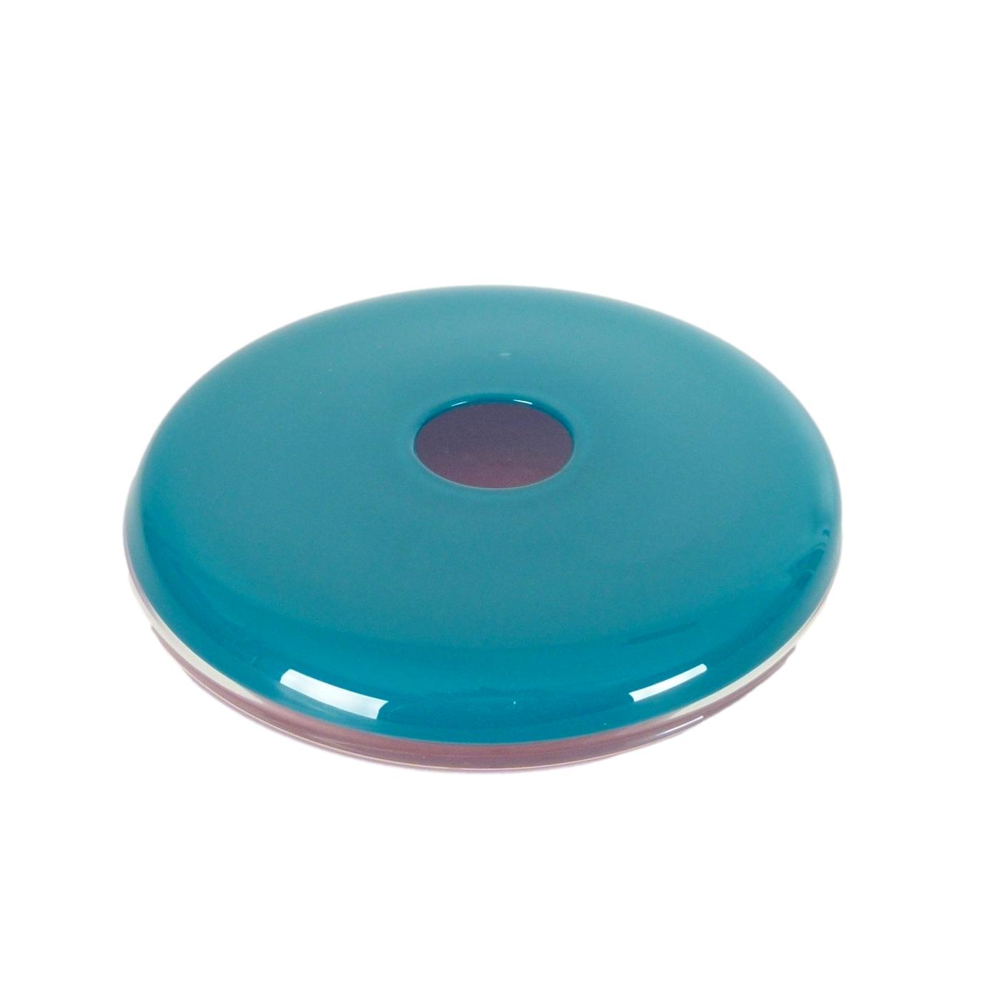 Blown glass disk style vase with a clear center flanked by teal on the top half and mauve below by Michael Scheiner (American, b. 1956), etched signature and date (1984).
