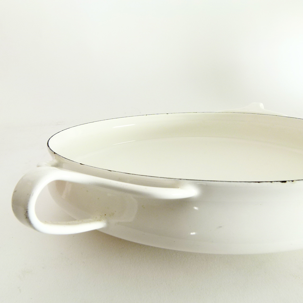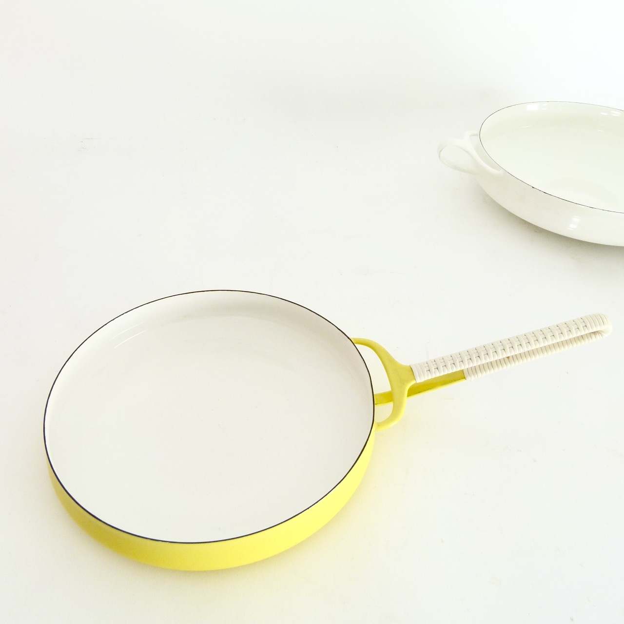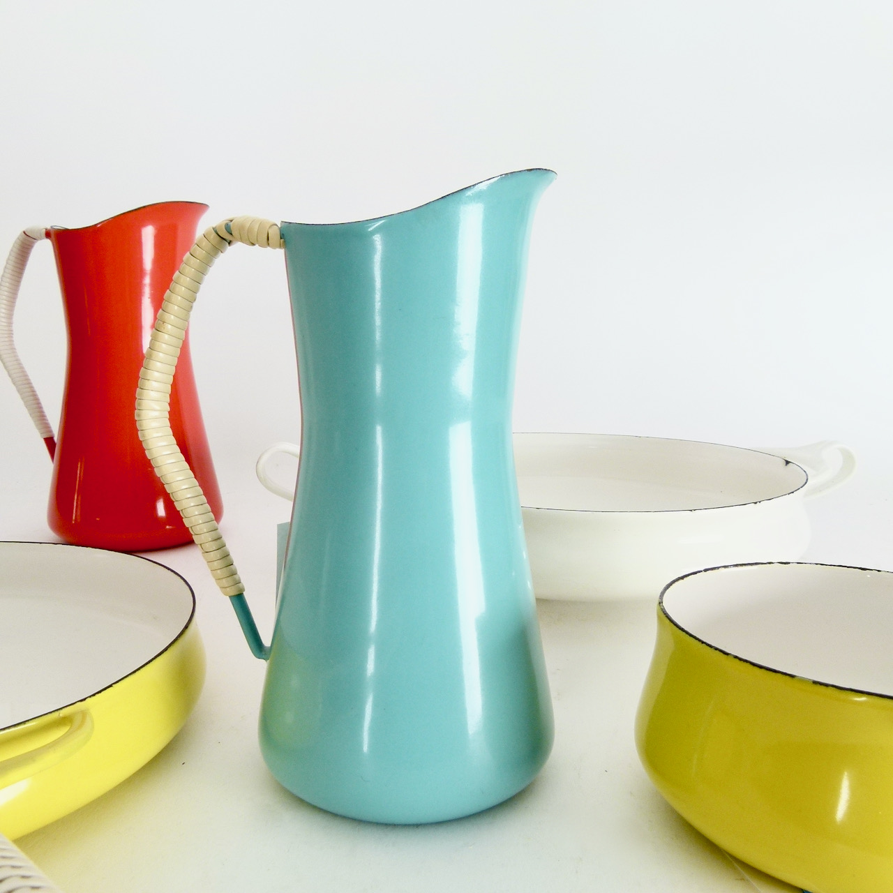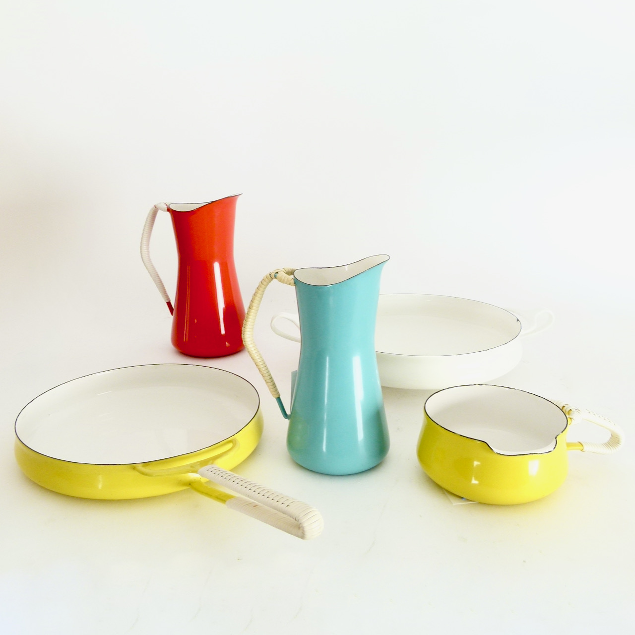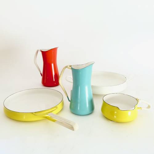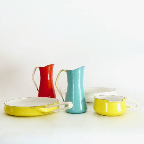 Collection of enameled steel cook and serve ware pieces from Jens Quistgaard's Kobenstyle line by Dansk, most from the late 1950s or early 60s. We always have a revolving variety of Kobenstyle pieces, let us know if you're looking for a specific piece or color. Sold separately: