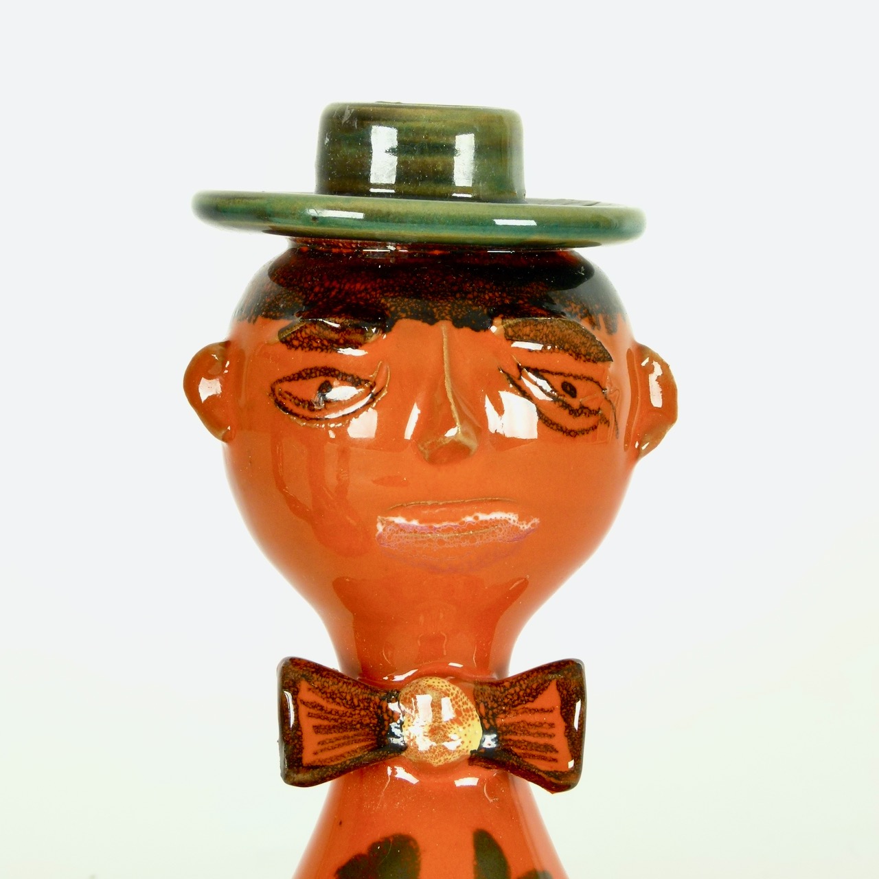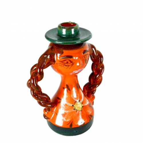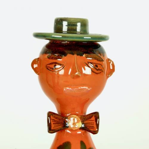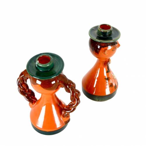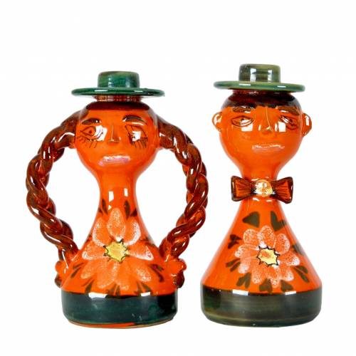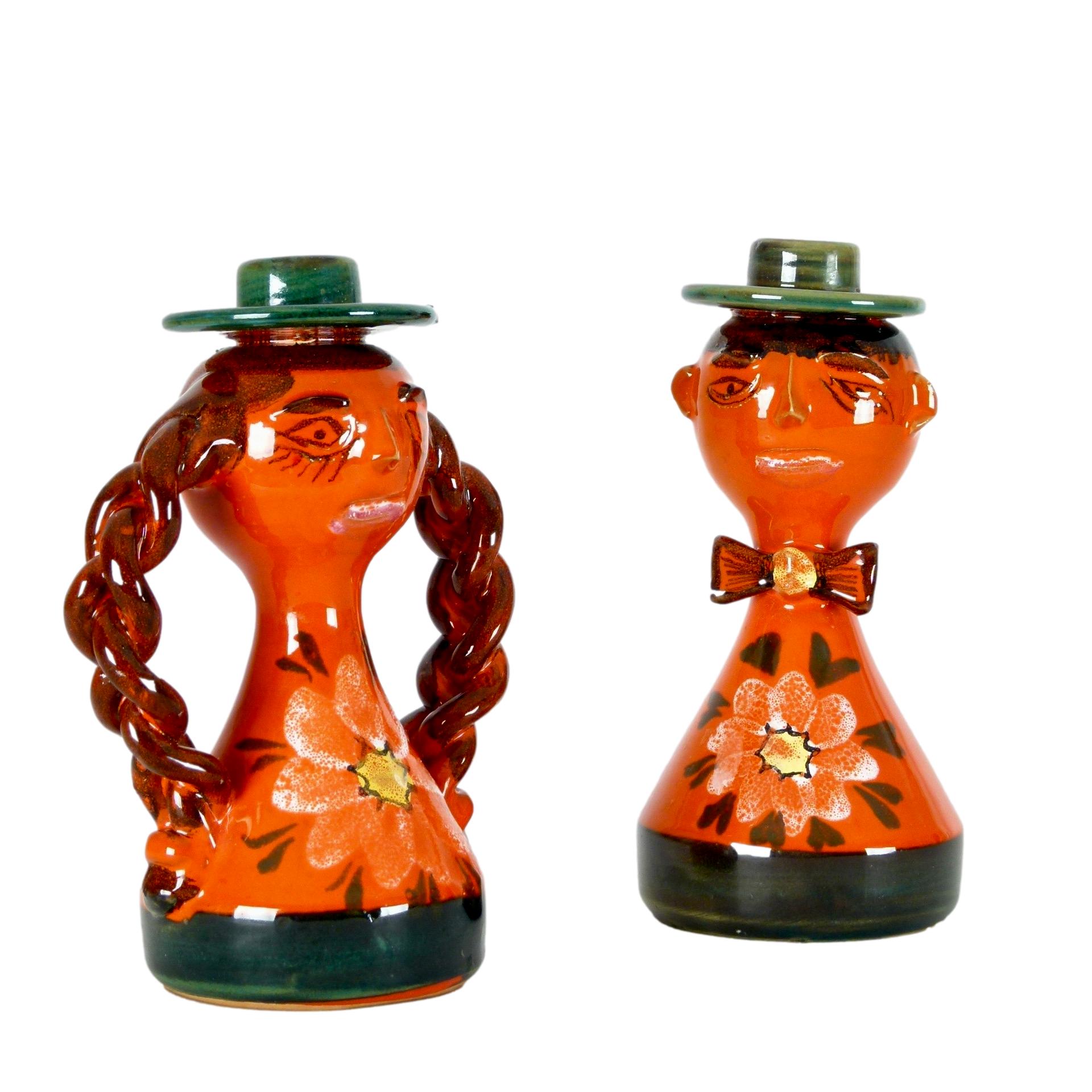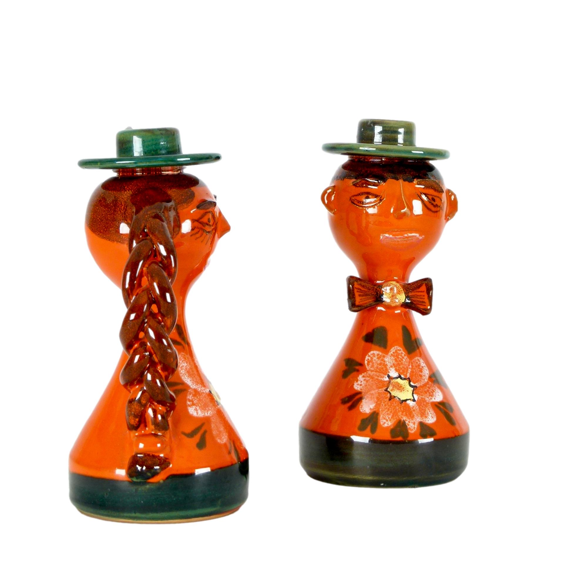 Male and Female figure candle holders in handglazed glazed stoneware from Italy, c.1970. Standard size taper candle fits in each figure's hat.
