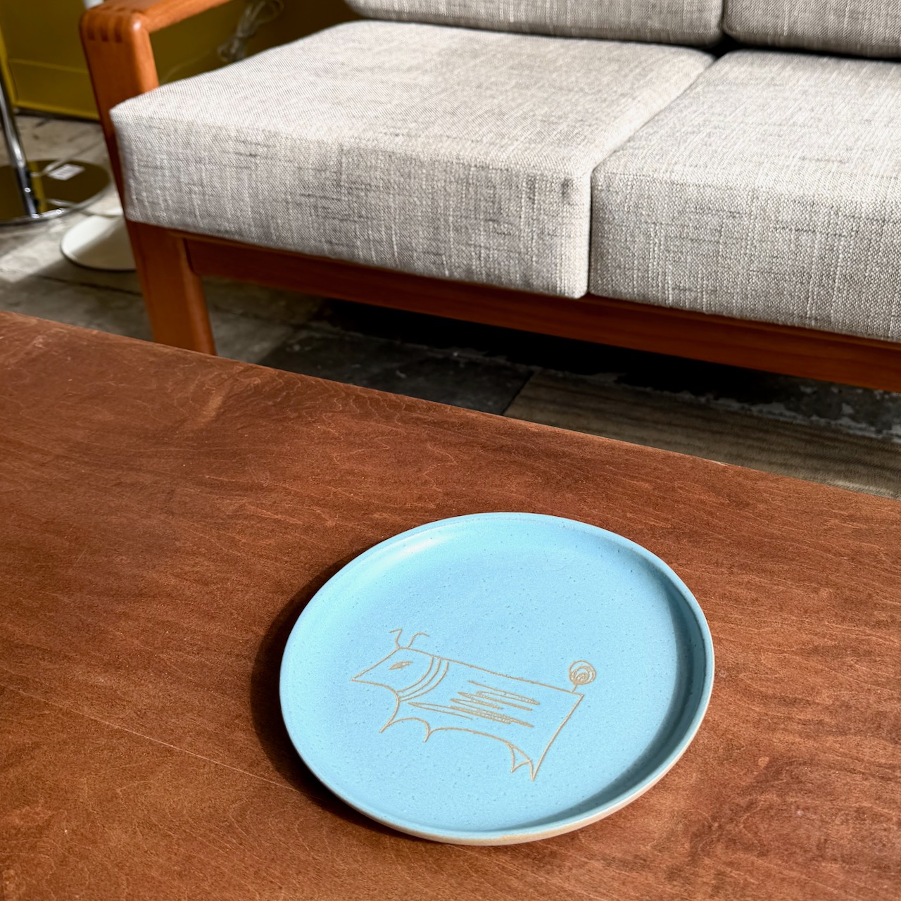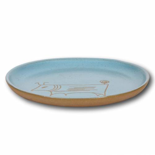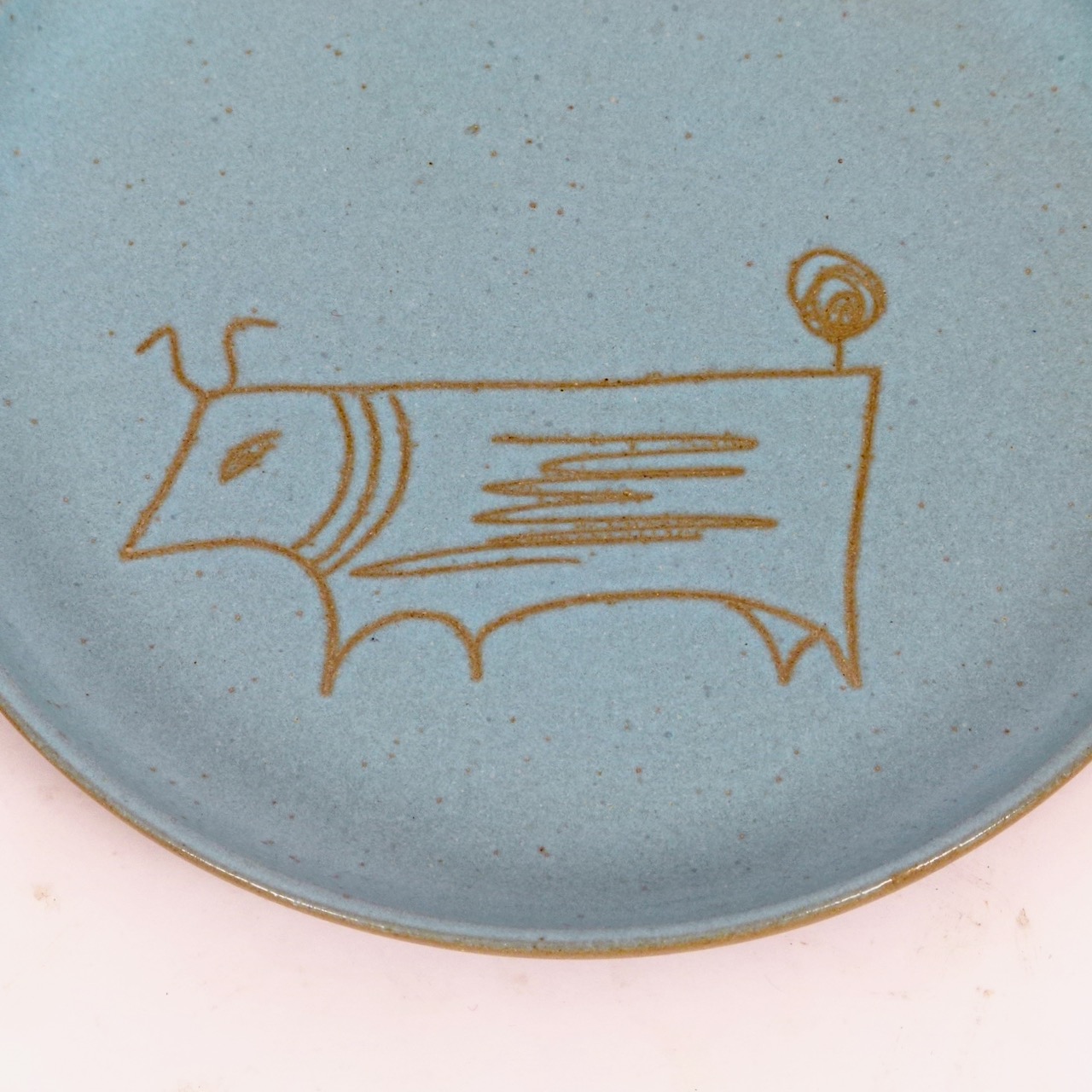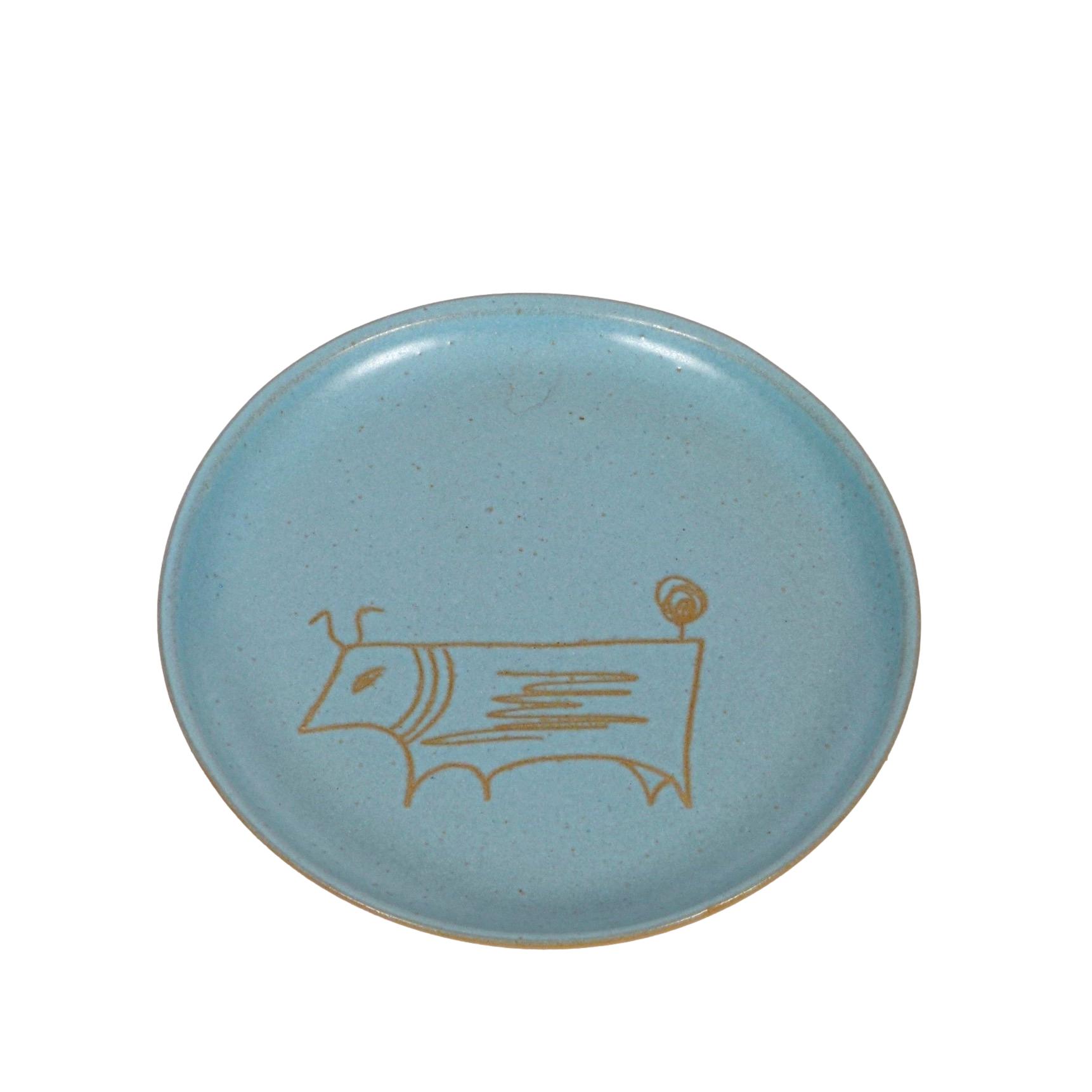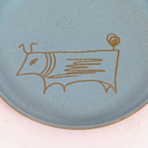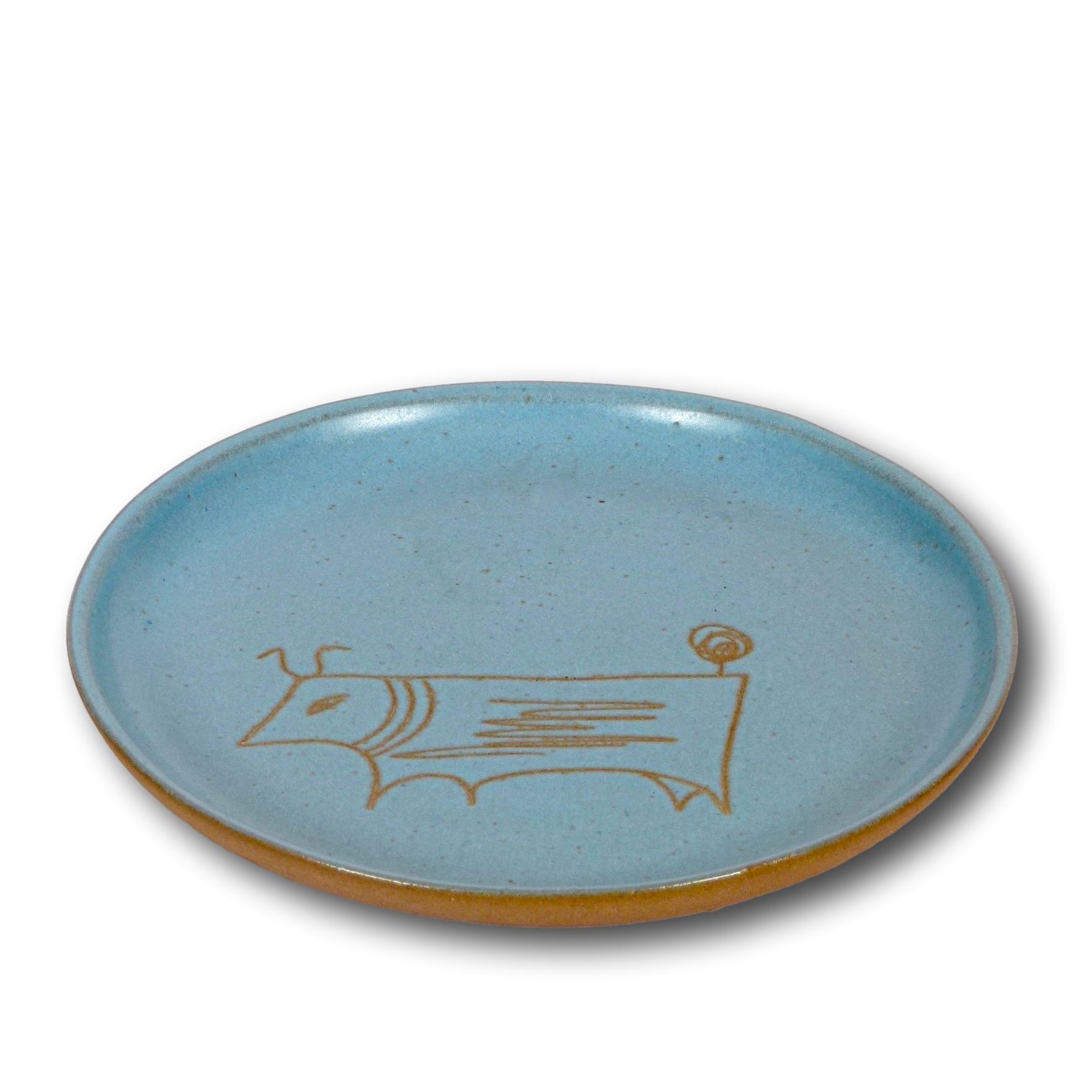 Stoneware plate with drawn stylized bull figure by Gordon Martz for Marshall Studios, etch signed on back.