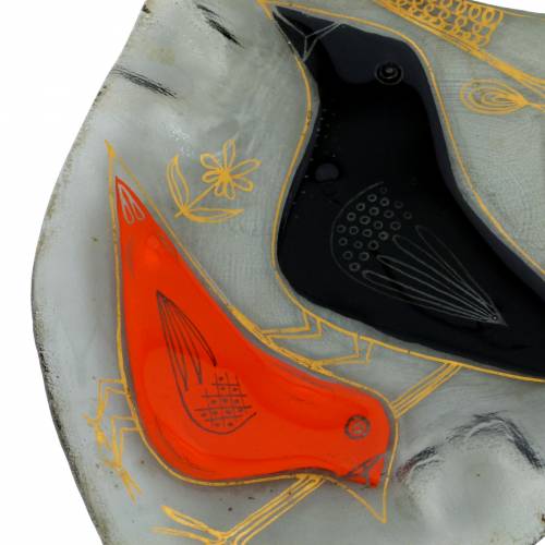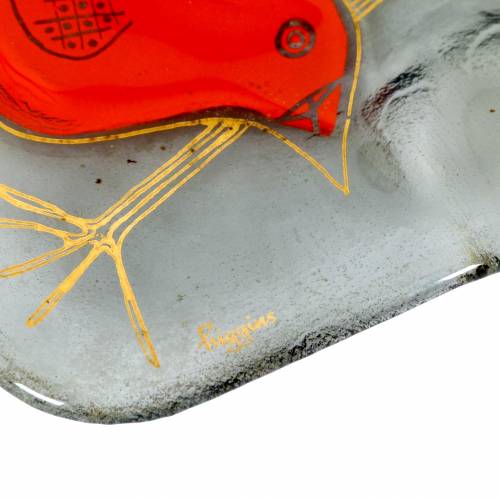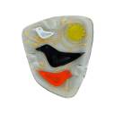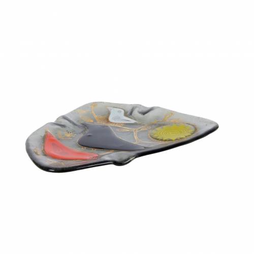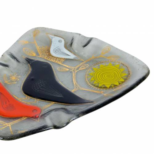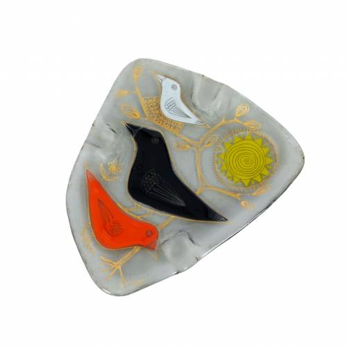 Slumped, smoked glass dish/ash tray by Michael and Frances Higgins with stylized birds, tree, and sun design, 1960s.