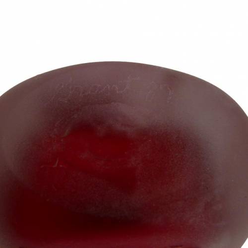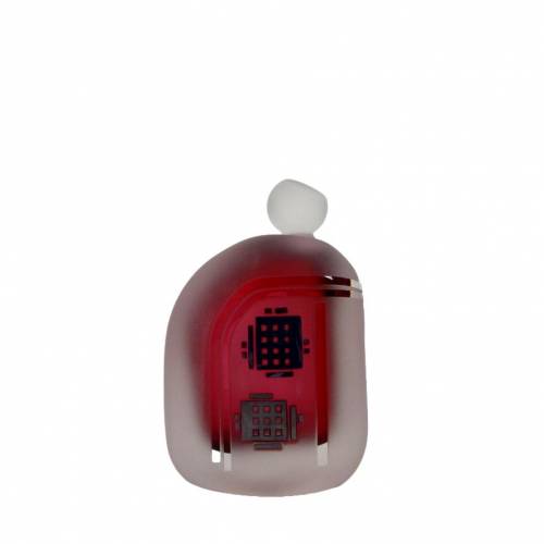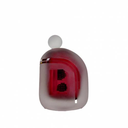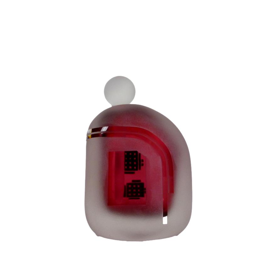 C.1980 studio art glass perfume bottle in frosted cranberry red glass with carved silver glass overlay and clear ball stopper by Jim and Connie Grant, California, signed on base.
