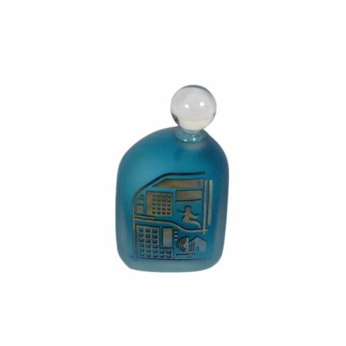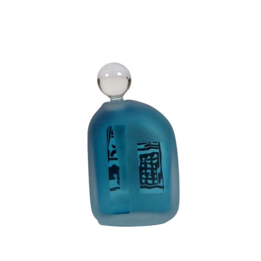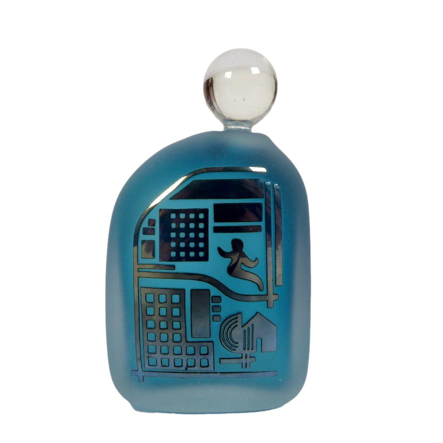 Frosted blown art glass with architecturally designed carved silver glass overlay by Jim and Connie Grant from their Celestial Art Glass Studio, c.1980, California, signed Grant on base. We have (and will continue to list) a large collection of bespoke art glass perfume bottles including several others by Jim and Connie Grant.