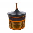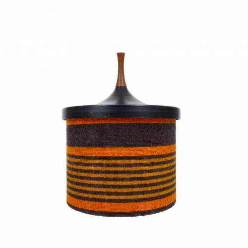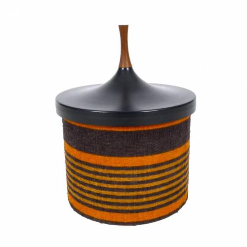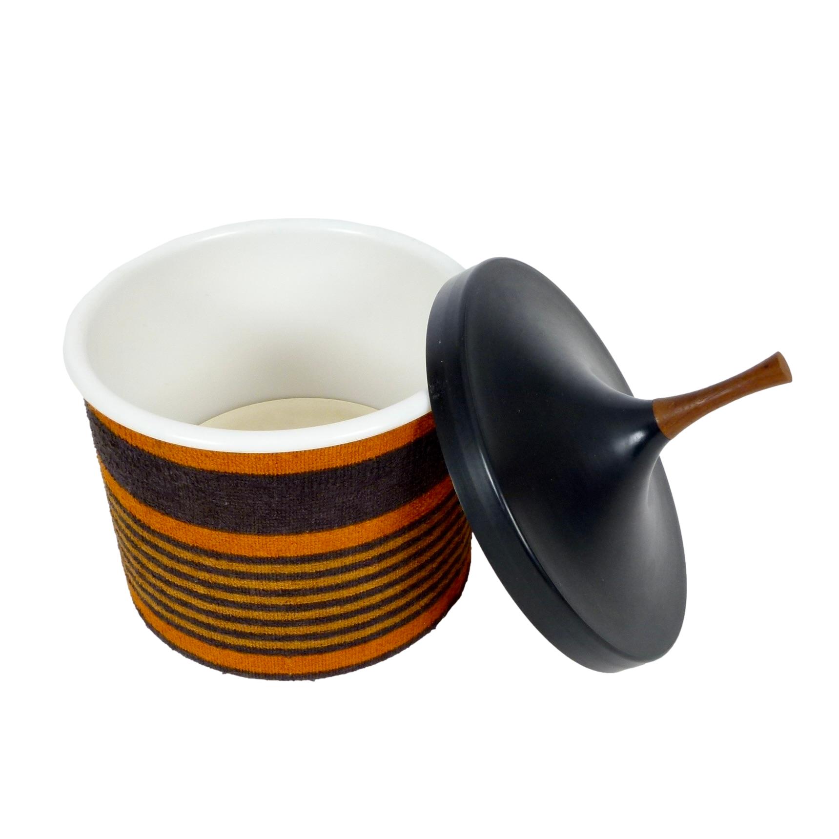 1960s striped terry cloth wrapped ABS injection molded plastic ice bucket with cork base, liner, and walnut top by Laurids Lønbørg, Denmark.