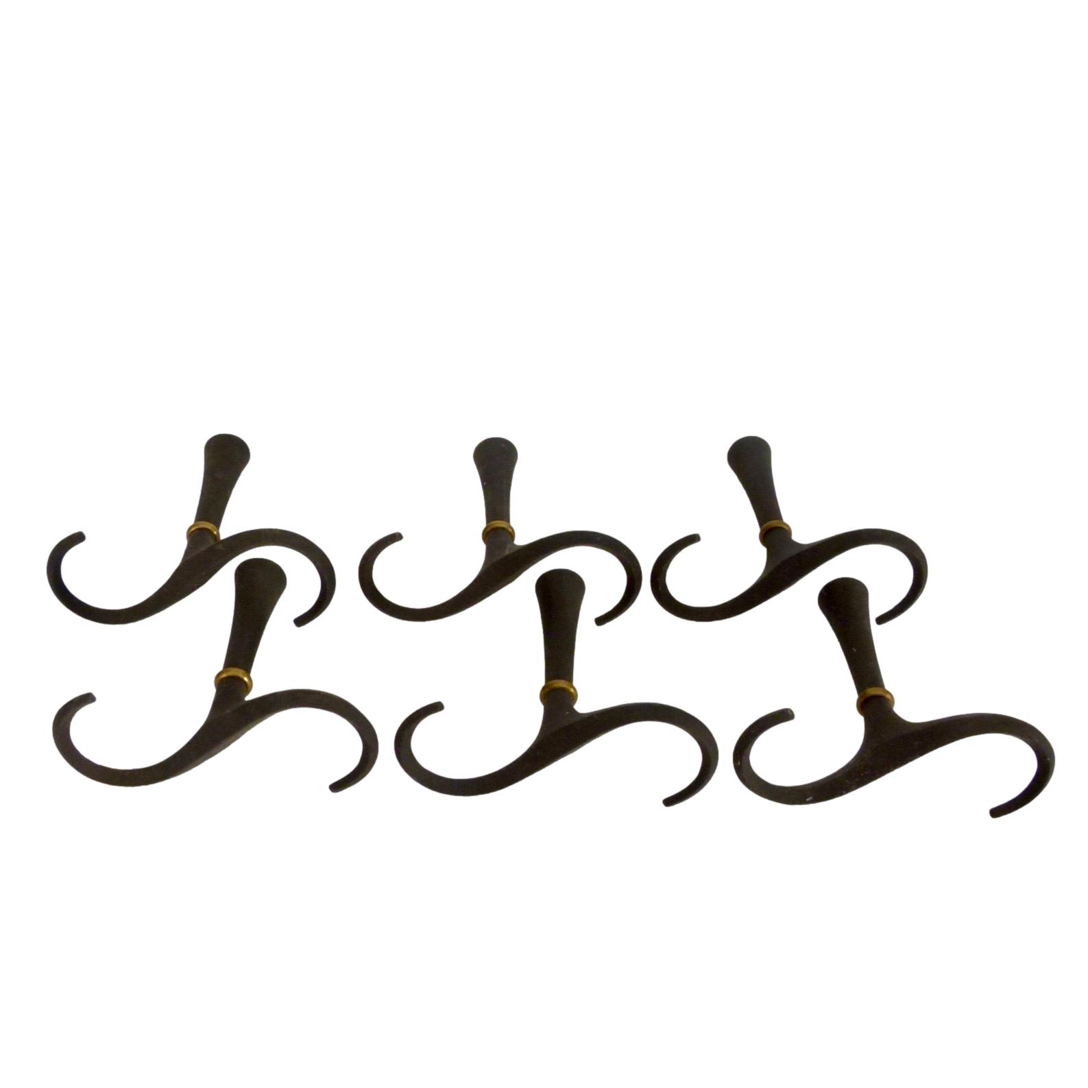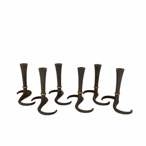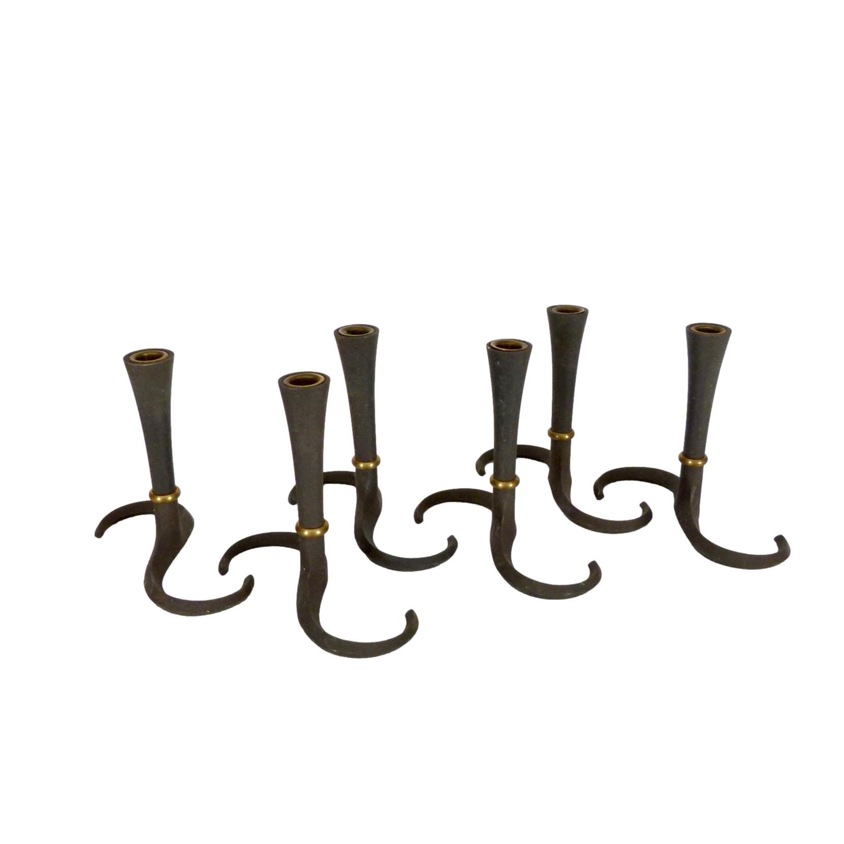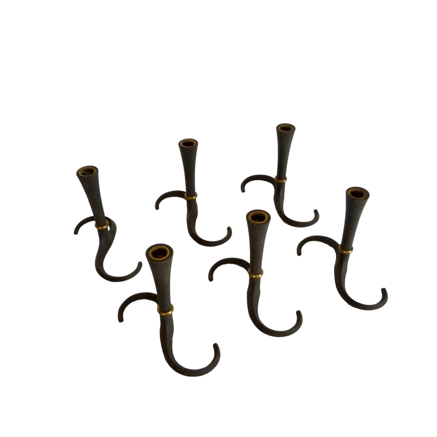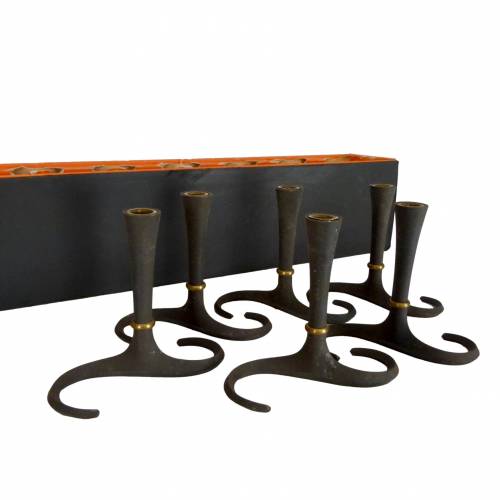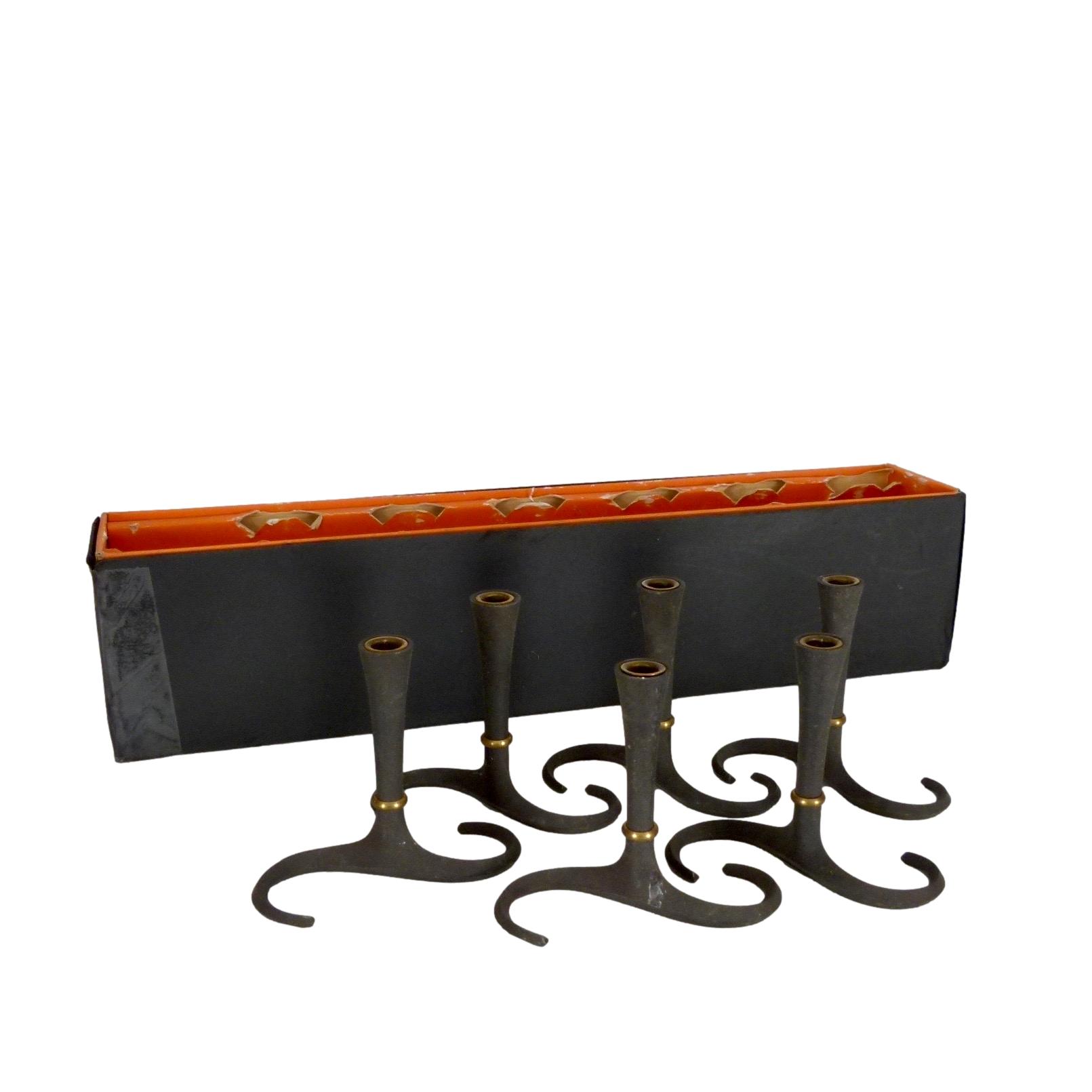 1960s cast iron candle holders with brass detail designed by Jens Quistgaard for Dansk, set of 6 in original box.