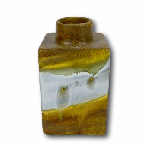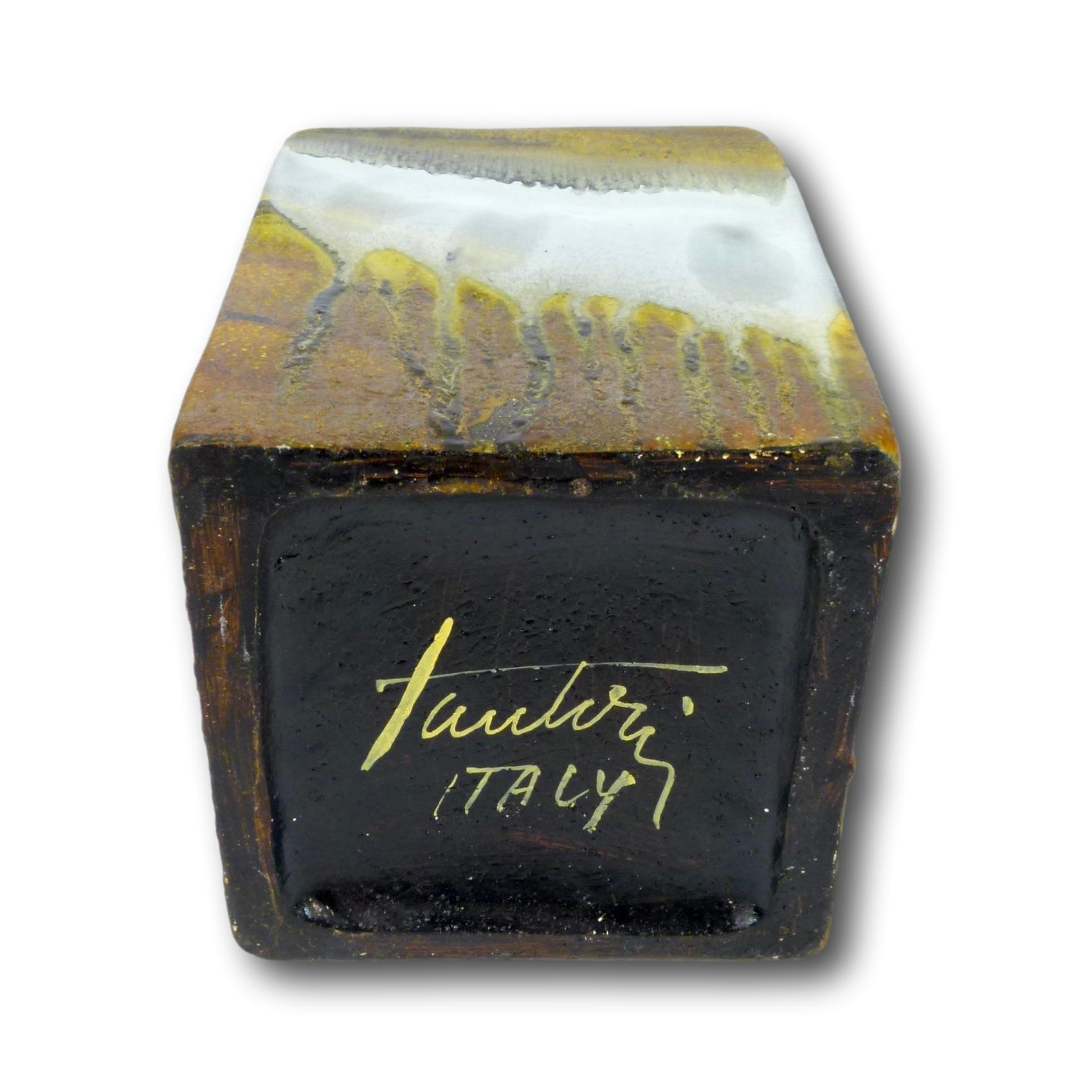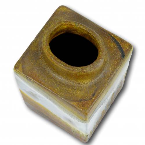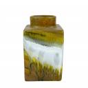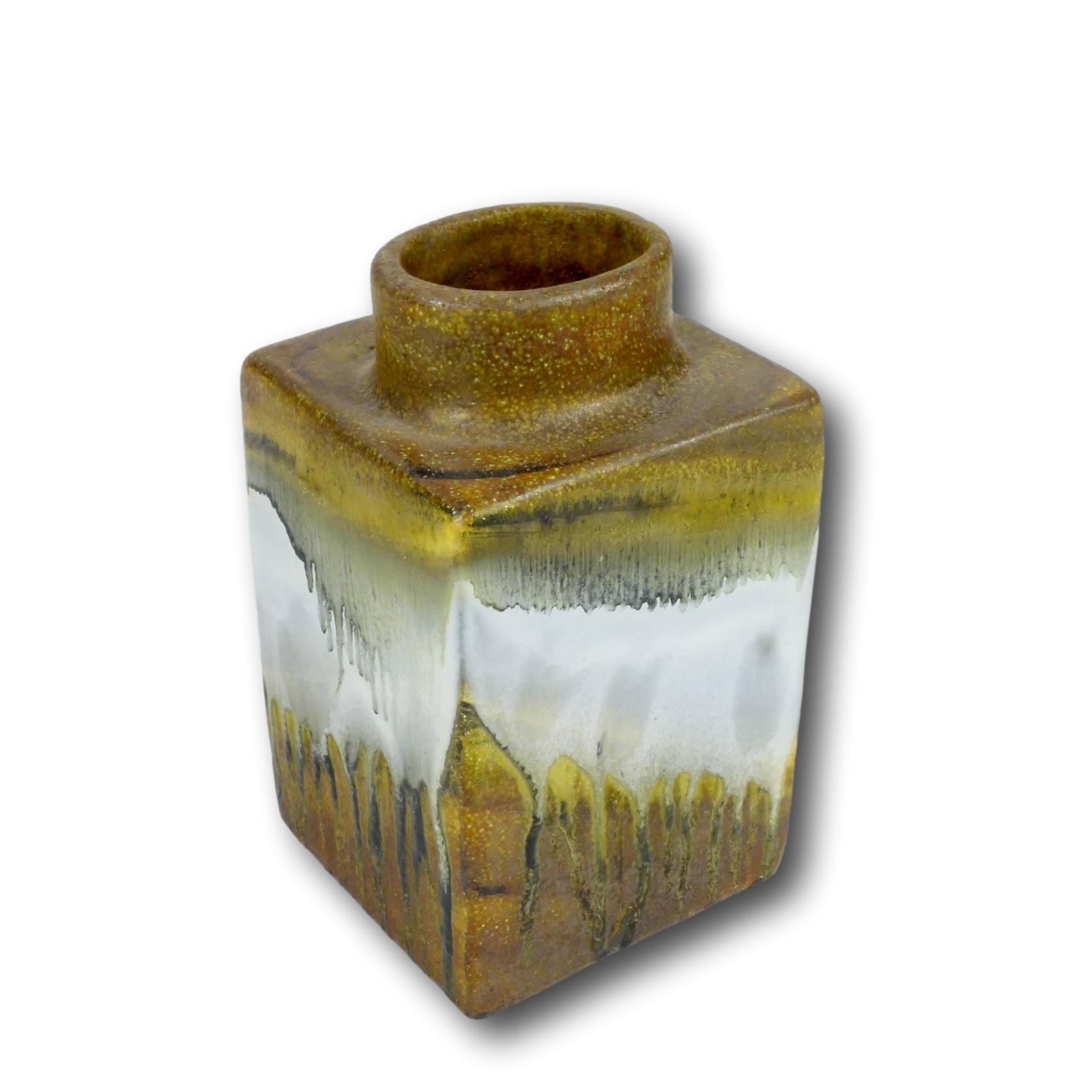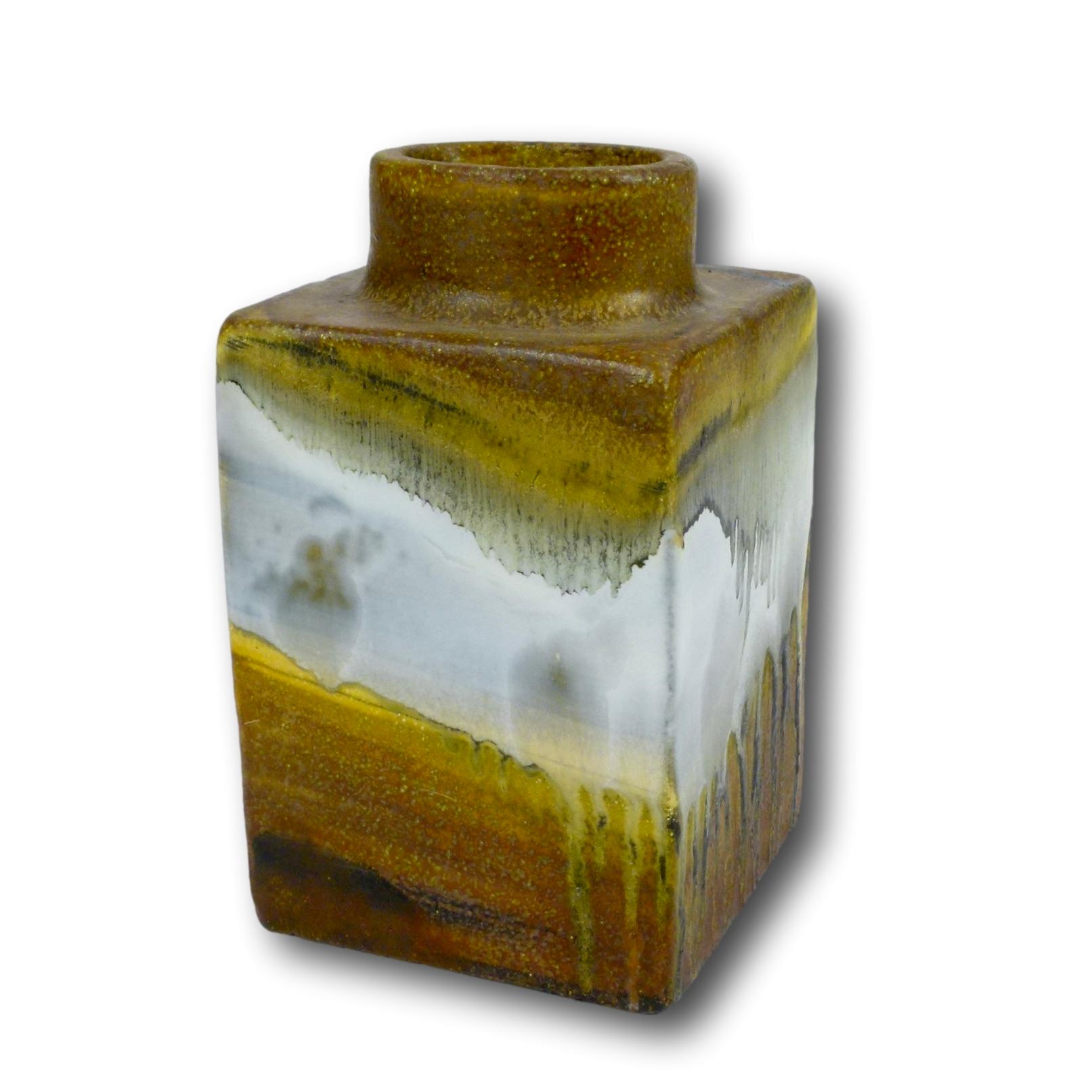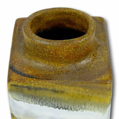 1970 square ceramic vase with oval neck and painterly mix of matte and gloss glaze by Marcello Fantoni, Italy. This striking vase has been in one private collection since originally purchased through a New Orleans gallery in 1971.