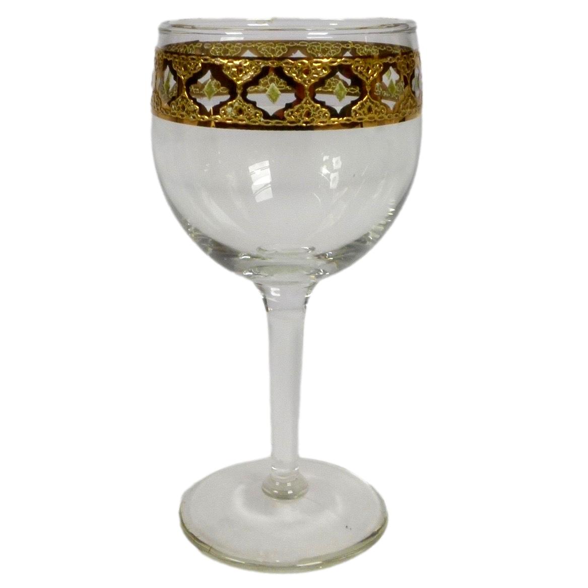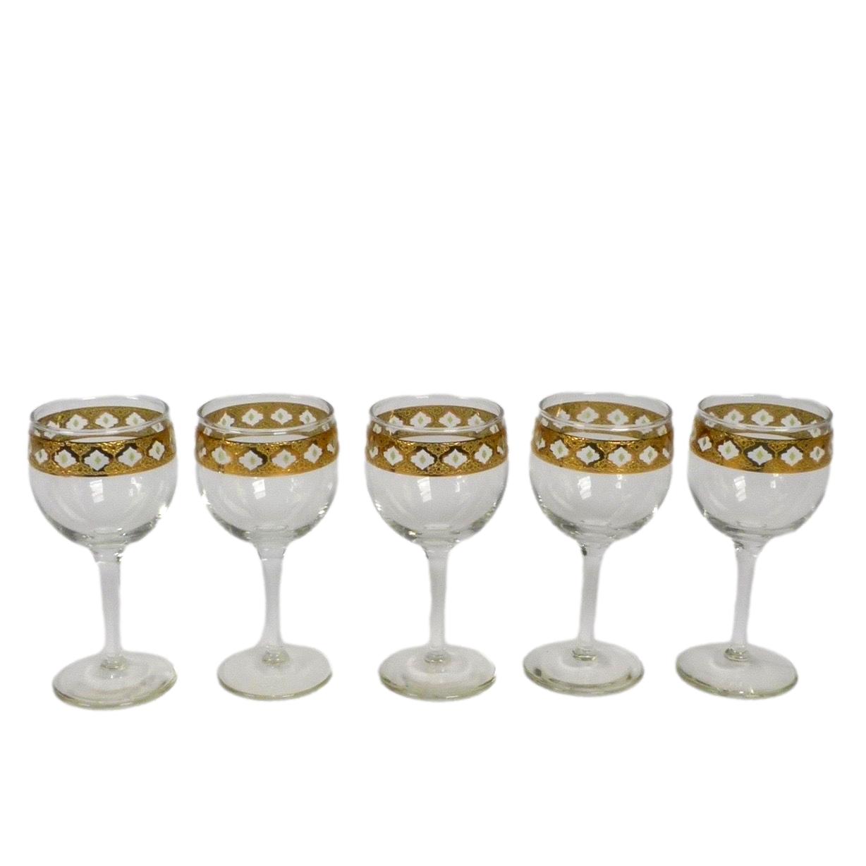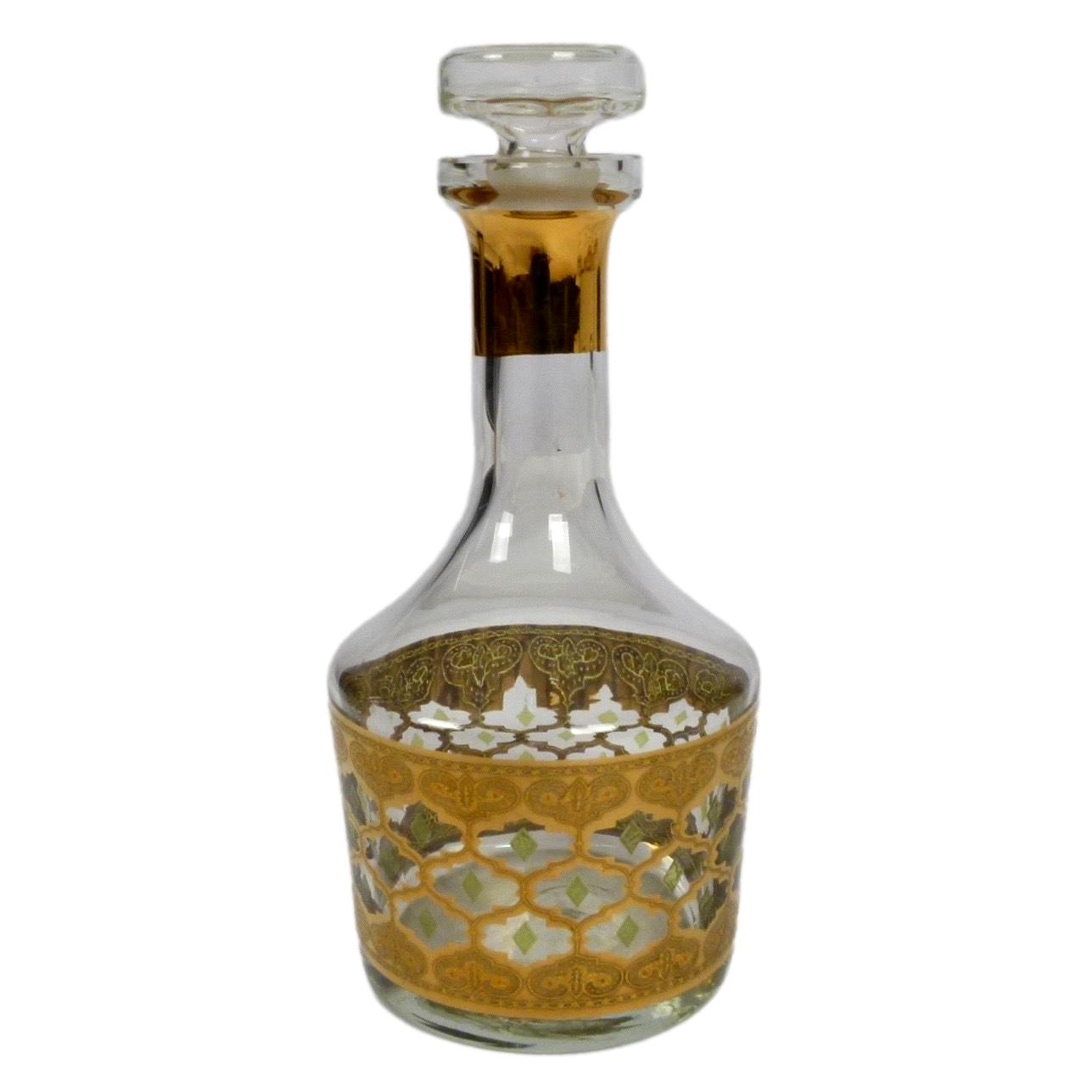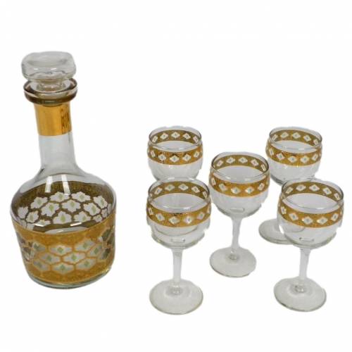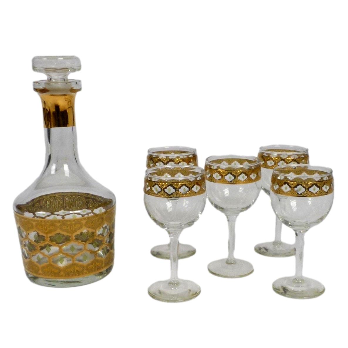1960s decanter and 5 glasses cocktail set in the 22kt gold and green "Valencia" pattern by Culver.
