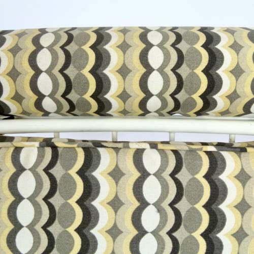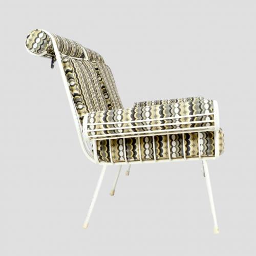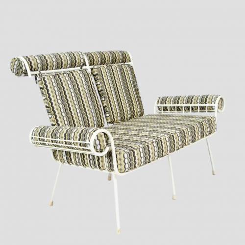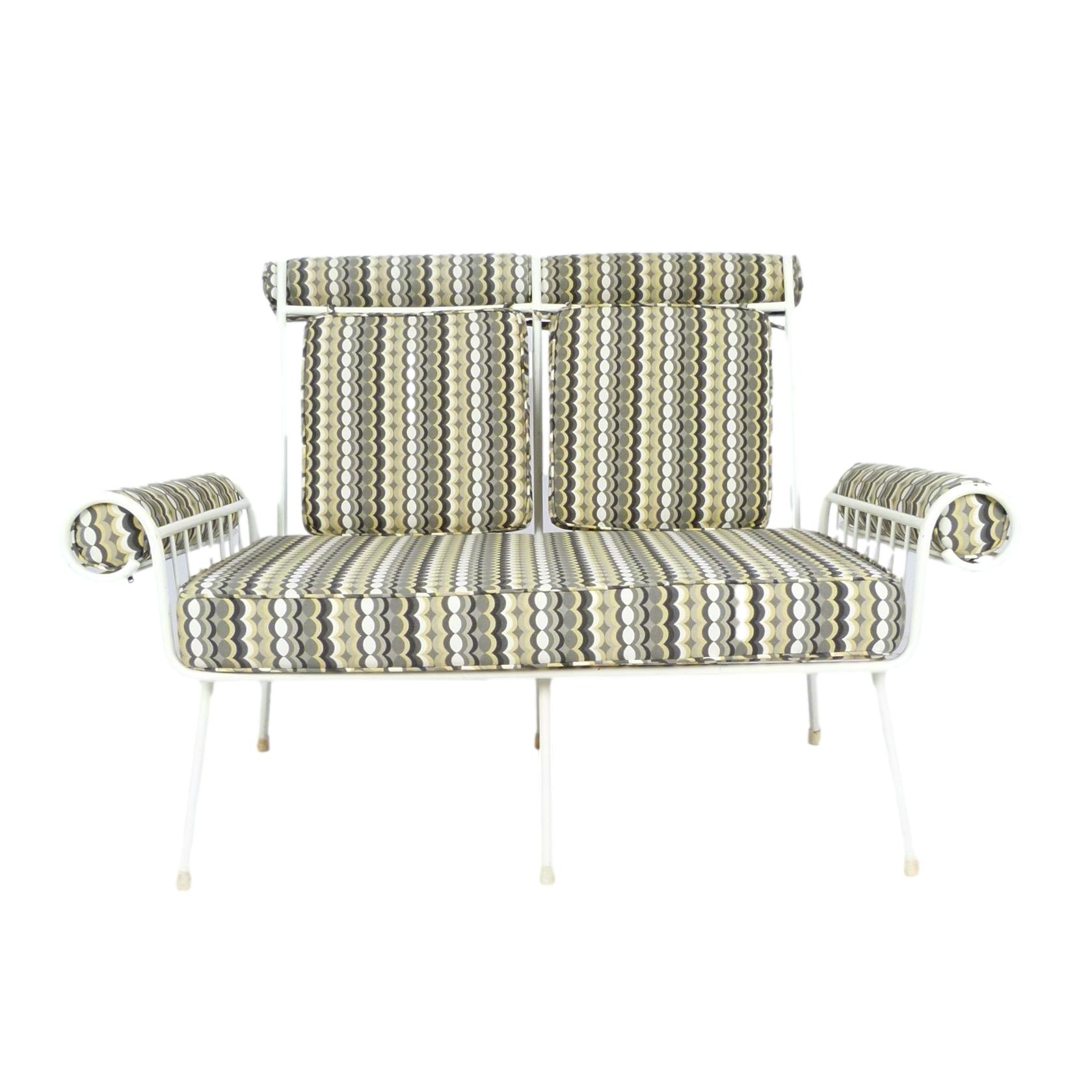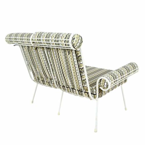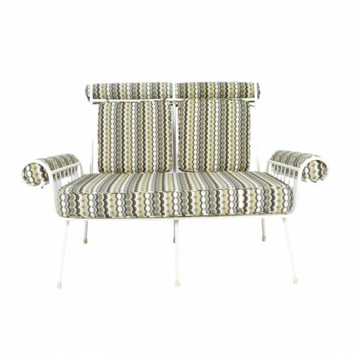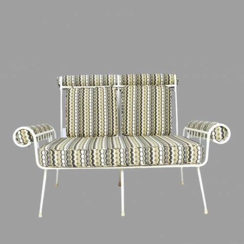 1960s enameled wrought iron settee with recently reupholstered weather-proof cushions. Perfect for a covered porch or patio. Matching coffee table and set of 4 arms chairs also available. Provenance: Palm Springs.