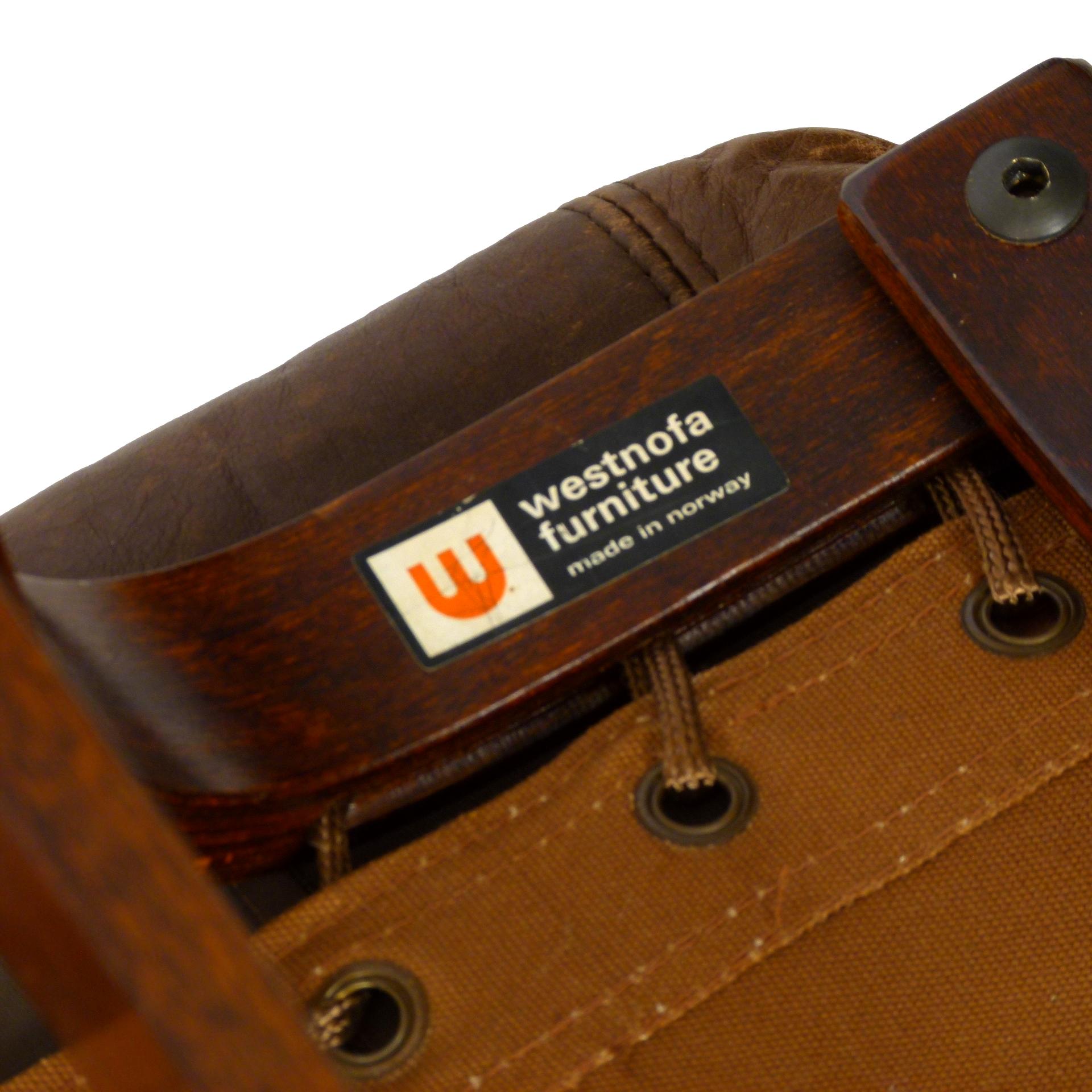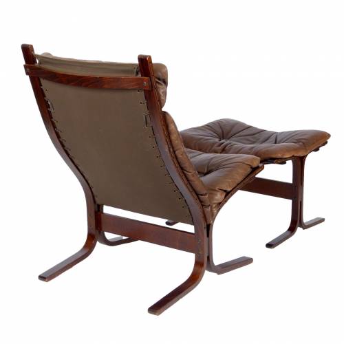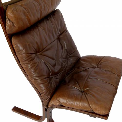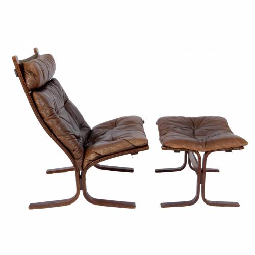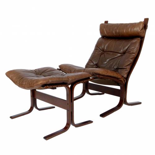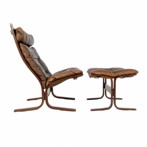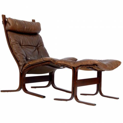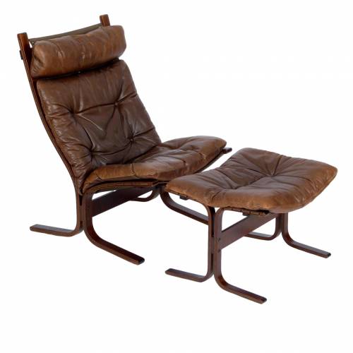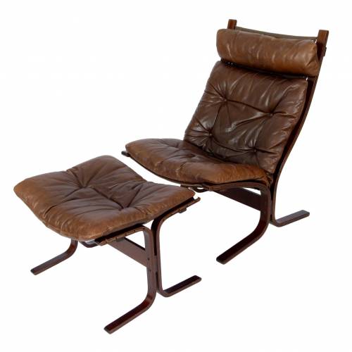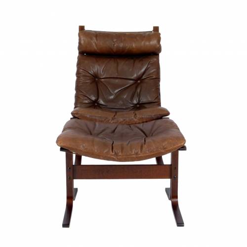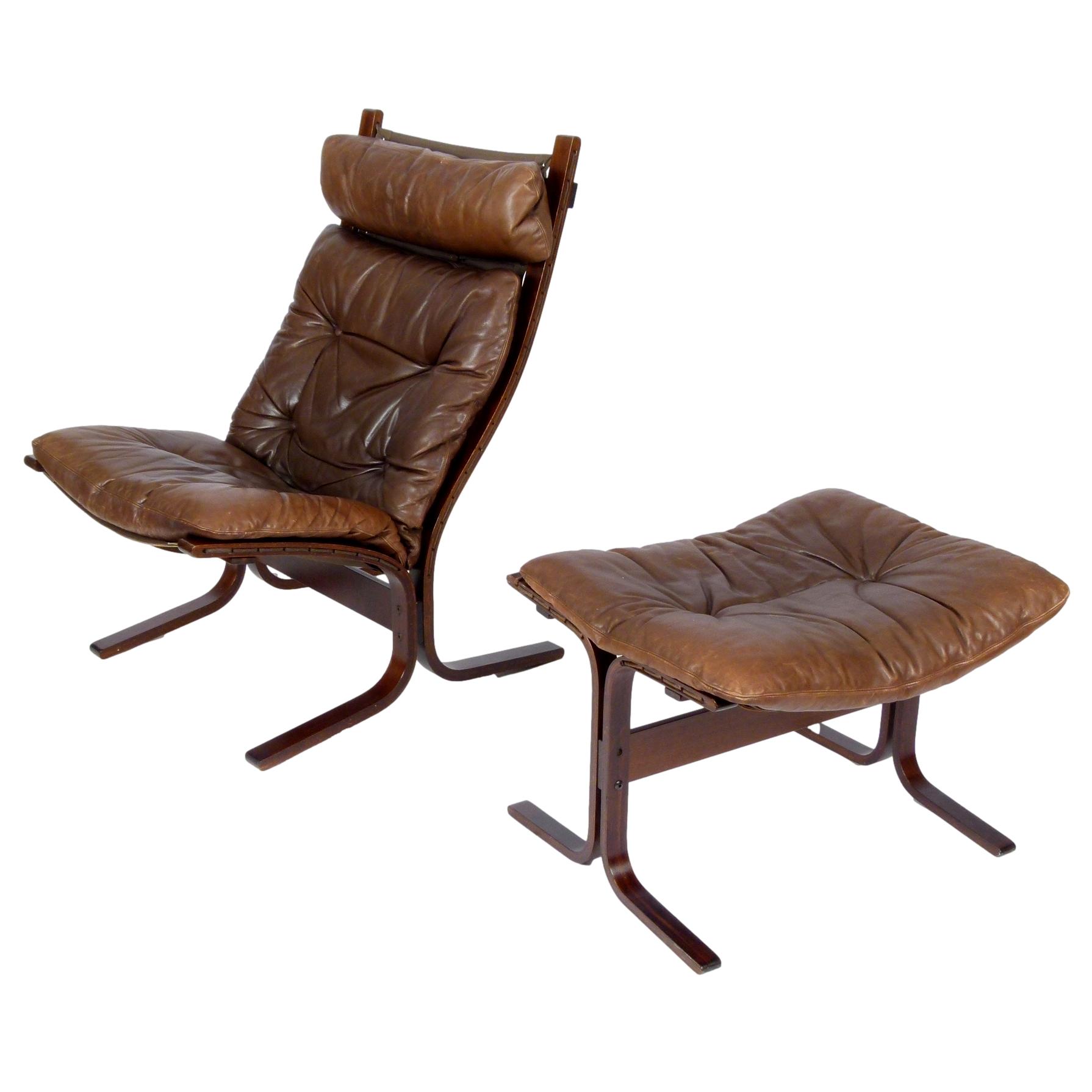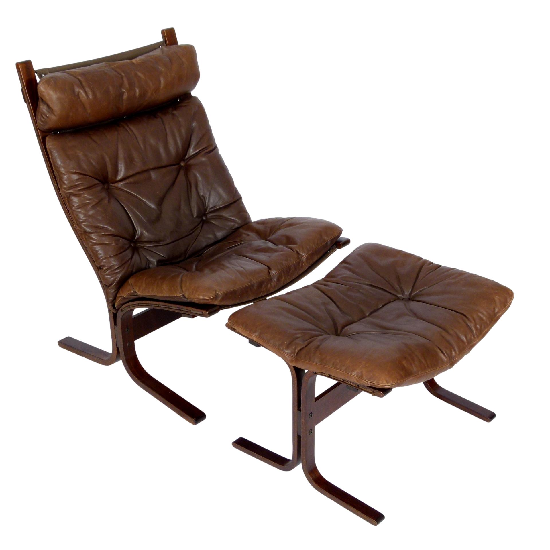 High back "Siesta" brown leather lounge and ottoman designed by Ingmar Relling for Westnofa, made in Norway.