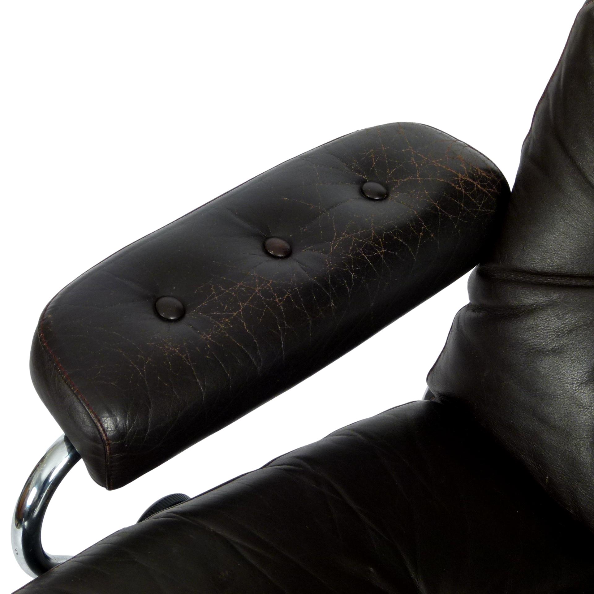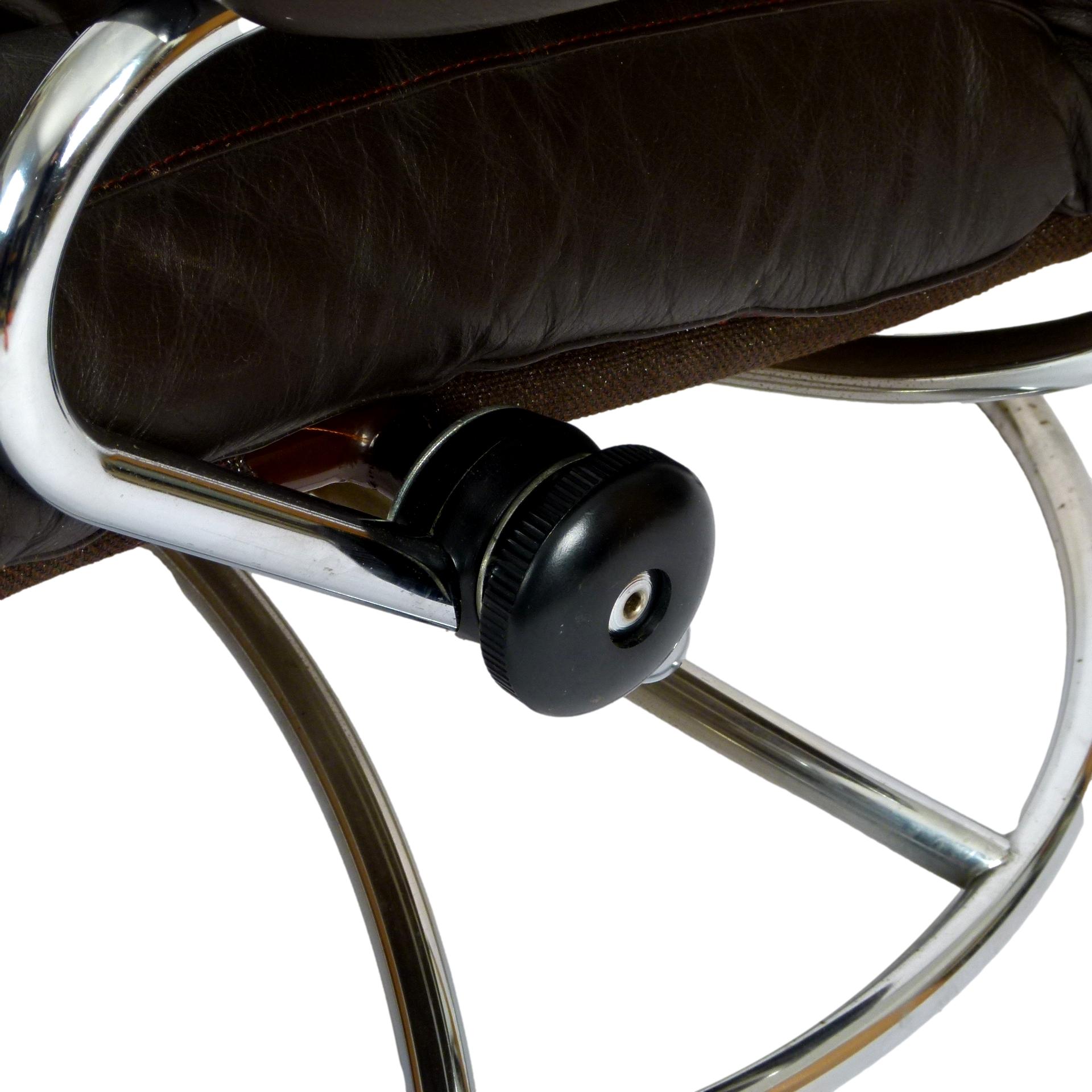 1970s Ekornes "Stressless" reclining lounge chair and ottoman in rich deep brown leather with chrome bases, Norway.