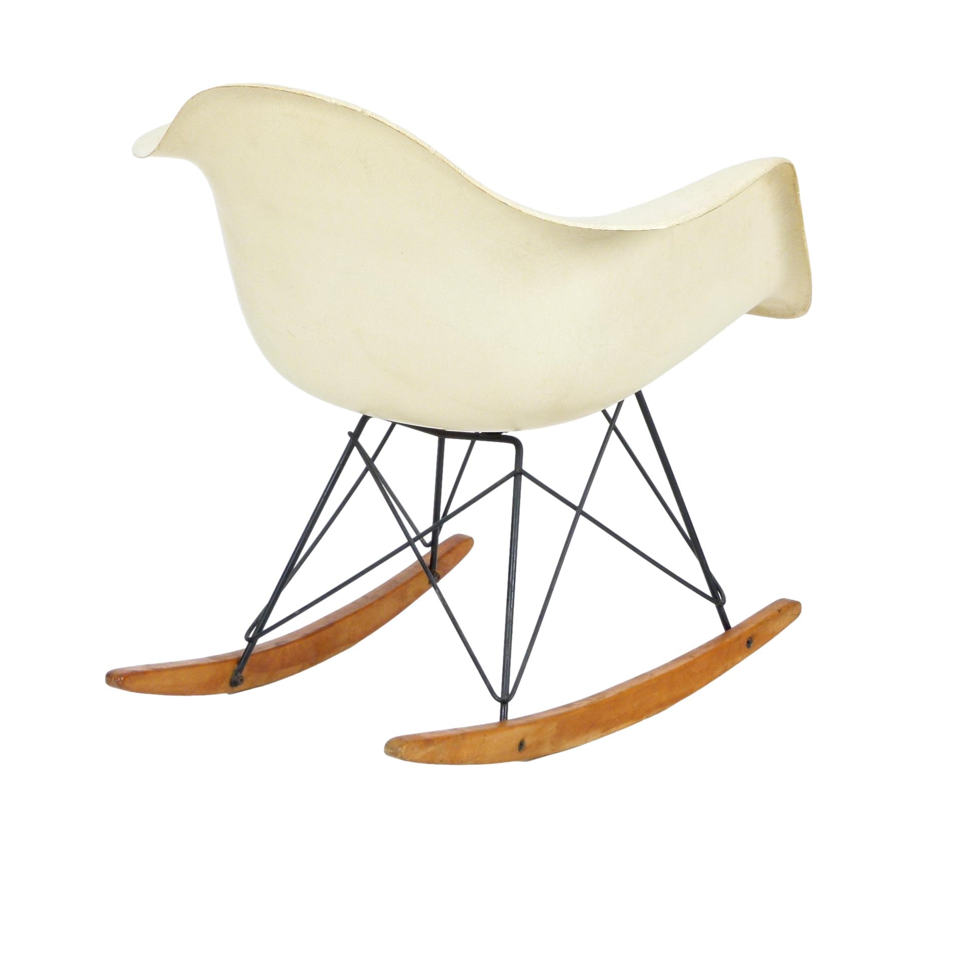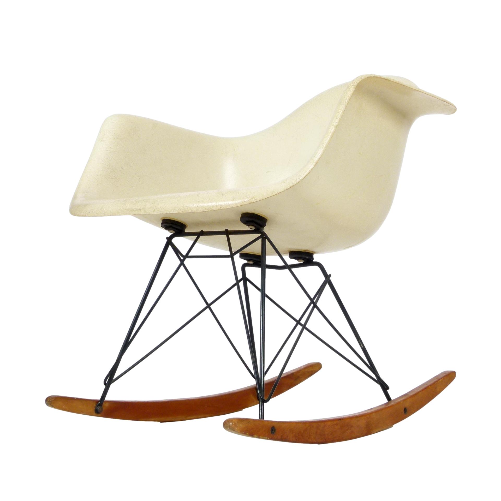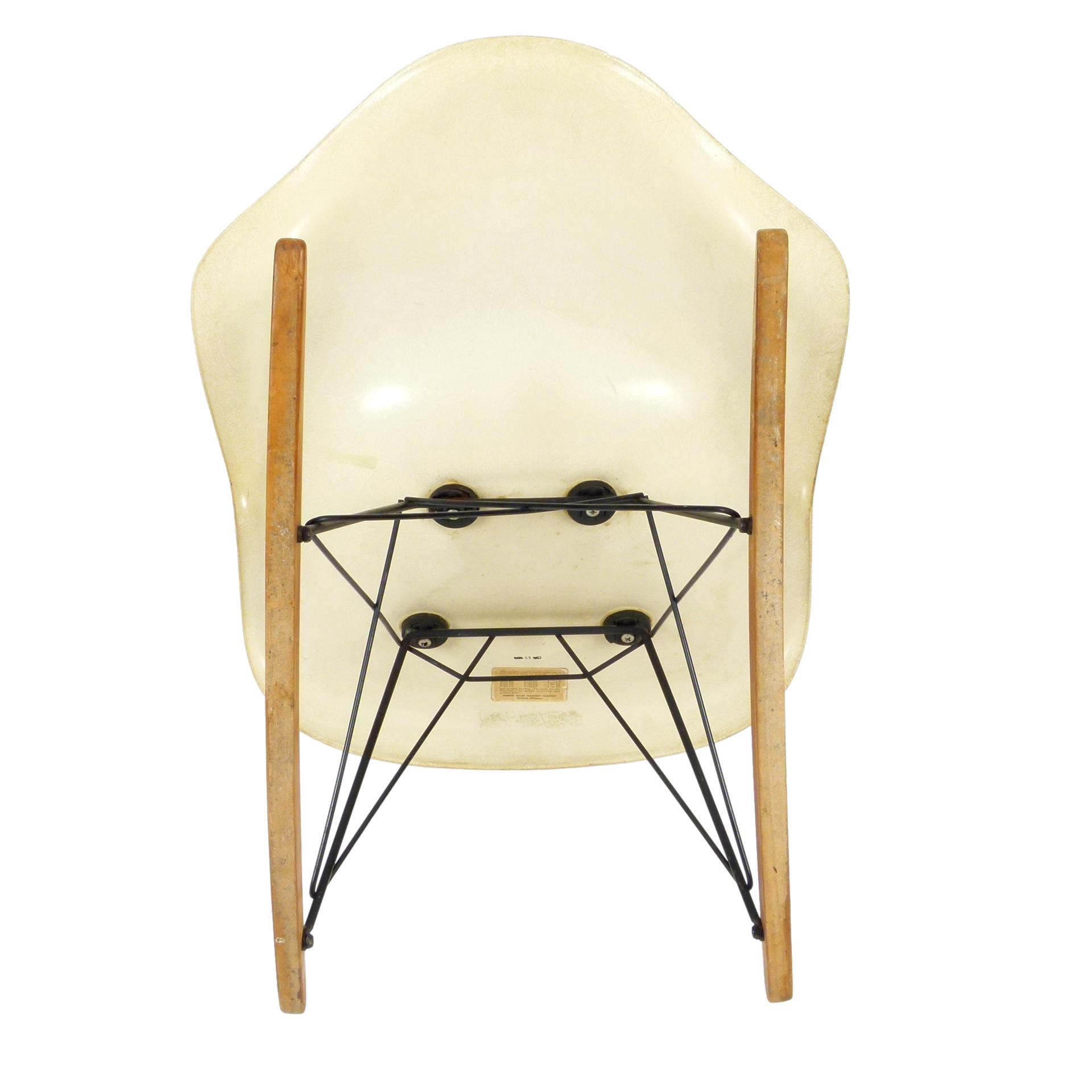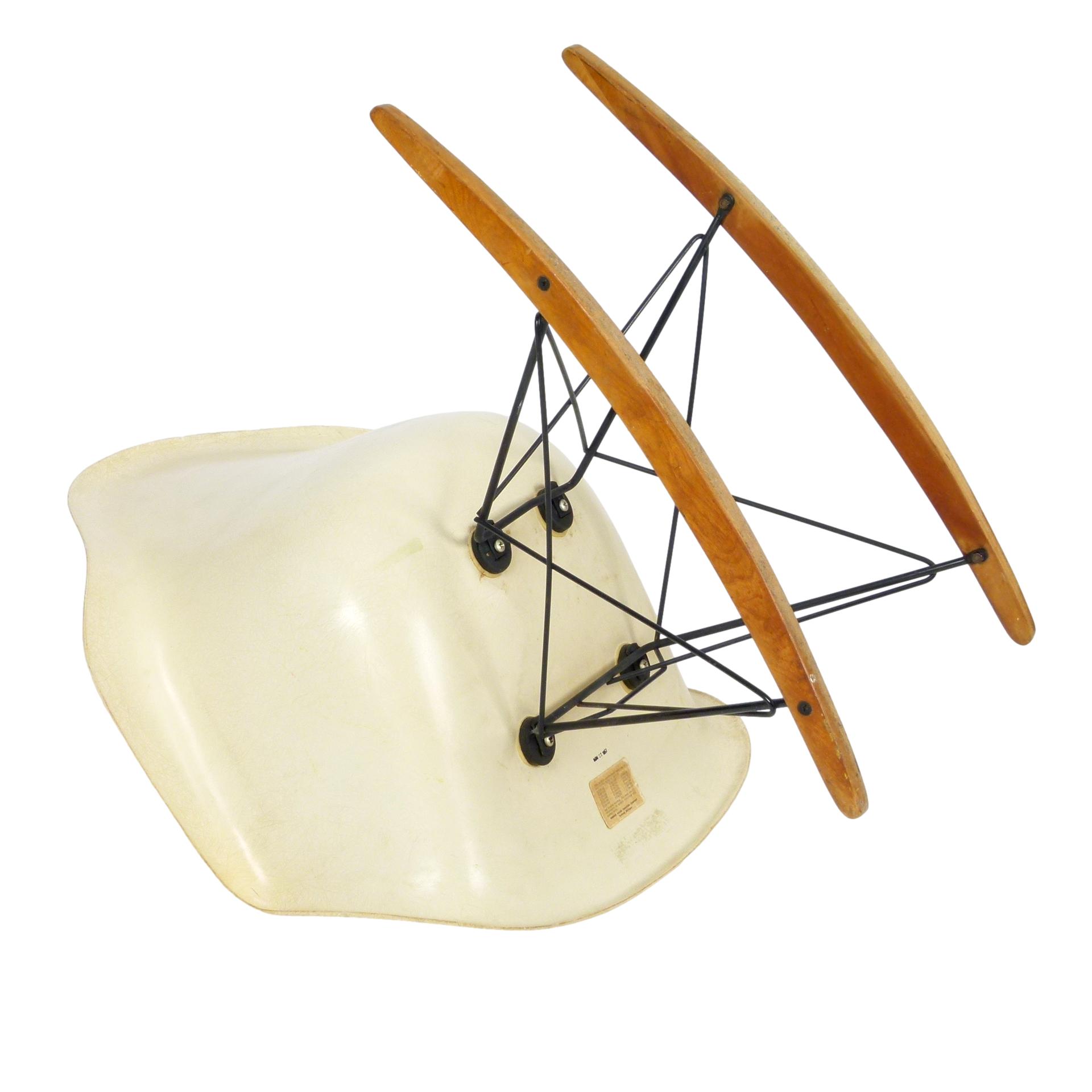 Eames armshell on original rocker base designed for Herman Miller. Retains original Herman Miller label as well as 1957 date stamp.